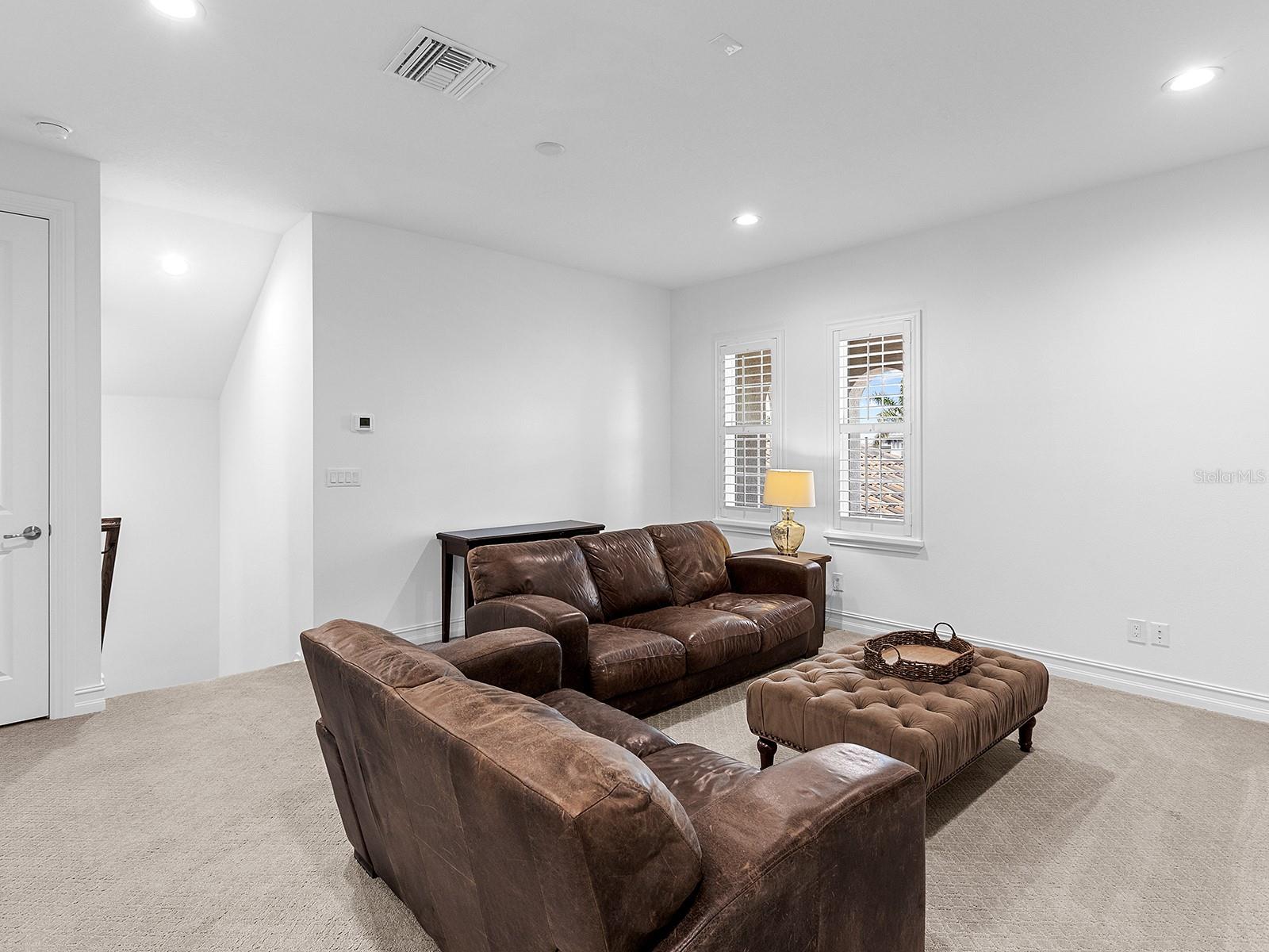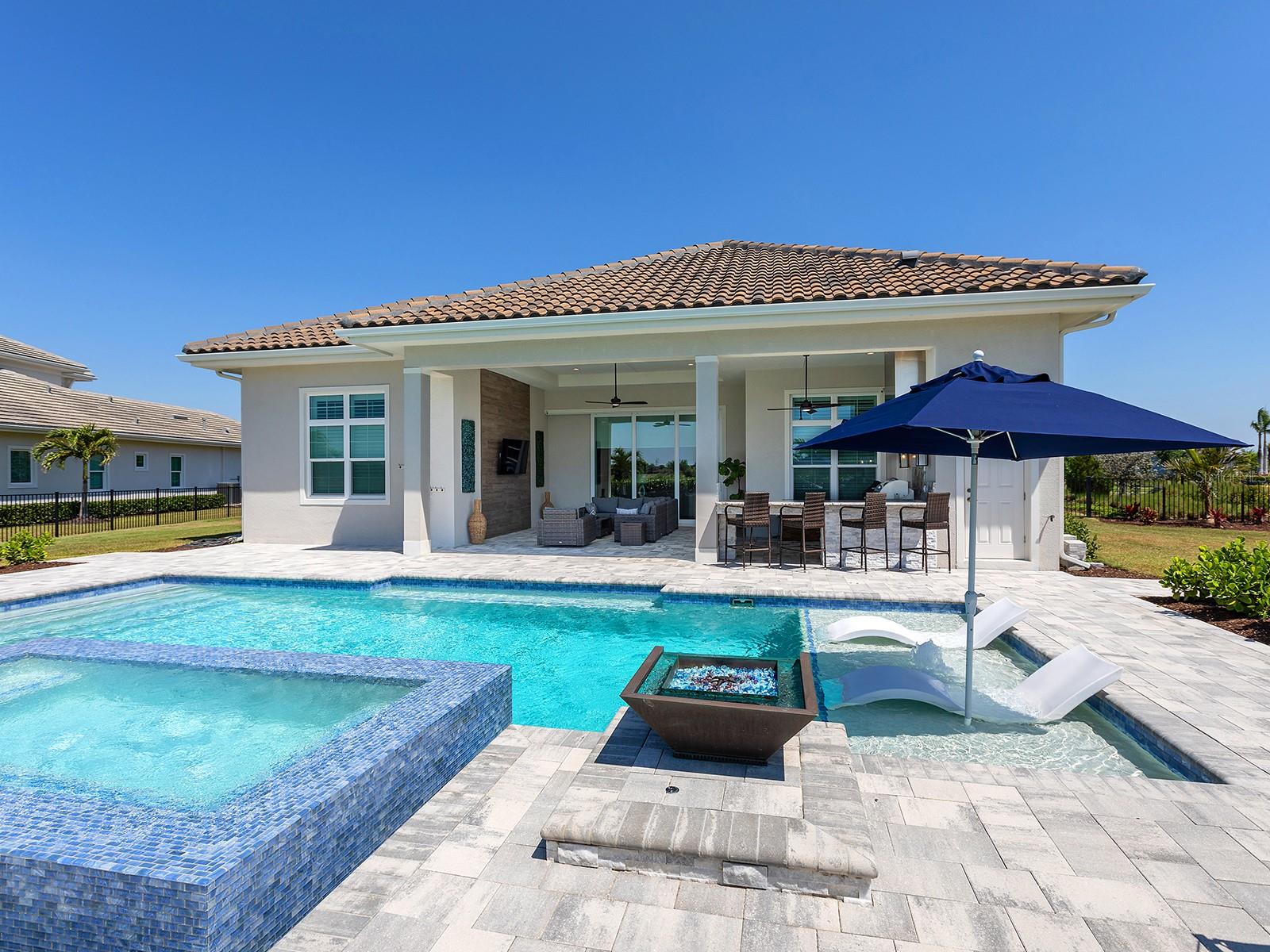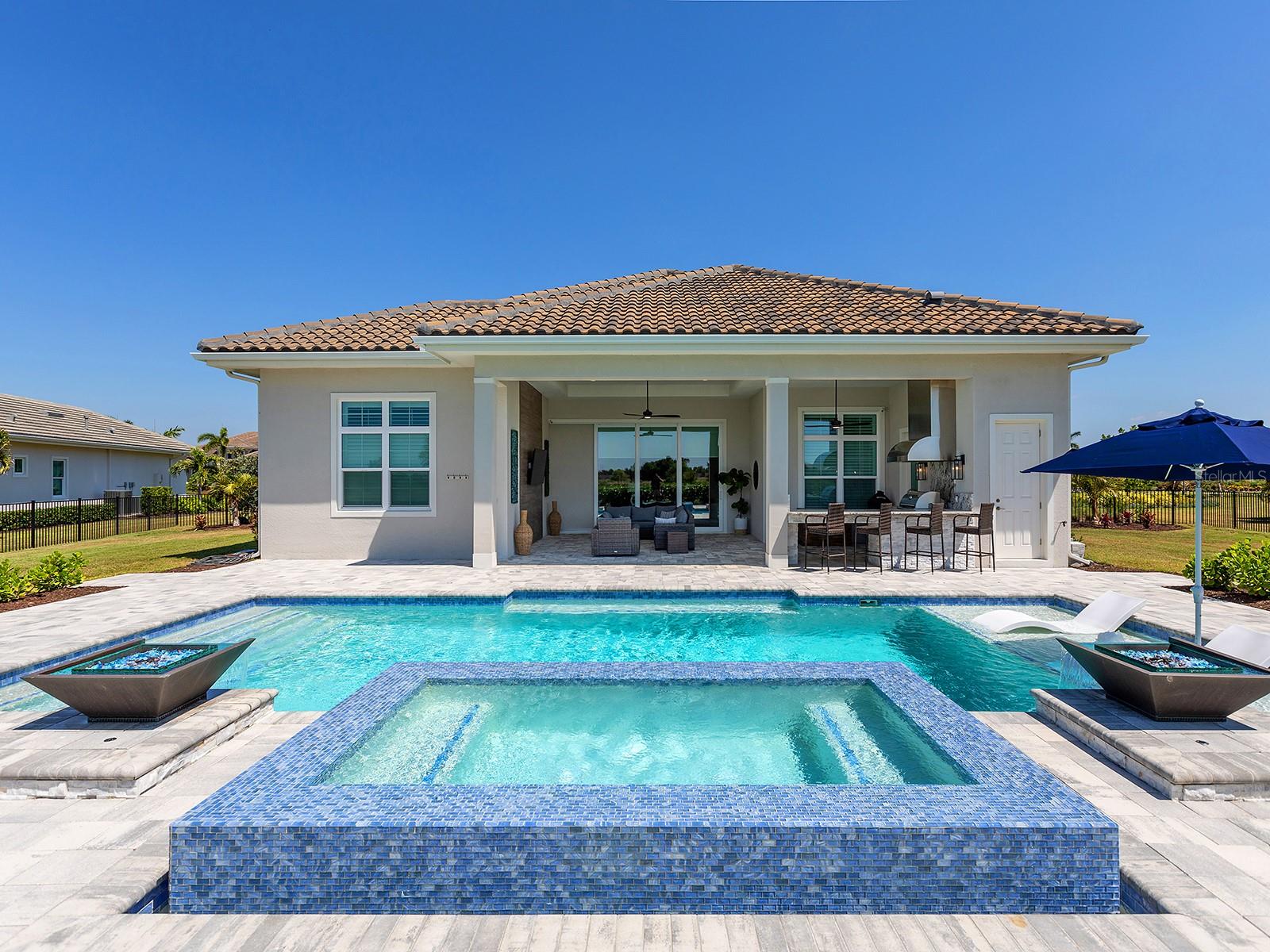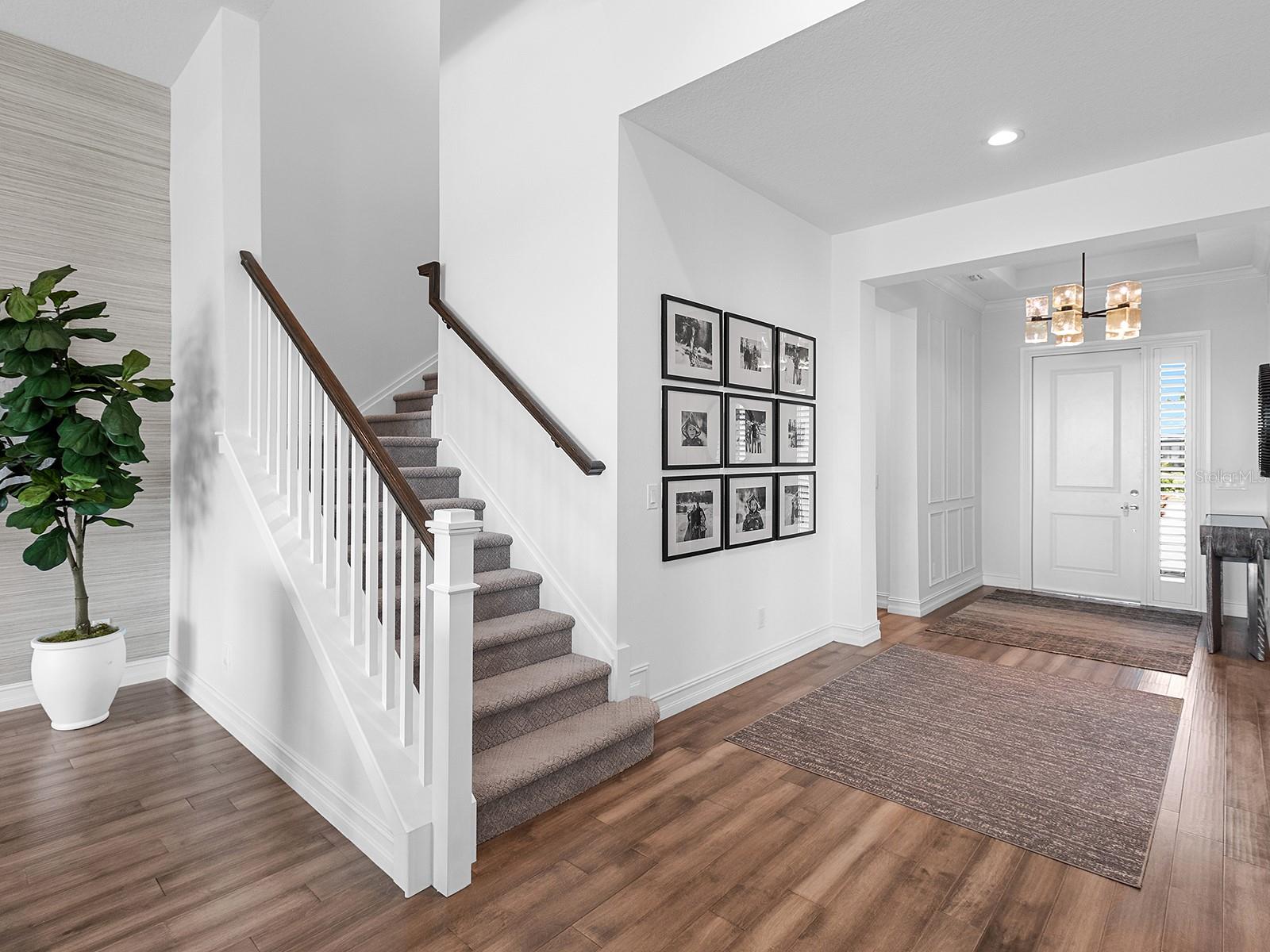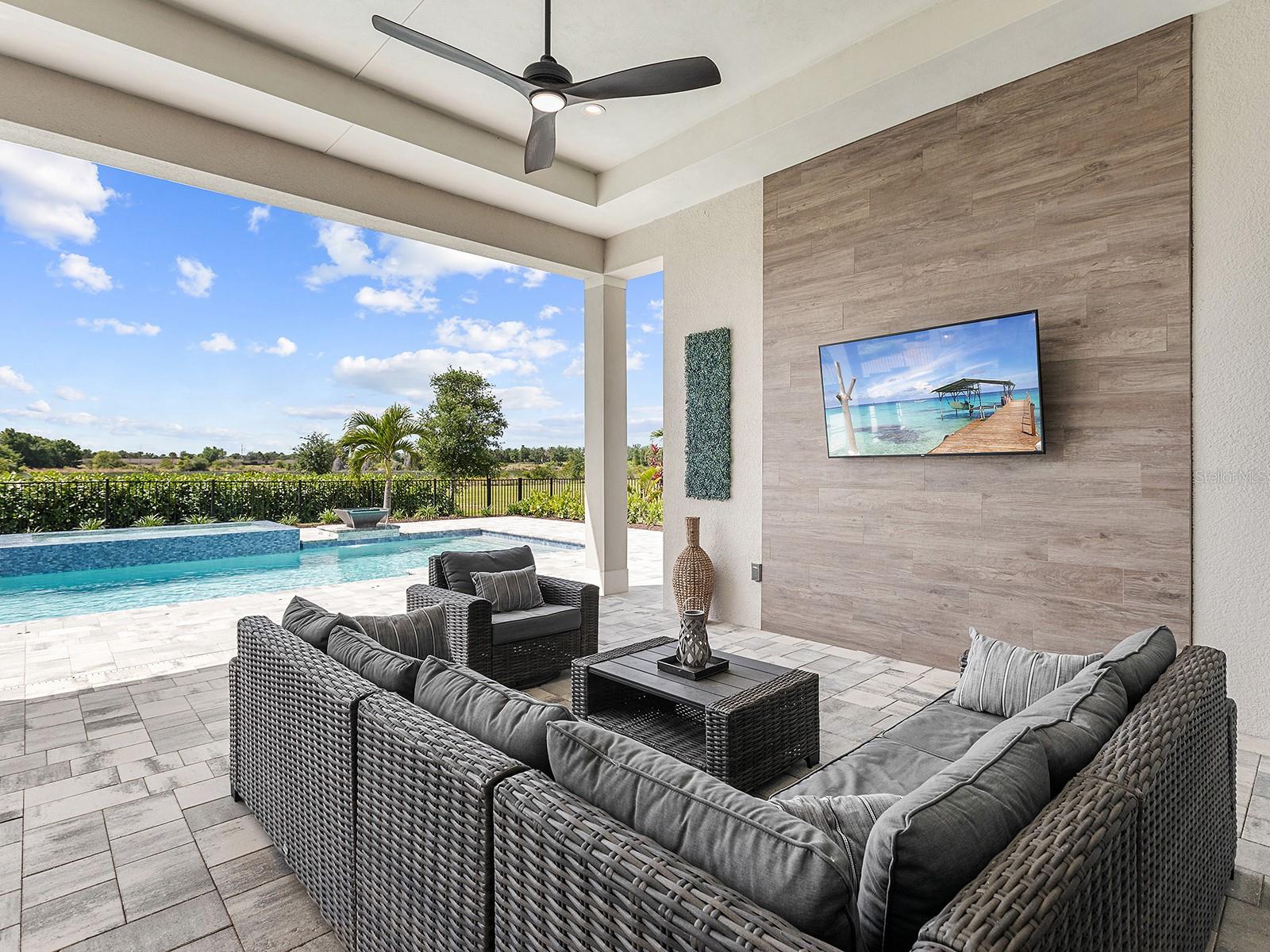 This is an exceptional residence tucked within the gates of Lakewood Ranch's exclusive community, The Lake Club. With its elegant Eaton Grand III floor plan, this 2021-built estate offers effortless luxury. The home's stately curb appeal sets the tone from the moment you arrive, with a side-load three-car garage, oversized paver driveway and manicured landscaping. Step through the front door into a soaring foyer adorned with accent trim, crown molding and a designer chandelier. Throughout the home, rich engineered hardwood flooring, plantation shutters, and sophisticated finishes speak to the care and detail poured into every room. The great room is an expansive space framed by a wallpaper accent wall and a striking linear fireplace with herringbone shiplap and a wood mantel. Pocketing sliders disappear to connect indoor-outdoor living. The kitchen boasts stainless steel KitchenAid appliances, including a five-burner gas cooktop with a statement hood and built-in oven and microwave/convection, granite countertops, stone backsplash and abundant cabinetry with under-cabinet lighting. A generous pantry cabinet, a lazy Susan corner cabinet, and an oversized island create ease for daily routines and entertaining. Just off the kitchen, the dining area is flooded with natural light from two large windows and elevated by a designer chandelier. Secluded in its own wing, the primary suite is a private retreat featuring an alcove entry, shiplap accent walls, a sitting area and two custom walk-in closets with thoughtful built-ins. The en-suite bath is complete with dual vanities, a soaking tub, a walk-in shower and a private water closet. Three additional bedrooms provide comfort and flexibility. One guest suite includes a private bath, while two more share a full bath in a cleverly designed pocketed guest wing. A quiet office, accessible through French doors, offers the perfect space for a home office or library. Upstairs, the loft offers versatile bonus space while an adjacent fitness room, or potential fourth bedroom, features three large windows and a spacious closet. A full bath with quartz-topped vanity and tub/shower completes the upper level. Step out to the lanai and enjoy a covered seating area centered around a custom media wall. The fully equipped summer kitchen includes a built-in Blaze grill, sink, mini refrigerator and granite countertops. The saltwater pool and spa await with blue tile accents, LED lighting, waterfall bowls with fire features and a sun shelf. A dedicated pool bath with quartz vanity and tile floors adds ease, and the included sauna invites relaxation. A brand new pool and lanai screen was installed July 2025. The fenced yard, bordered by mature landscaping, creates peace of mind for pets or children. Additional features include a well-appointed laundry room with granite counters and ample cabinetry, a large storage space under the stairs and a spacious three-car garage. In The Lake Club, residents enjoy access to a wealth of amenities, including two resort-style heated pools, a recently renovated clubhouse with fine dining and bar area, a fitness center, spa, tennis courts, pickleball, a playground, dog park, and services of a full-time concierge and activities director. Additionally, residents are near The Mall at UTC, LWR Main Street, Waterside Place and dining options. Experience luxury living in this home, where every detail has been carefully considered to provide the ultimate Lakewood Ranch lifestyle.