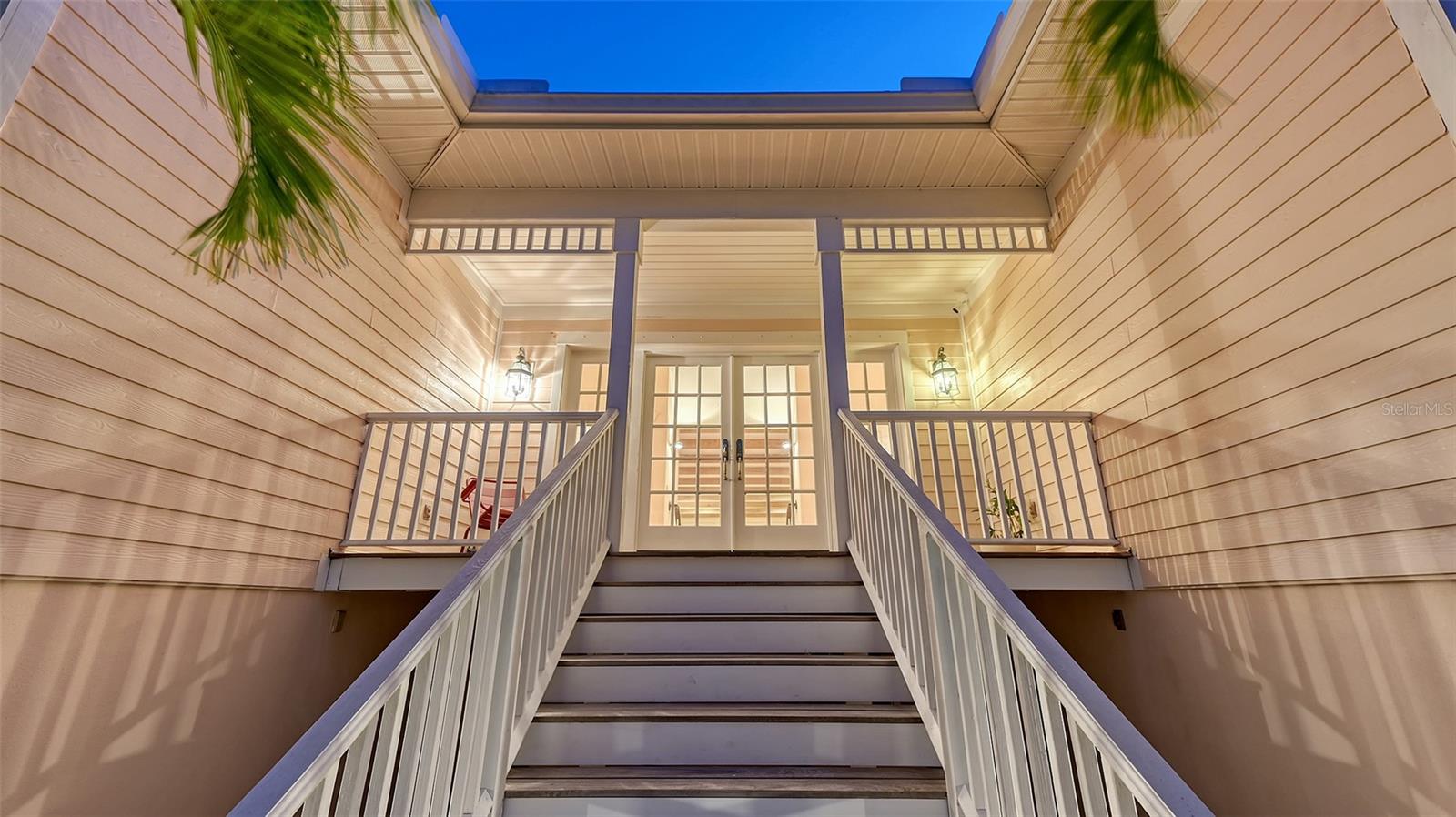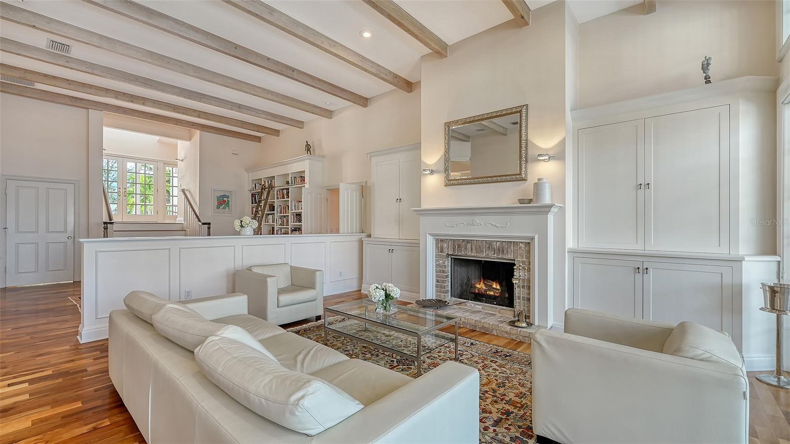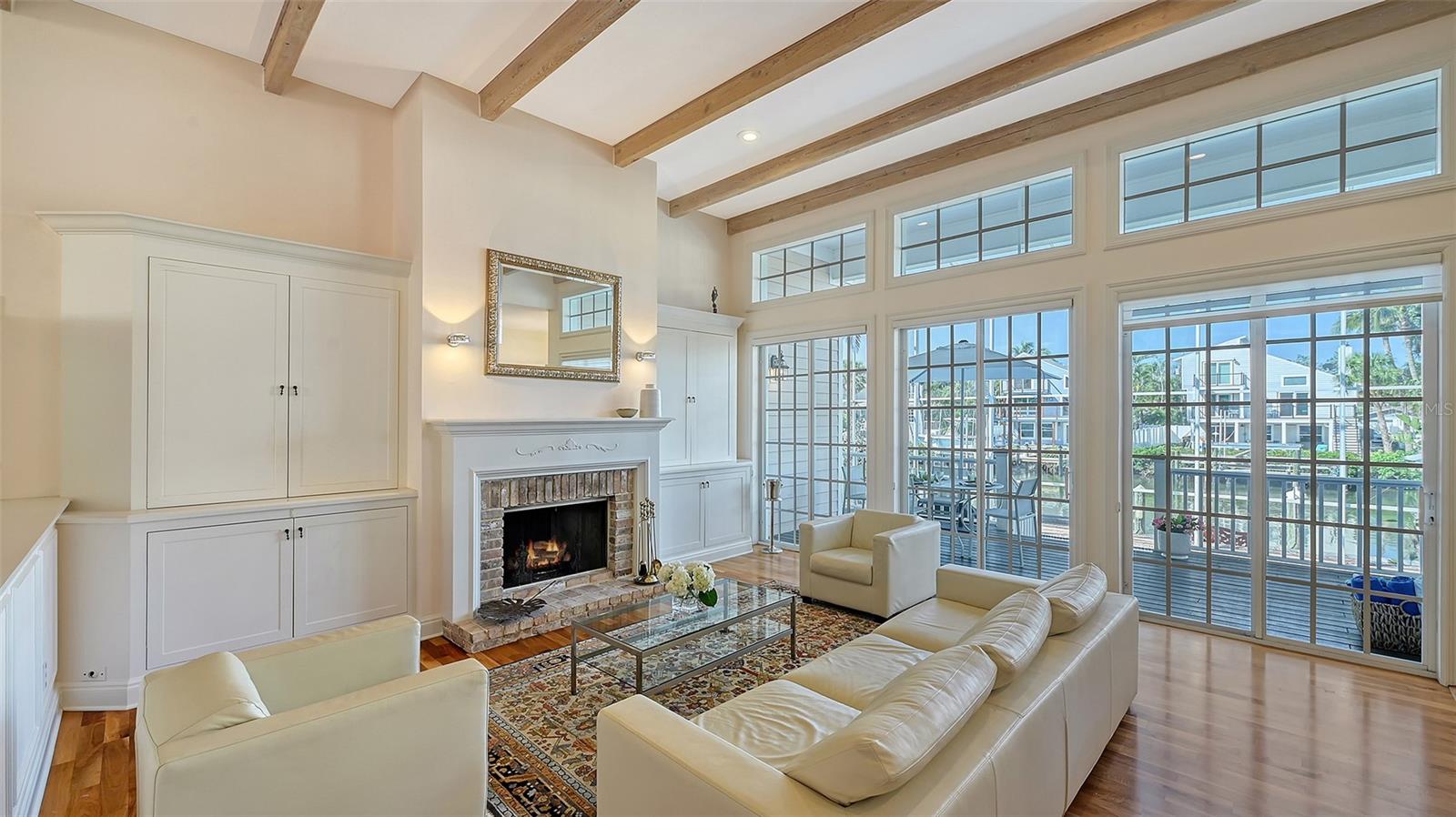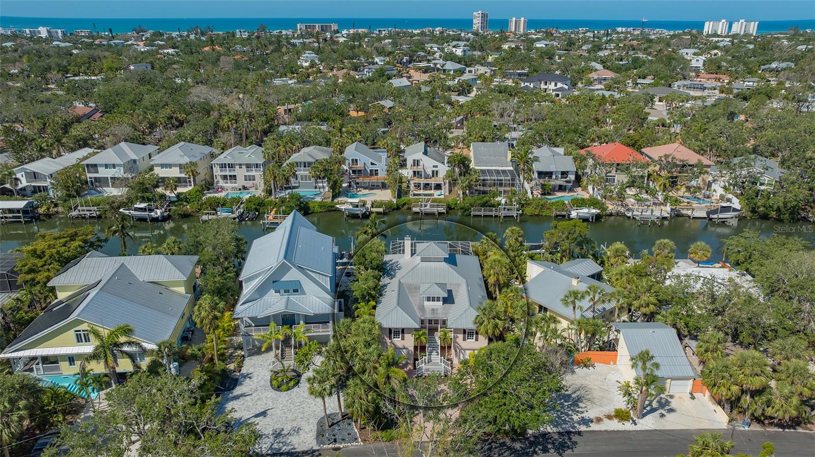 Nestled in the quaint neighborhood along the Grand Canal on Siesta Key, this Key West style home offers the perfect blend of old-world charm and modern living. This exceptionally well-appointed custom-built home is being offered turnkey. The home's grand entrance welcomes you through a covered porch that leads to an oversized foyer. You are greeted with a spectacular open floor plan, where an abundance of natural light, beautiful canal views, soaring ceilings and gleaming hardwood floors create a bright and airy atmosphere throughout. You will then be charmed by the library with a sliding ladder, wood burning fireplace, walnut wood flooring, and cedar beams in the living room, all combined with modern style furniture. The open living area includes a kitchen, with cherry wood cabinets, and an Iron Elmira stove surrounded by Chicago brick, gorgeous dining room and a breakfast nook. Floor to ceiling windows and sliding doors seamlessly connect the grand living area to the outside covered deck, perfect for entertaining. The beautiful primary suite with canal views is on the main level and two generously sized bedrooms with their en-suite bathrooms are located on the upper level. A "basement room" between the two garages offers a huge amount of storage with built-in closets and cabinets. The house was not affected by any wind or flood damage thanks to its solid concrete block construction and 11ft elevation of living space. Some water intrusion on garage level, but did not cause any damage to building, or cabinets in storage area between the garages. The fenced-in backyard features a 35ft screened heated pool with a waterfall and Chicago brick deck. The 60ft IPE hardwood boat dock with a tropical over-the-water gazebo is equipped with a 10,000lb boat lift and offers plenty of space for all your outdoor toys. Boating just one mile through the deep-water canal brings you to the Intercoastal Waterway which leads right out into the open Gulf. In a market where quality counts more than ever, this home offers a rare blend of location, craftsmanship, and timeless appeal. Welcome home to Siesta Key - island living, breath-taking sunsets, boating and award-winning beaches, all at your doorstep.