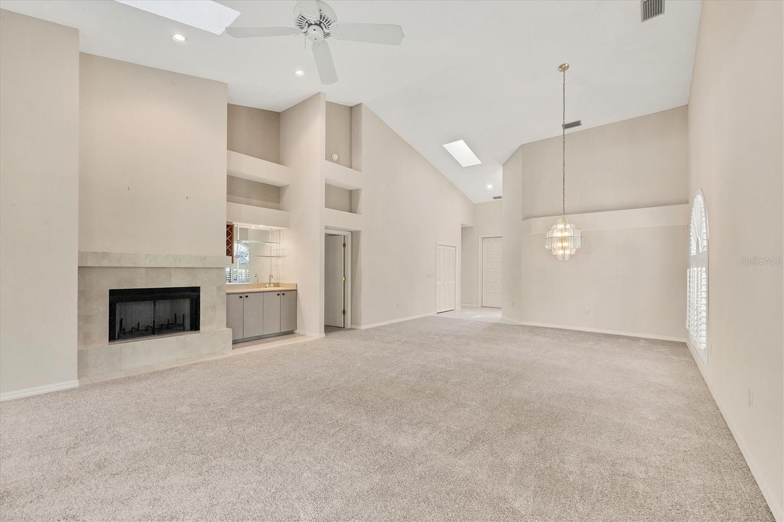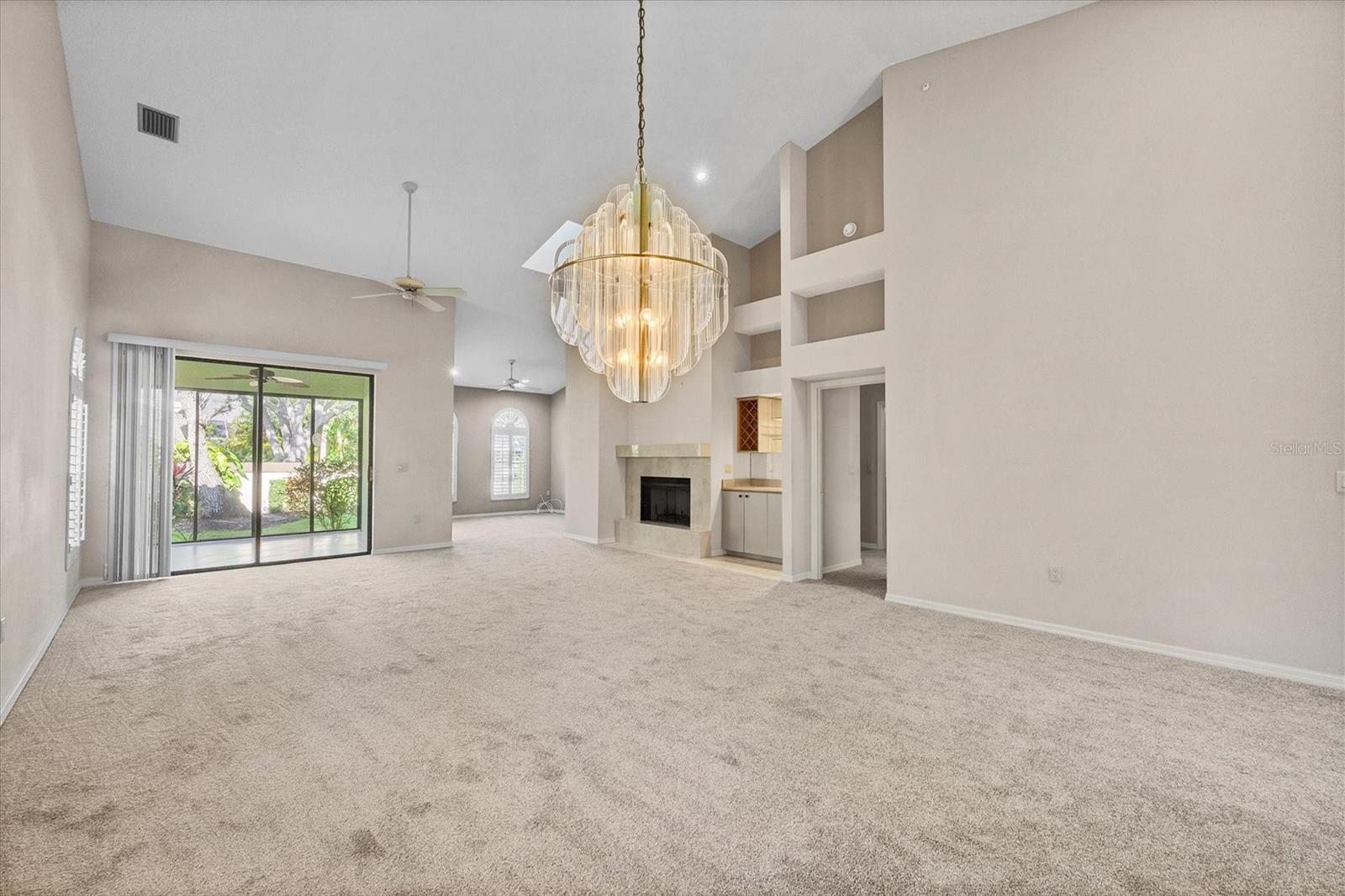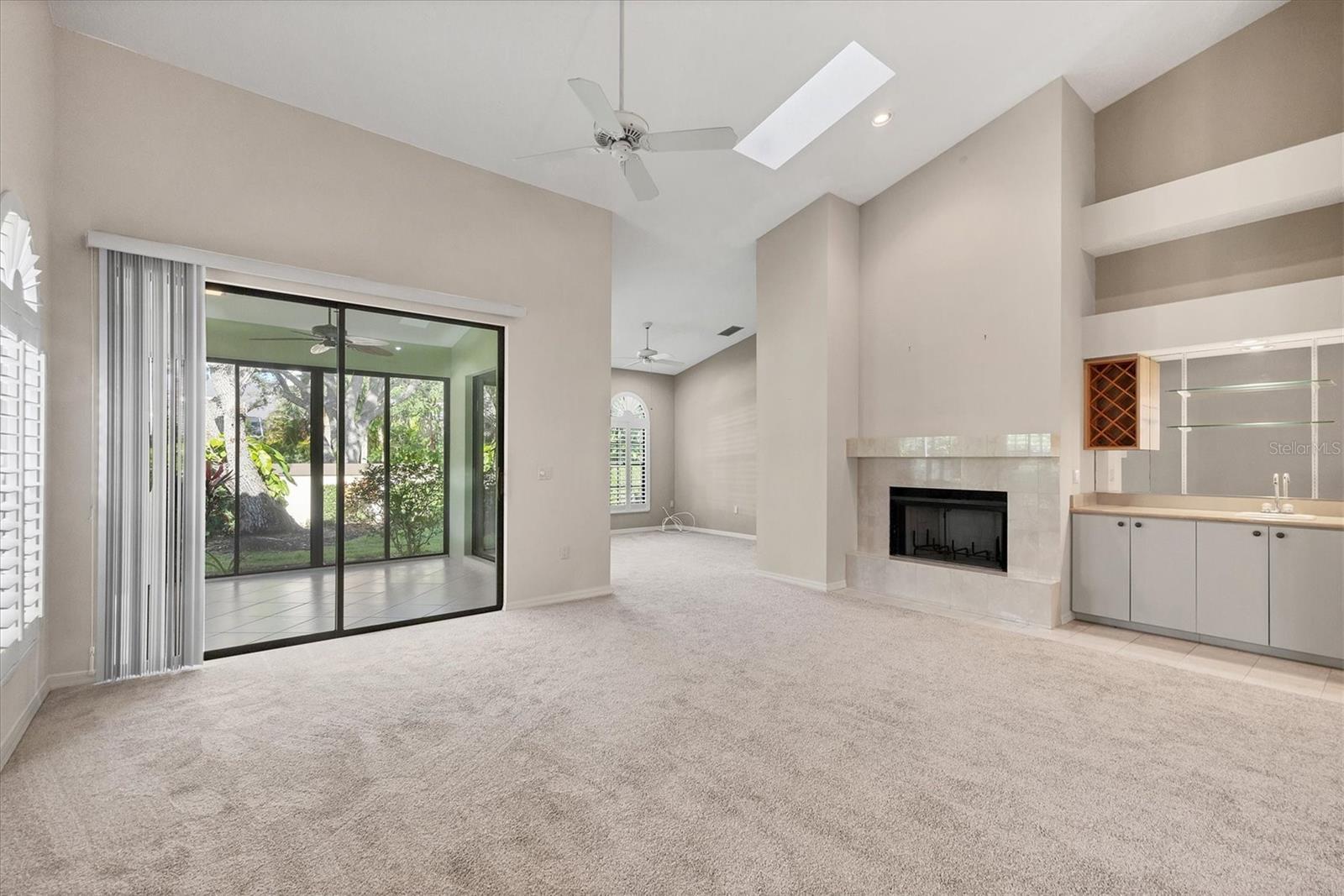 One or more photo(s) has been virtually staged. Virtually Staged. This 2-Bedroom, 2-Bath villa is the best price and is your best opportunity to live in Prestancia, a prestigious gated country club community that is home to an exceptional TPC golf course in Palmer Ranch. The spacious living area features a wood-burning fireplace and built-in wet bar with new skylights and vaulted ceiling providing natural light. Adjoining the living area is another room with built-in shelves that can be used as an office, den or library. Sliding doors lead to a spacious lanai perfect for relaxing. The thoughtfully designed kitchen has been updated with new cabinetry and quartz countertops. A charming eat-in area flooded with natural light, breakfast bar, and dedicated desk space provide convenience and versatility. The owners suite features a walk-in closet, a large bathroom with linen closet, soaking tub, separate walk-in shower, dual sinks, a built-in vanity area with plenty of counter space, cabinets and drawers. There is a second bedroom separate from the primary and another full bath. There is a large separate laundry room with utility sink, cabinets and additional walk-in storage closet. The villa is located near the large community pool and hot tub. The oversized 2 car side entry garage also has an extended driveway. An added Bonus is the new roof, gutters, skylights, chimney cap, soffits, carpet and air conditioner. The new owner will benefit from those recent improvements. The Prestancia community offers more than just a home...it provides a lifestyle. Explore the Audubon-sanctioned wildlife sanctuary, winding walking paths with views of the wildlife, trees, lakes and the golf course. If you're a golf enthusiast, take advantage of the two 18-hole golf courses available with optional membership. Prefer the beach? The world-renowned Siesta Key Beach is just miles away. An avid biker Legacy trail is close by.