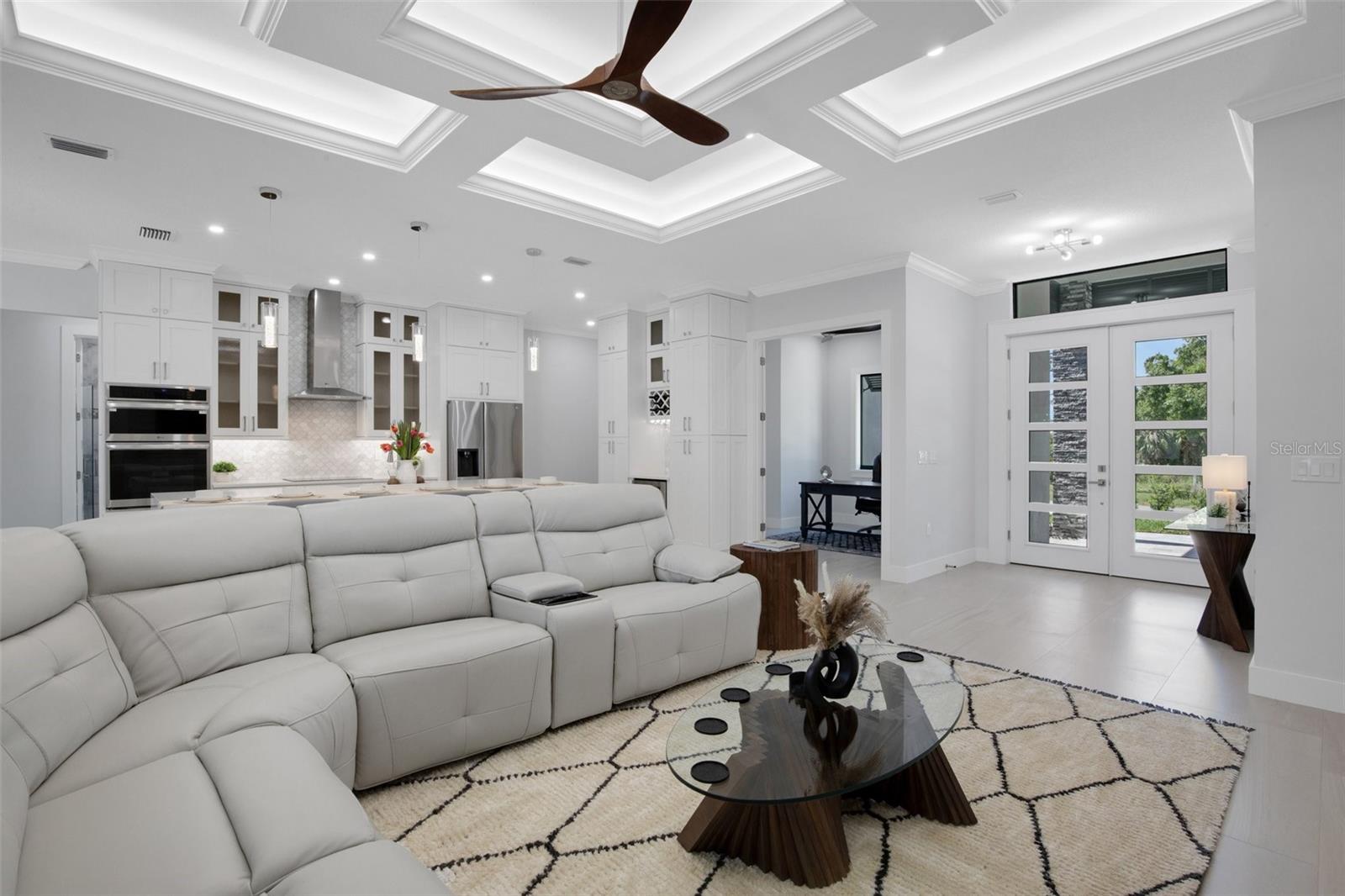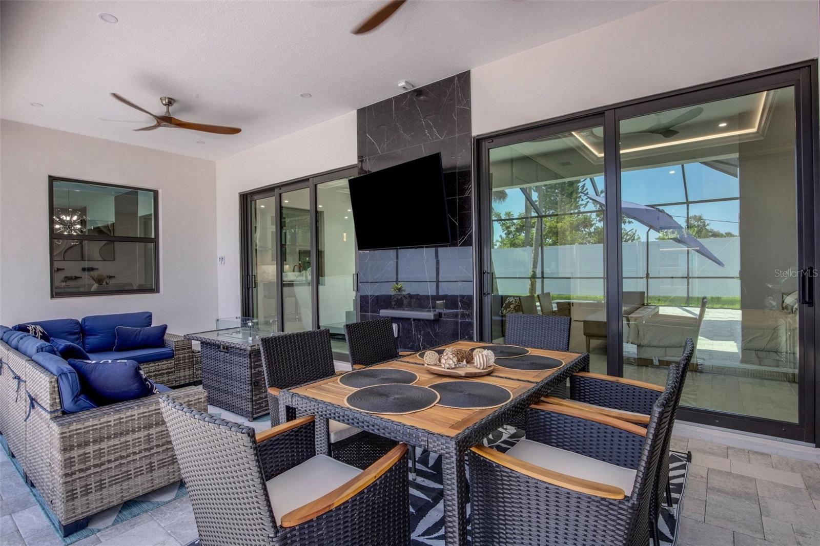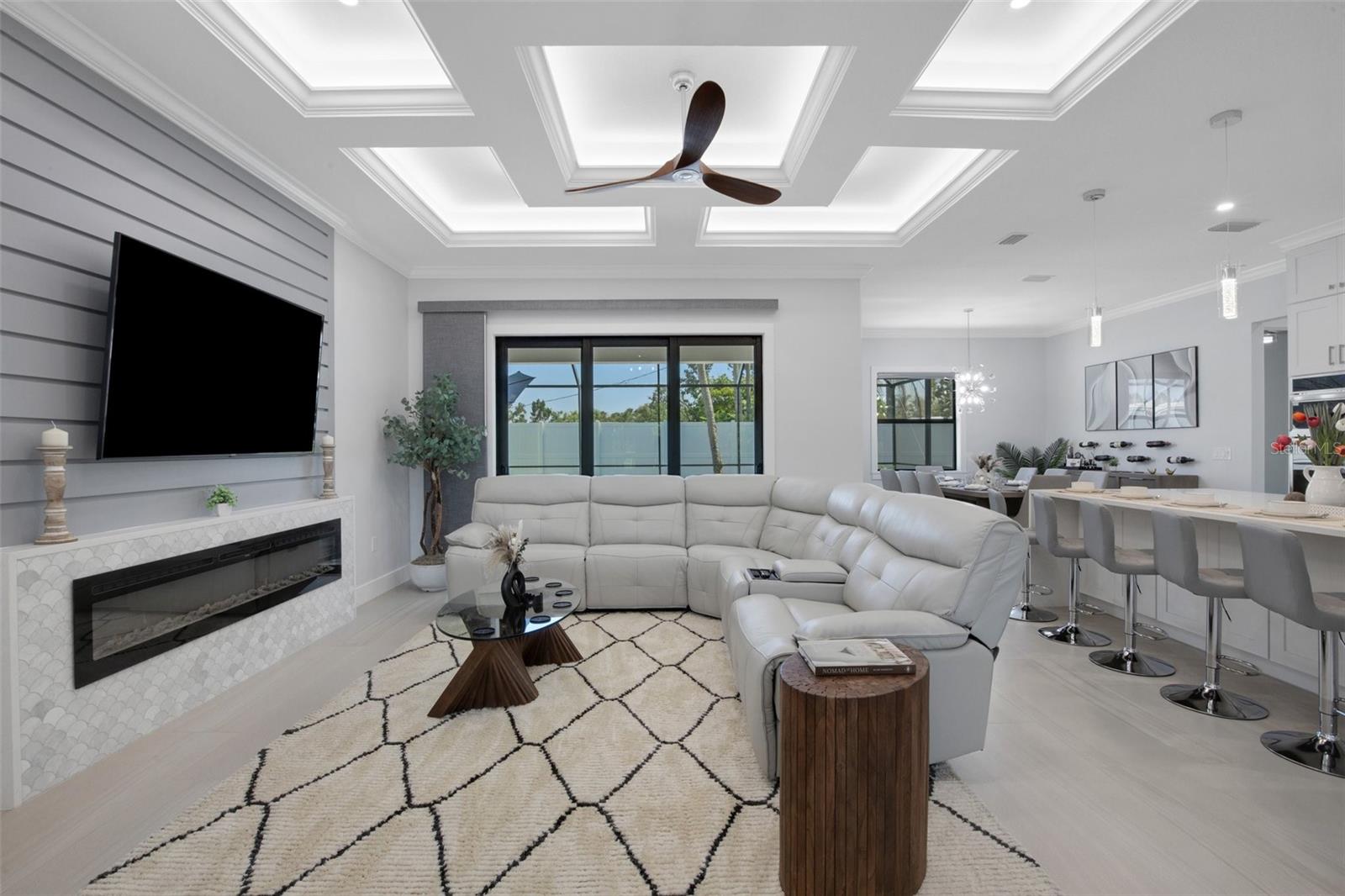 A true gem, new and never lived in. A very unique contemporary custom house with pool/spa built by a reputable local builder, right in the middle of everything - minutes to the beach (under 2 miles), downtown Venice, Pineview School and the new Memorial Hospital. Very hard to find upgrades and unsurpassed craftsmanship, to name a few: - 15 ft high outside entryway - front of the house decorated with natural quartzite stone and Bahamas shutters - double designer 8 ft door and matching interior 8 ft doors - open area complemented by 24x48 beach dune porcelain tile imported from Spain, inspired by Florida beaches - electric fireplace and decorative ceiling beams with LED lighting in living room - impact windows and sliding glass doors throughout - crown molding in open area and master suite - designer grade kitchen with ceiling height cabinetry, deluxe appliances and 10 ft x 6 ft island with waterfall sides - built-in wall oven and microwave - designer grade tile in master bath with LED niche, bench, standalone tub and multiple shower heads - 10 ft tall ceilings throughout - great outdoor space with St. Augustine grass, fenced in property for privacy - heated pool/spa with pool cage to be enjoyed year around for a true Florida lifestyle - great outdoor kitchen with sizeable, covered lanai just perfect for quiet evenings or large party entertainment - boat ramp across the street - very close proximity to Legacy Trail - very desirable X flood zone (no flood insurance coverage required) - great shopping, golfing, fishing, boating and everything else Florida has to offer - quiet and private street with no association restrictions and no CDD - very custom home (not a cookie cutter), unlike any others around This is the one to call home! All furniture, appliances and accents shown in the pictures convey with the house, including 2 large TV sets.