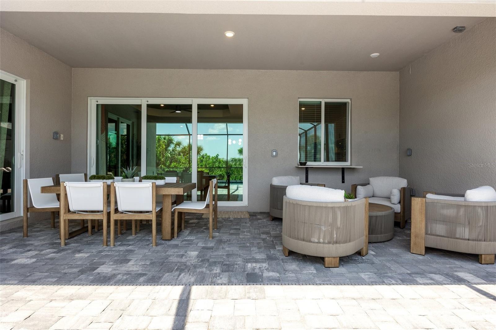 - Exterior: French Doors, Lighting, Rain Gutters, Sidewalk, Sliding Doors