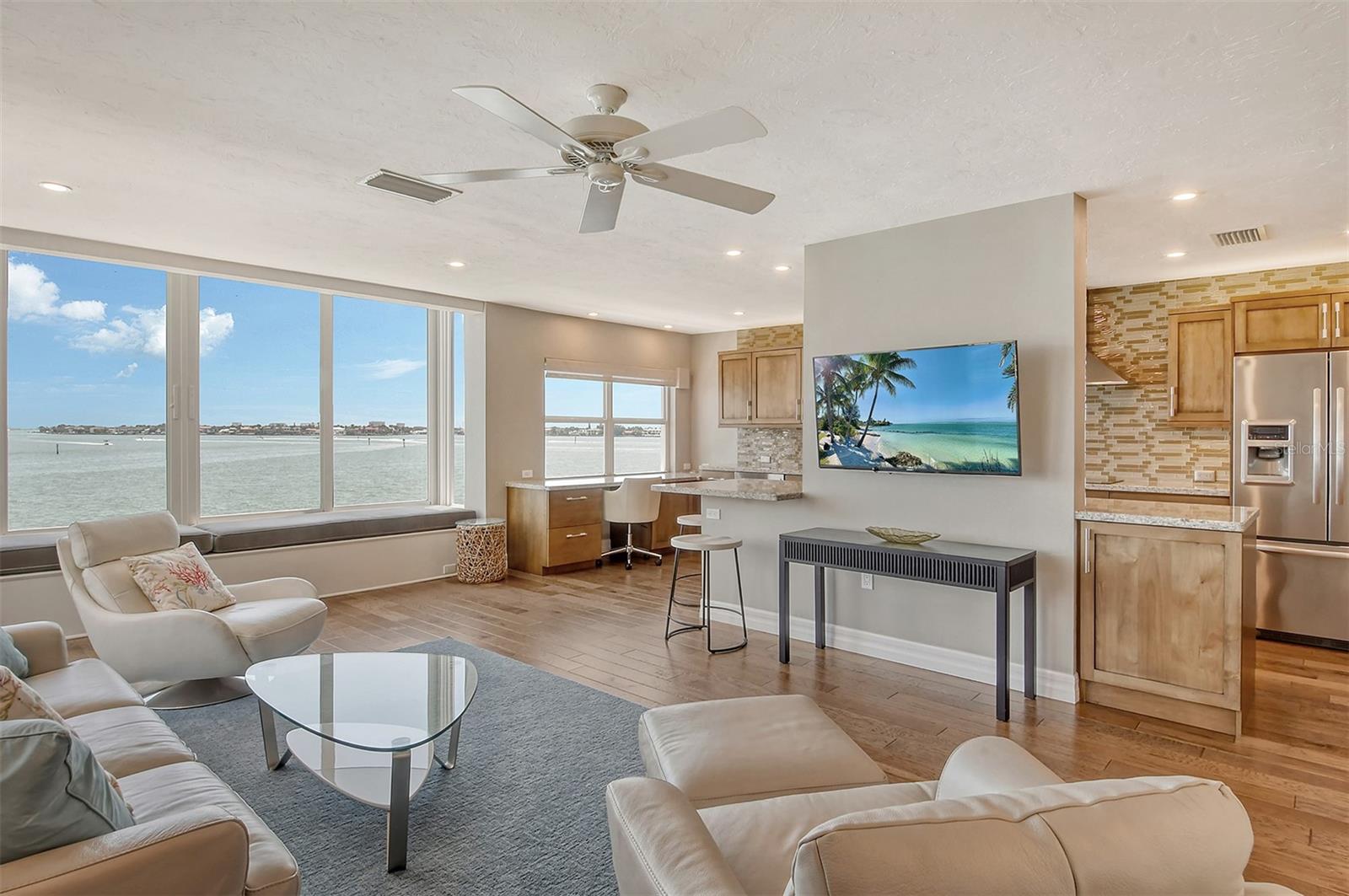 Experience Exquisite living at Harbor House South, where every moment is framed by breathtaking 180-degree Southerly views across Sarasota Bay. This stunning 3rd-floor, 2-bedroom, 2-bath end unit offers an expansive array of windows, the large one incorporates a cozy window seat that invites you to savor ever-changing vistas of the bay.From the privacy of your home, witness marine wildlife, yachts, and sailboats gliding by, all while enjoying the stunning daily show of sunrises and sunsets. Elegant and thoughtfully designed, this home boasts high-end finishes including porcelain tile, crown molding, plantation shutters, solid core doors, and spa-inspired bathrooms.Ideal for both entertaining and relaxation, the open and well-appointed floor plan features a spacious living and dining area, as well as a built-in office perfectly positioned to face the water. The chef's kitchen is a culinary dream with soft-close wood cabinets, quartz countertops, a state-of-the-art induction cooktop with stainless steel hood, a built-in convection oven, microwave, and a striking counter-to-ceiling glass-tiled accent wall.Perfectly situated near Marina Jack, the Ringling Bridge, and Downtown Sarasota, this private oasis is just minutes from everything Sarasota has available. Discover the perfect blend of luxury, privacy, and convenience. Add this exceptional residence to your must-have list today!