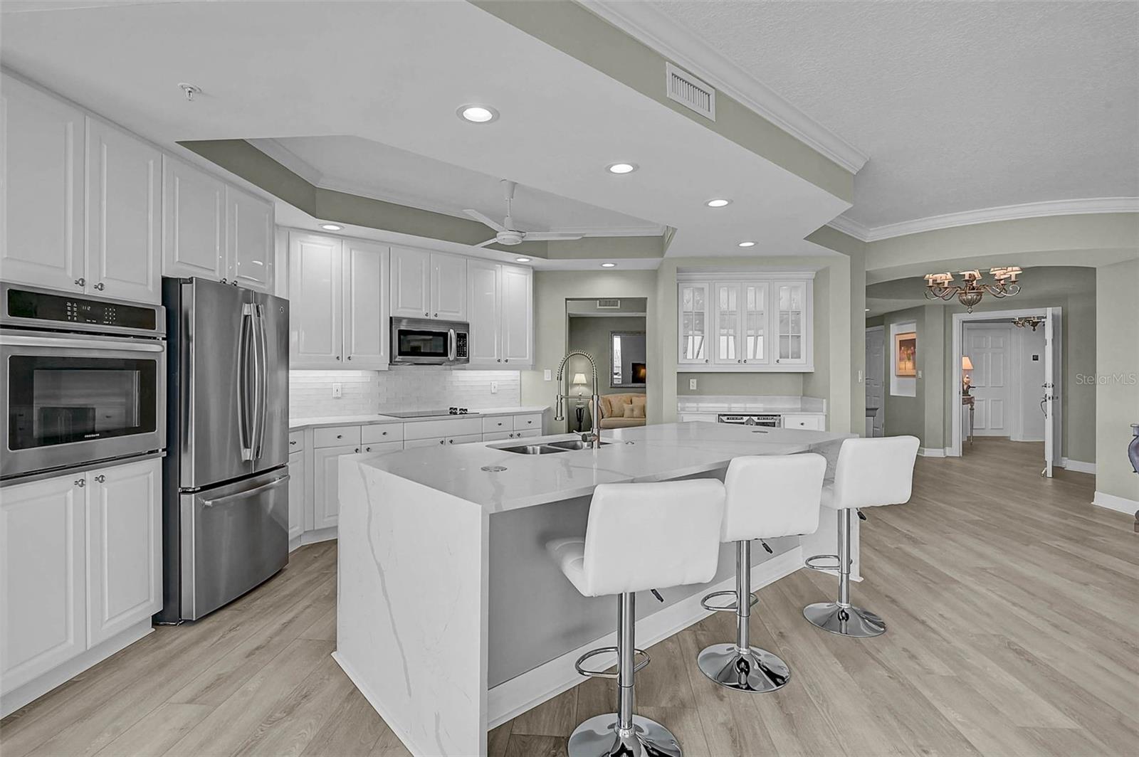 Under contract-accepting backup offers. **STUNNINGLY UPDATED CONDO with Breathtaking Water & Preserve Views that rival those of higher floors!** This LARGE, CORNER UNIT of nearly 2800sf features 3-Beds & 3 Full Baths PLUS Study/Den (or possible 4th Bedroom with Walk-In Closet) and 2 side-by-side Covered Parking Spaces near elevator, Etc. and is located behind the Secure Gates of the highly sought after Oaks-Preserve, Country Club neighborhood. As you emerge from your private elevator foyer entrance, you will be enthralled by the Stunning View of Little Sarasota Bay and the Gulf of Mexico. The brilliantly RENOVATED, Light and Bright interior boasts a spectacular Kitchen with large waterfall island with seating area, Quartz countertops and Newer Stainless-Steel appliances, while other premium features include Plantation and Hurricane Shutters, Luxury Vinyl Plank and tile flooring, Crown moldings, Updated bathrooms with Quartz counters, NEW HVAC (2025), etc. The Owner's Bedroom Suite features a Walk-in Closet, Custom Tiled Shower, Soaking Tub and Dual Vanities. The Spacious Balcony offers an ideal western exposure for enjoying gorgeous sunsets! Includes Climate-controlled Storage unit. This MERIDIAN I Condo Tower boasts a New Roof (2024) and New Elevators (2025 - in progress). Meridian Condo residents enjoy private amenities including Heated Pool & Spa, Fitness and Outdoor Grill in addition to The Oaks Club's main campus of amenities. THE OAKS is a distinguished, 24hr Guarded, Country Club Community which boasts many accolades including: Platinum Club of America, Emerald Club of the World, Elite Distinguished Club of the World and One of America's Healthiest Clubs - where amenities include Three Restaurants, Ballroom, Two 18-hole championship GOLF courses, award-winning RACQUETS program with 12 Har-Tru Hydro-Grid TENNIS courts, 4 PICKLEBALL Courts, wonderful CROQUET facility, state-of-the-art FITNESS center and junior Olympic, heated community SWIMMING POOL, Bocce, Basketball Court, Playground and more! The Oaks is just minutes from nationally ranked Pine View School, the Legacy Bike Trail, area Beaches and all that Gulf Coast living has to offer. Membership is required and there is NO WAITLIST for GOLF or SOCIAL Membership. **PLEASE ENJOY VIEWING the 3D VIRTUAL TOUR**