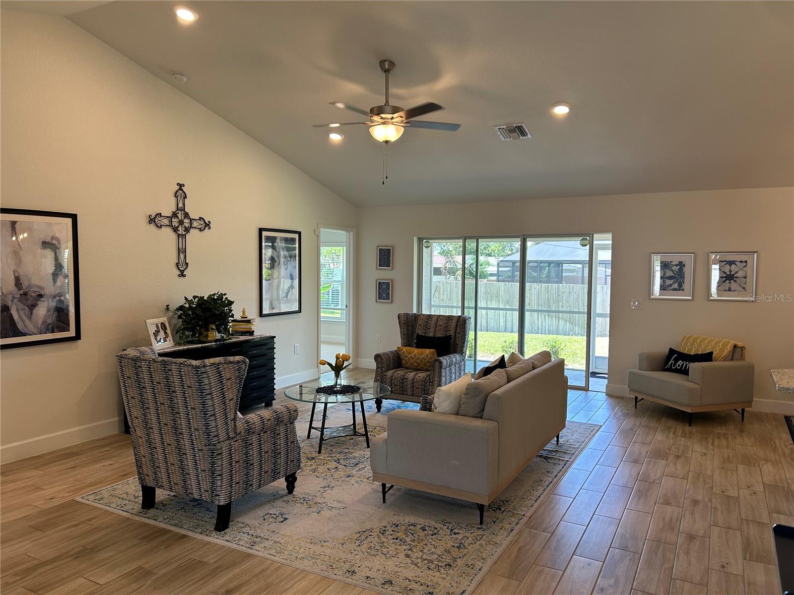 Model Home selling "As Is" with lots of upgrades! Welcome to this magnificent newly constructed home- 3 bedrooms and a den/study, two baths with a formal living room, sun room, and dining room. Nestled in a vibrant South Venice area, this home provides ample room for you, your family, and your guests to enjoy. Vaulted ceilings give this house spaciousness and an airy feel, creating a sense of grandeur in the living area, and allowing the natural light to make the space feel even larger and more inviting. Ceramic plank tile flooring throughout except in the bedrooms, designer LED recessed lighting, 36' upper cabinets with crown molding, granite countertops in the kitchen and baths, stainless steel appliances, double pane insulated tilt-in sash windows for energy efficiency. Some of the additional upgrades are screened in Lanai, circular driveway, side garage entrance, ceiling fan, window treatments, refrigerator, master bathroom window, master bedroom step ceiling, separate shower and tub in master bathroom, and stone accent on the exterior of the home. This property also comes with a 10-year structural warranty for peace of mind. Only $1000 down to secure this home today!