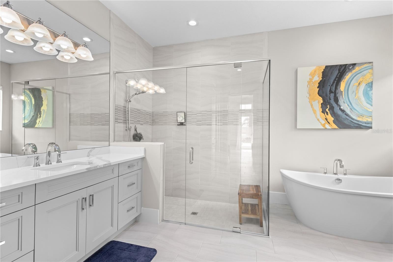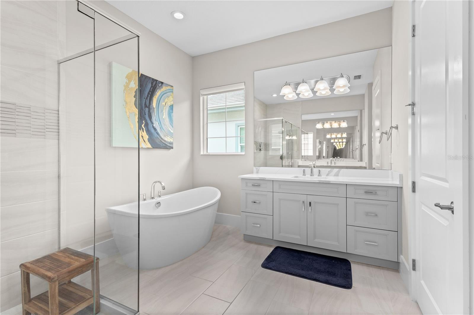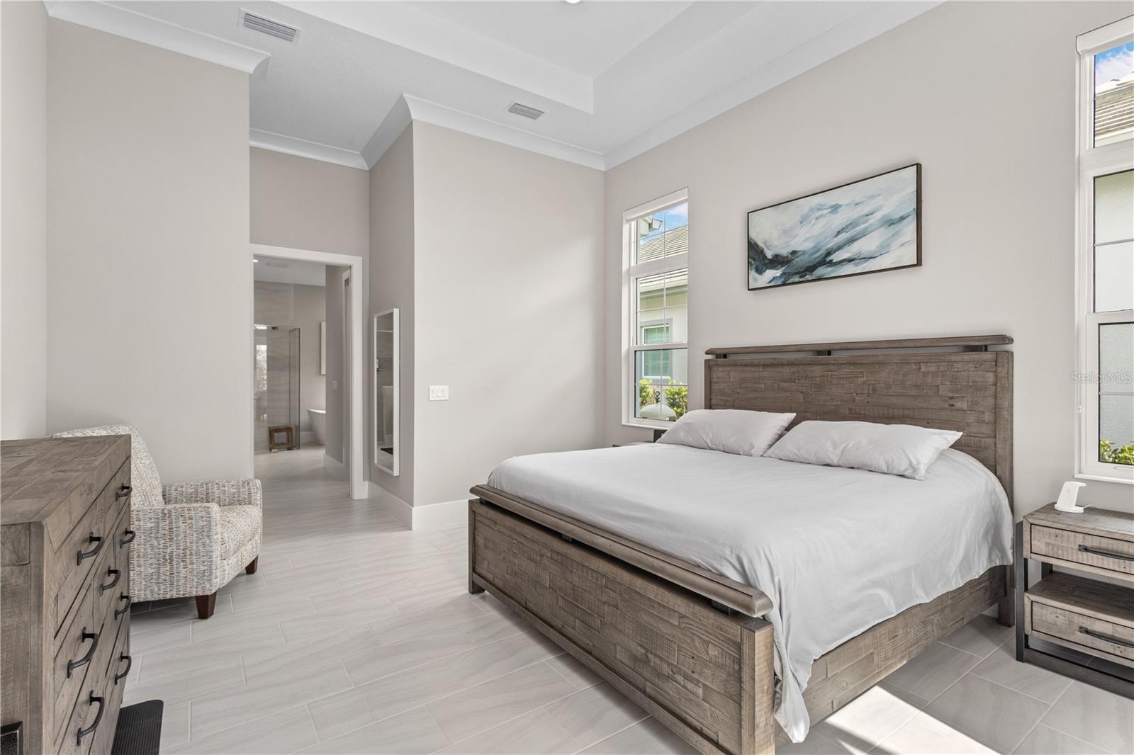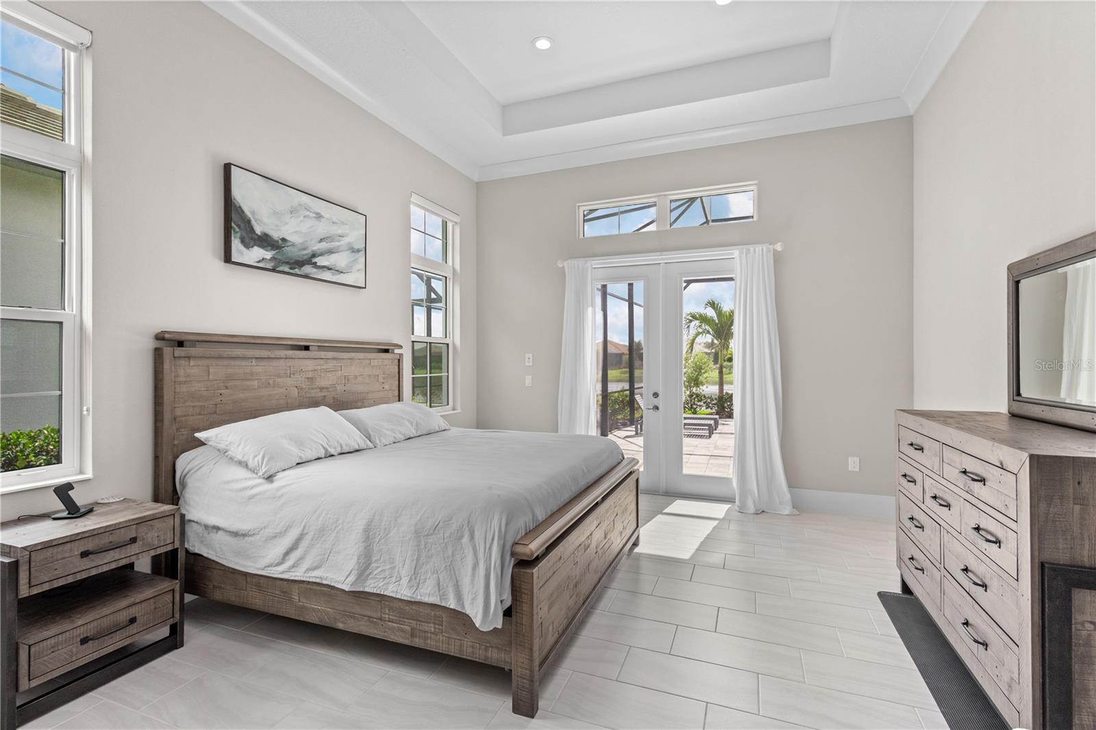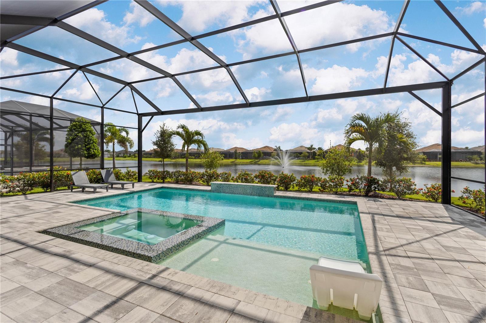 Nestled behind the gates of The Lake Club, this barely-lived-in 2023 built lakefront home is the pinnacle of luxury Florida living. Featuring three bedrooms, three-and-a-half bathrooms and a dedicated home office, this contemporary home was designed with function and beauty in mind. Over 2,600 square feet feel even more expansive with soaring ceilings, crown molding and architectural tray ceilings accentuating nearly every room. The open living space is anchored by the Chef's kitchen including; Custom Shaker-style cabinetry, oversized quartz island with bar seating for three and built-in, top-of-the-line stainless steel appliances. Seamless indoor-outdoor living is achieved with pocketing, impact-rated sliding doors connecting to an additional 600 square feet of covered lanai and the extended pool area beyond. Encapsulating true Florida living, a custom pool features a sunken, 360-degree edge spa, sun shelf and waterfall feature. After a day in the sun, retreat to an owner's suite designed for relaxation with freestanding tub, separate walk-in shower, dual, split vanities and two customized walk-in closets. A spacious three-car garage with additional custom storage and epoxy floors provides all the room you need for your toys. The Lake Club redefines luxury living in Lakewood Ranch, presenting residents a 22,000 square foot Grande Clubhouse with a full-service restaurant and bar, two resort-style pools, fully equipped fitness center, spa services and concierge amenities. Residents also have access to several tennis and pickle ball courts, basketball court, two dog parks and social events curated by a dedicated Lifestyle Director. Within America's top-rated multigenerational community, you're just minutes from upscale dining and shopping at Waterside Place and University Town Center, world-renowned golf and convenient to Downtown Sarasota, Gulf Beaches and cultural venues like the Van Wezel Performing Arts Hall.