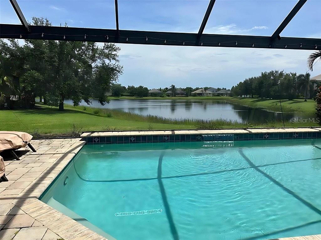 One or more photo(s) has been virtually staged. This beautifully maintained two-story residence offers over 3,100 sq ft of well-designed living space on a 1/3-acre lakefront lot, perfectly positioned to capture breathtaking sunrises and sunsets. Featuring 5 spacious bedrooms--including 4 on the main level--and 4 full bathrooms (two with walk-in showers and two with soaking tubs), this home blends comfort, elegance, and functionality.The open-concept kitchen, dining, and family room is the heart of the home, boasting granite counters, a center island, walk-in pantry, and brand new stainless steel appliances. Recent upgrades include luxury vinyl flooring, plush carpeting, and a brand new roof with solar panels (owned and completely paid off) for great energy savings.Step outside to your private outdoor oasis, complete with a spa, oversized swimming pool, and panoramic screened lanai plumbed for a future outdoor kitchen--ideal for entertaining or simply relaxing by the water.Upstairs, a large bonus room with full bath and walk-in closet offers the perfect space for a guest suite, home office, or in-law accommodations. Additional highlights include a 3-car garage with a Tesla charging station, central vacuum, surround sound, and a two-zone A/C system for efficiency and comfort. X flood zone, safest in the area, and we're on the same power grid as the school, which is also a shelter so we never lose power.Located in the highly sought-after Central Park community, you'll enjoy resort-style amenities including tennis and pickleball courts, a splash pad, playgrounds, and scenic walking trails. This home is zoned for top-rated schools--Mona Jain, Lakewood Ranch High, and Gullett--all within walking or biking distance. Just minutes from shopping, dining, golf, and recreation.This lakefront gem is move-in ready and offers the perfect blend of luxury and lifestyle in one of Lakewood Ranch's most desirable neighborhoods.
