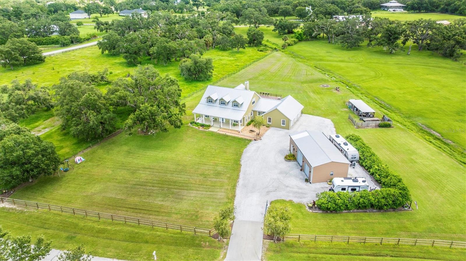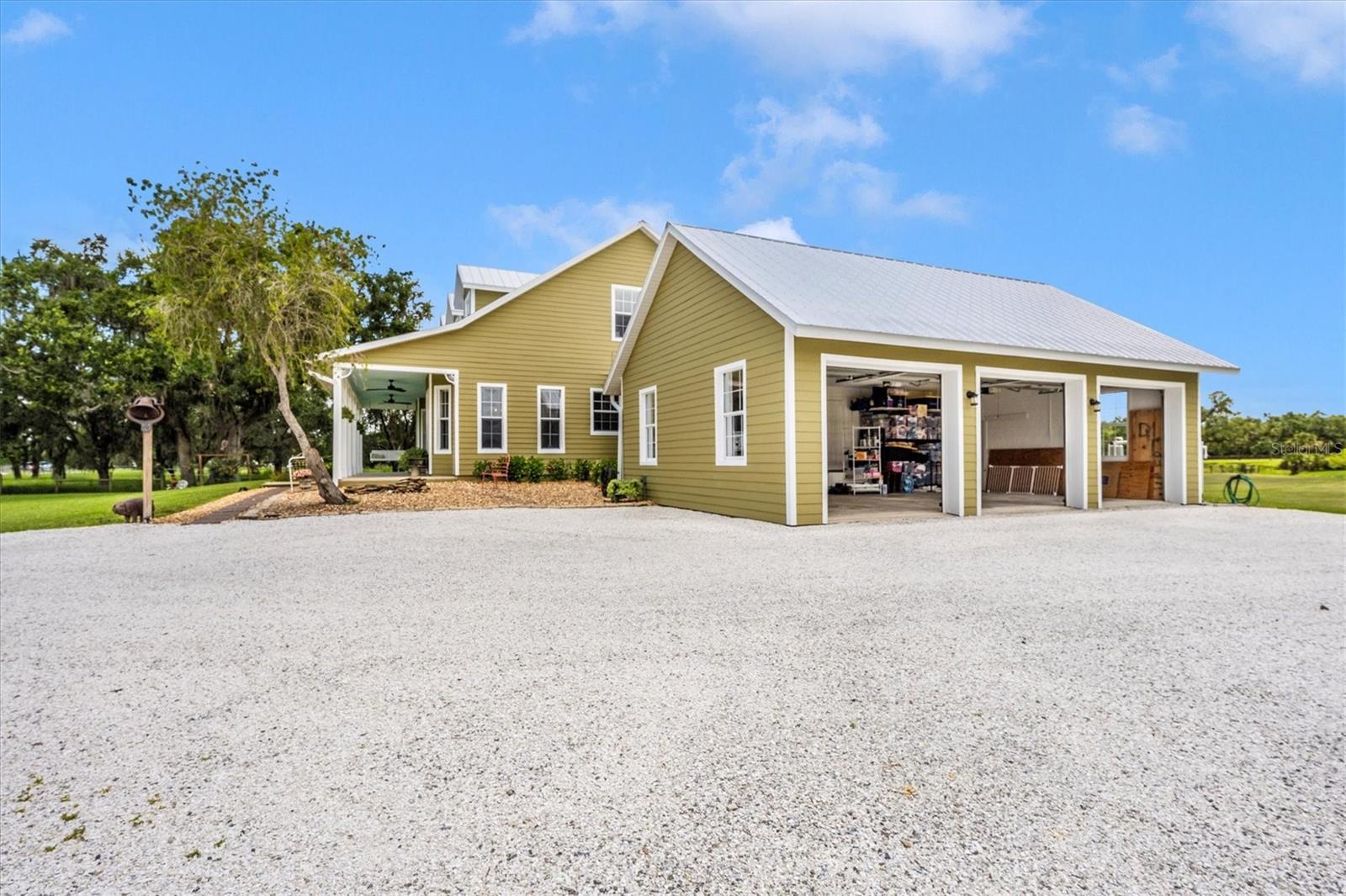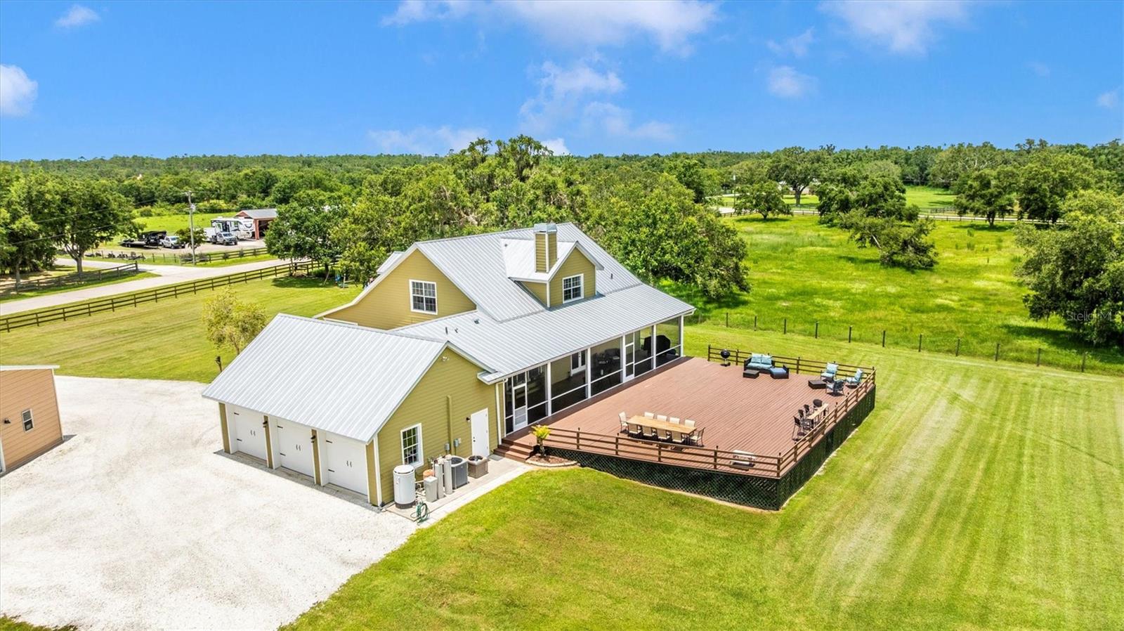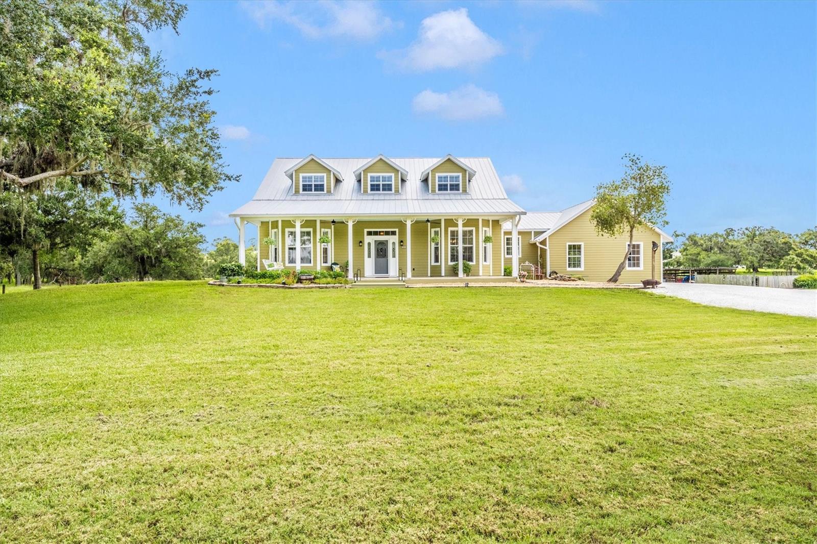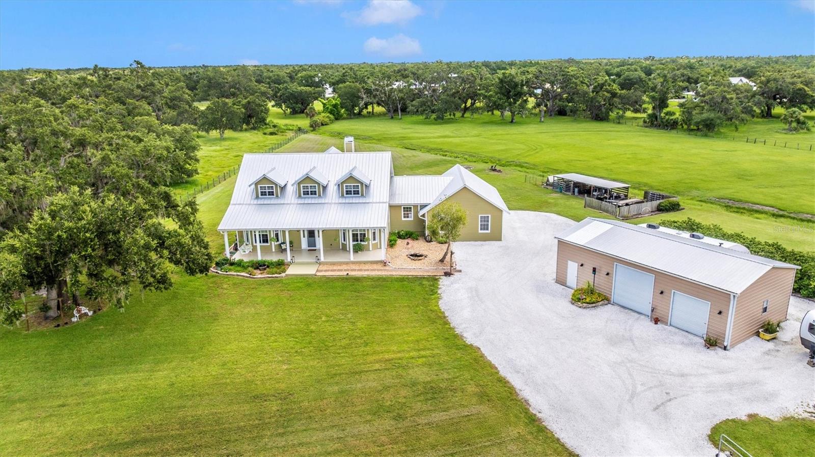 Welcome to your own private country retreat, nestled on nearly five acres of fenced land. This unique 3-bedroom, 2.5 bathroom home with soaring ceilings and lots of natural light blends rustic charm with modern comfort and is accessed by a pristine shell driveway. Meticulously maintained with new metal roof in 2020. The main level features a primary bedroom with an en-suite bathroom and walk-in closet. The separate laundry room is on the main level. Upstairs, two additional bedrooms share a large landing area--a versatile bonus space perfect for a home office, with a large window overlooking the view of the land. The outdoor space is just as impressive. A large, east-facing deck is perfectly positioned for tranquil mornings and enjoying stunning sunrise views over the acreage, which is framed by majestic oak trees. It's common to see deer and Sand Hill Cranes and Whistling ducks on the property. Did you make us coffee yet? Swing on the front porch and listen to the song birds. Beyond the attached 3-car garage, a separate oversized detached garage and workshop provides a haven for hobbyists or car enthusiasts. This space is equipped with three roll-up doors and a vehicle lift. For equestrian or animal lovers, there's a three-sided shed with two pens and two open stalls Landscaped shell parking provides plenty of room for RV, boat and guests.This estate is nestled in a community with horse trails, offering both privacy and outdoor adventure.Whether you're seeking space for your passions, room for animals, or simply a serene lifestyle close to Sarasota, shopping, entertainment, dining, beaches, boat ramp, 1901 Joshua Drive delivers it all--land, lifestyle, and lasting value.
