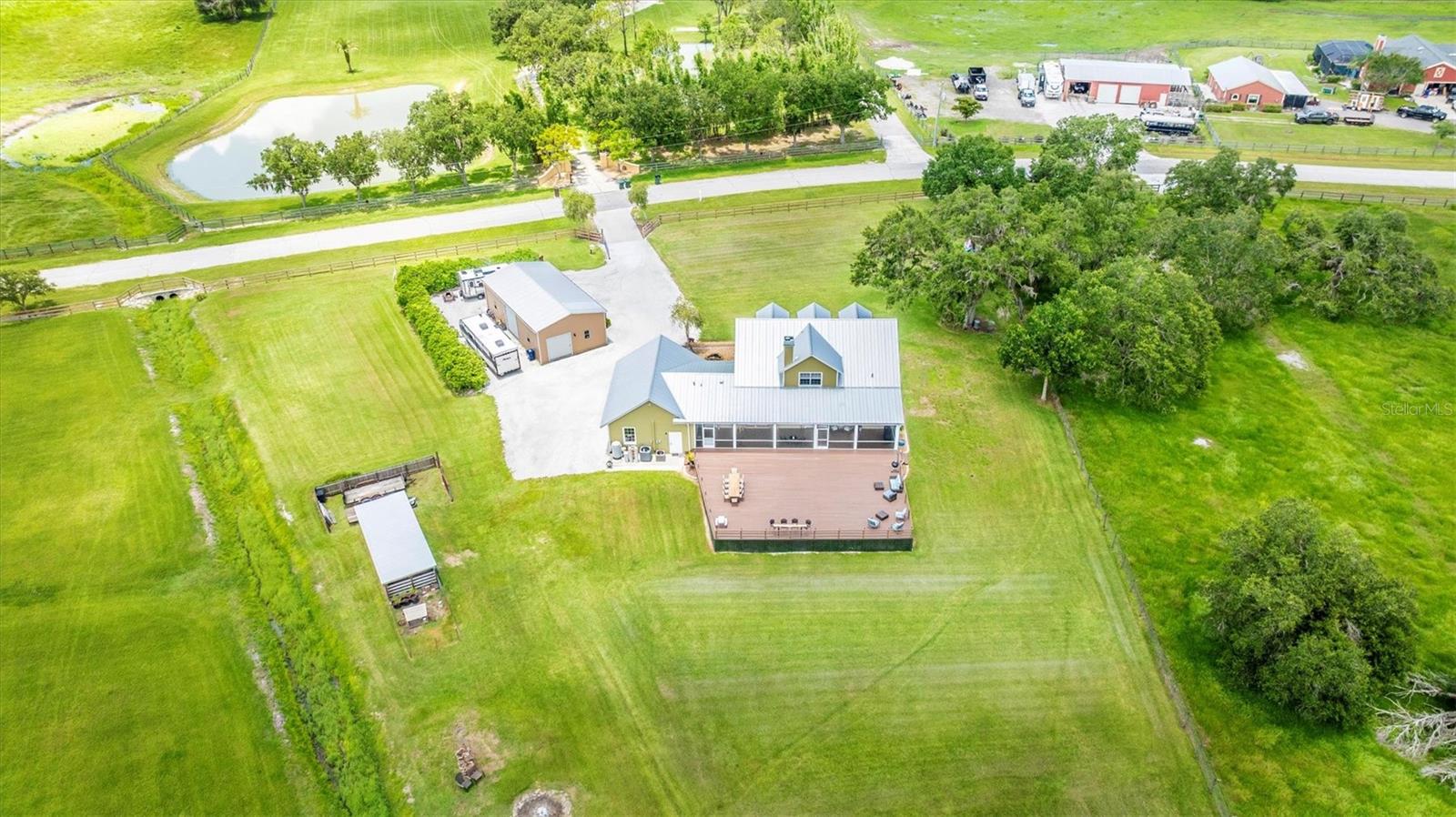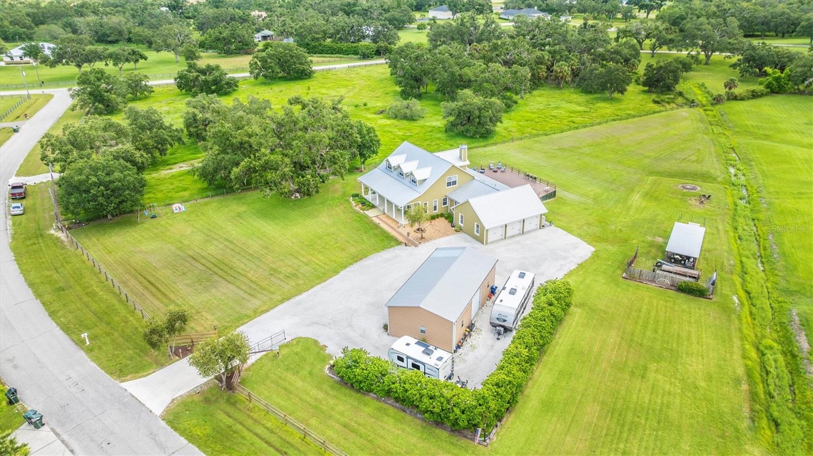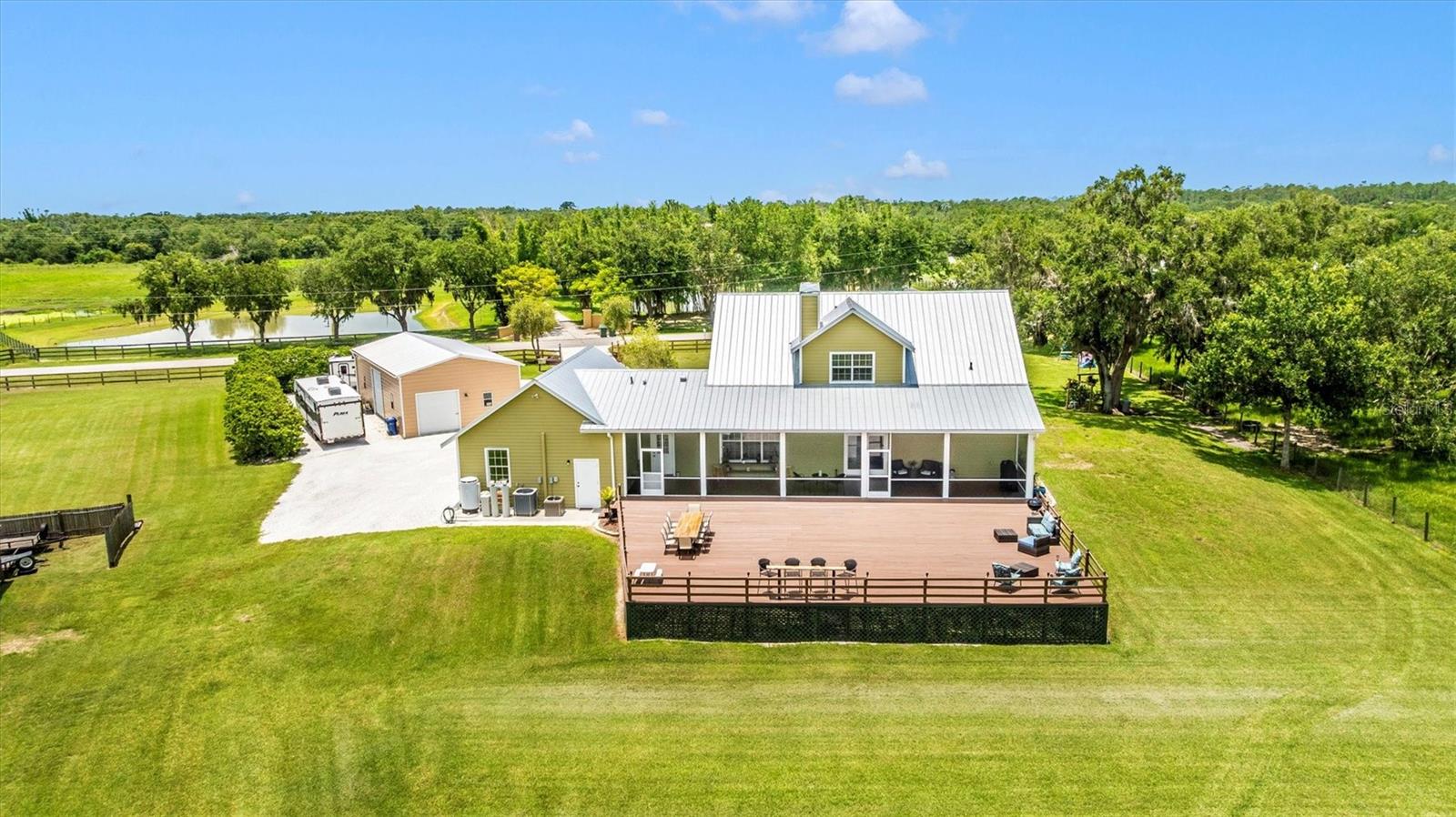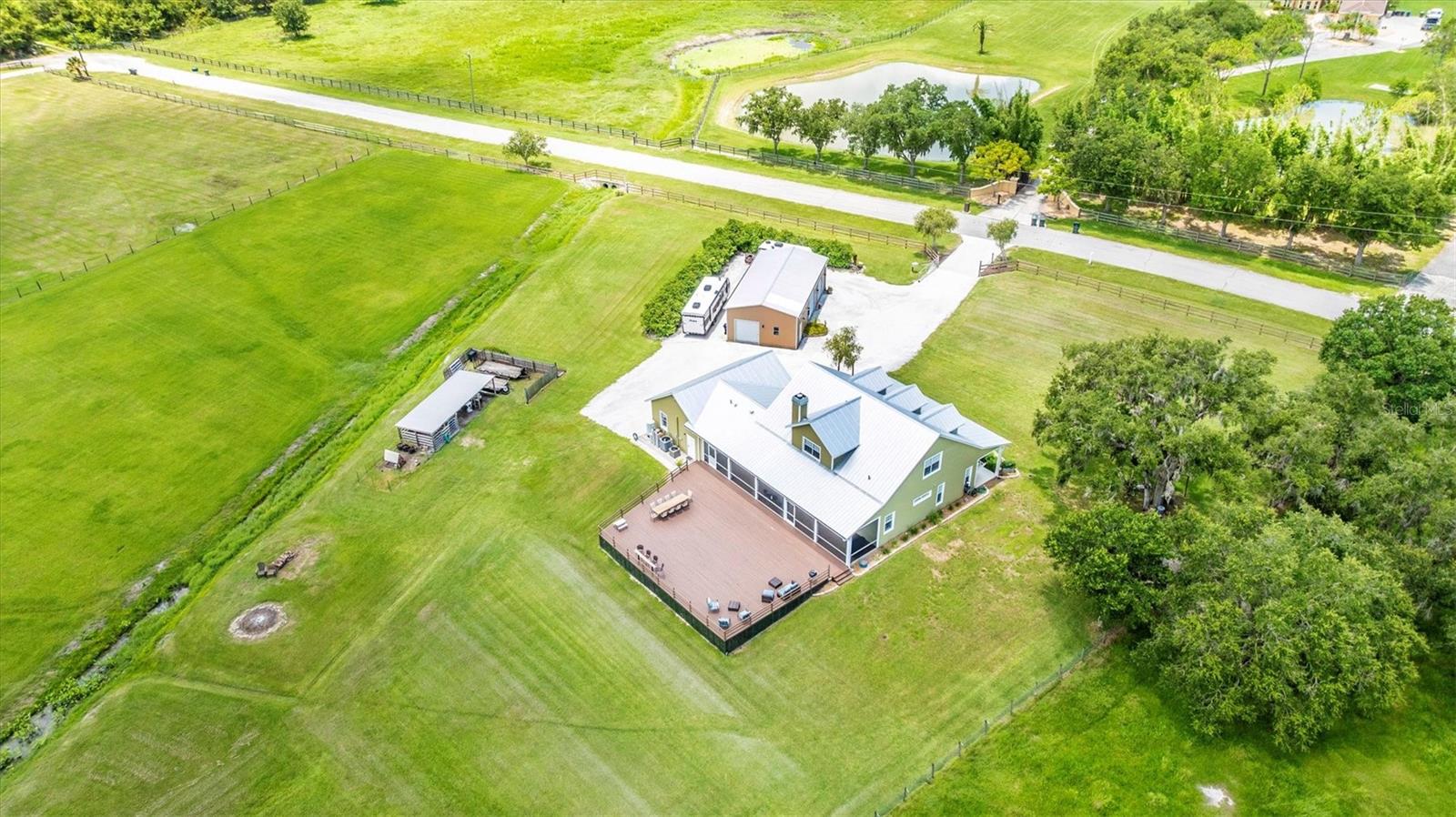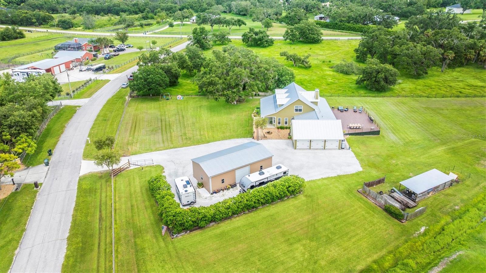 Welcome to your own private country retreat, nestled on nearly five acres of fenced land. This unique 3-bedroom, 2.5 bathroom home with soaring ceilings and lots of natural light blends rustic charm with modern comfort and is accessed by a pristine shell driveway. Meticulously maintained with new metal roof in 2020. The main level features a primary bedroom with an en-suite bathroom and walk-in closet. The separate laundry room is on the main level. Upstairs, two additional bedrooms share a large landing area--a versatile bonus space perfect for a home office, with a large window overlooking the view of the land. The outdoor space is just as impressive. A large, east-facing deck is perfectly positioned for tranquil mornings and enjoying stunning sunrise views over the acreage, which is framed by majestic oak trees. It's common to see deer and Sand Hill Cranes and Whistling ducks on the property. Did you make us coffee yet? Swing on the front porch and listen to the song birds. Beyond the attached 3-car garage, a separate oversized detached garage and workshop provides a haven for hobbyists or car enthusiasts. This space is equipped with three roll-up doors and a vehicle lift. For equestrian or animal lovers, there's a three-sided shed with two pens and two open stalls Landscaped shell parking provides plenty of room for RV, boat and guests.This estate is nestled in a community with horse trails, offering both privacy and outdoor adventure.Whether you're seeking space for your passions, room for animals, or simply a serene lifestyle close to Sarasota, shopping, entertainment, dining, beaches, boat ramp, 1901 Joshua Drive delivers it all--land, lifestyle, and lasting value.
