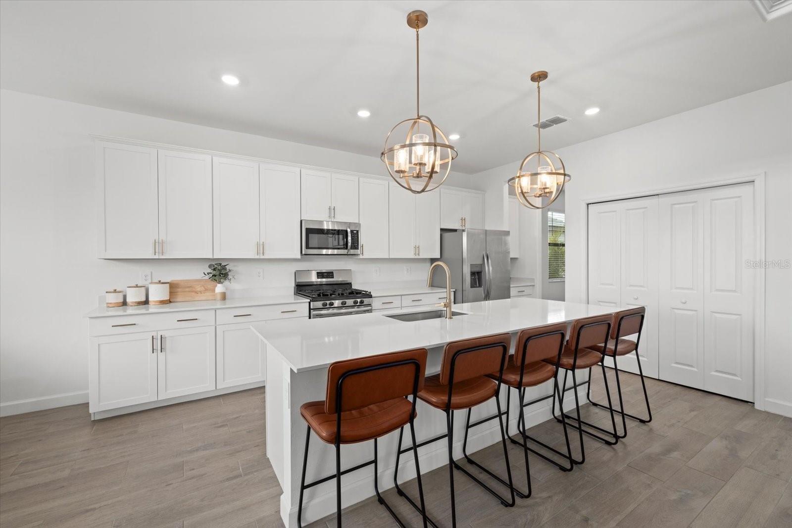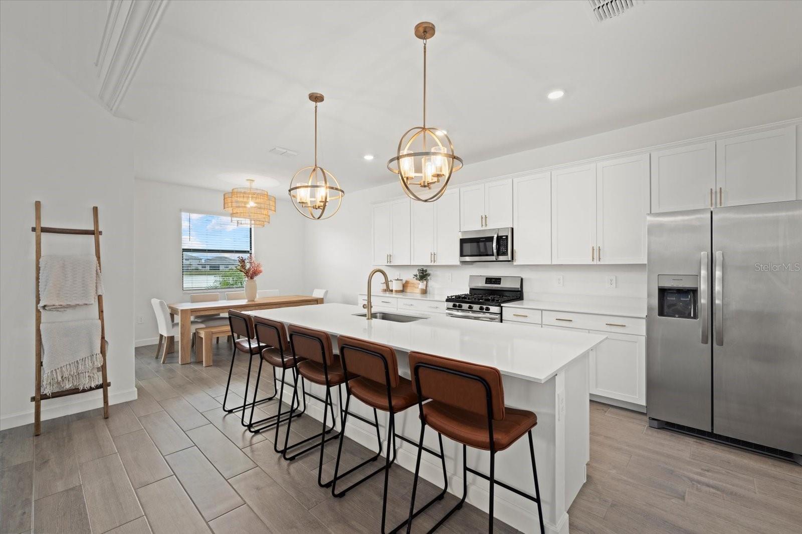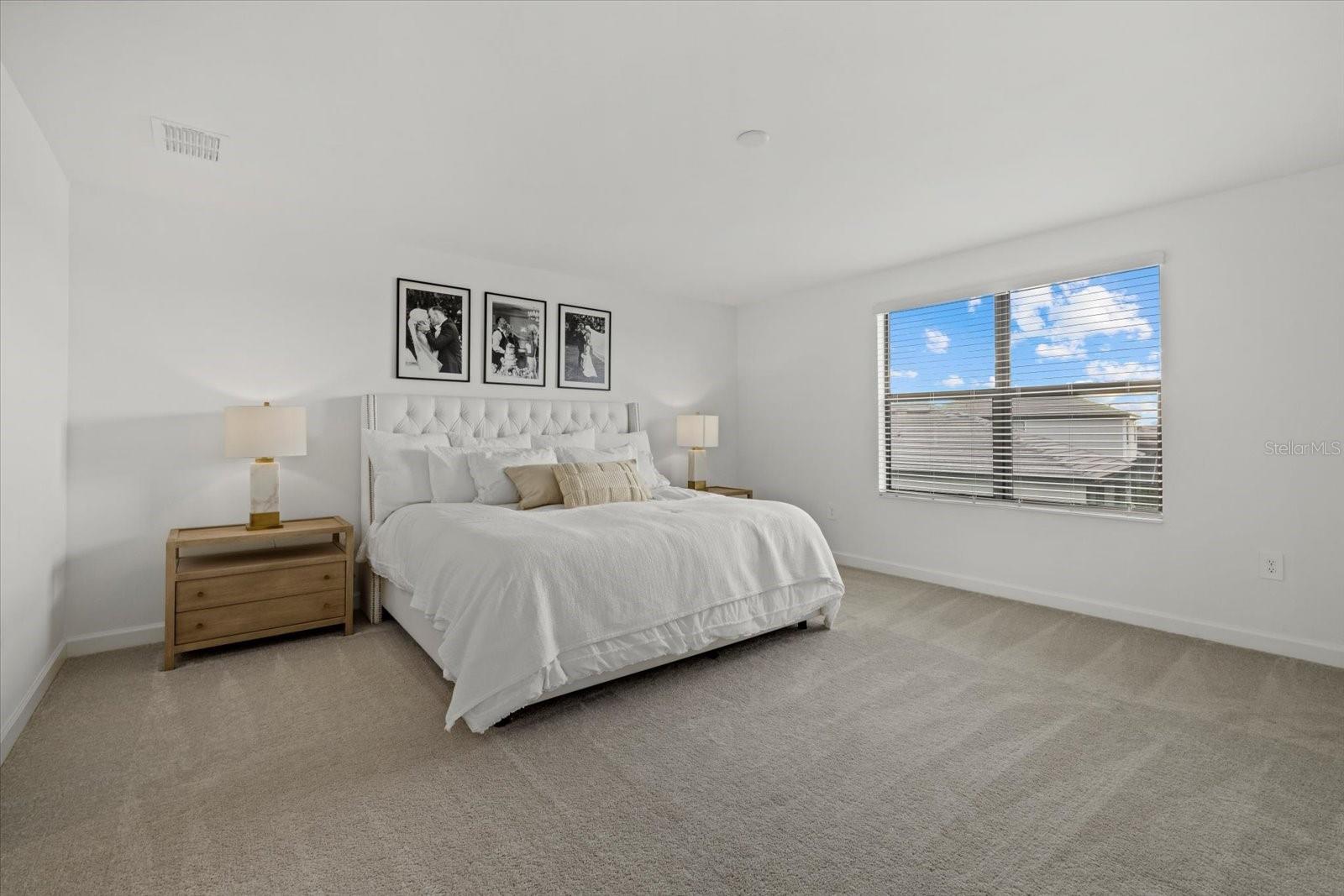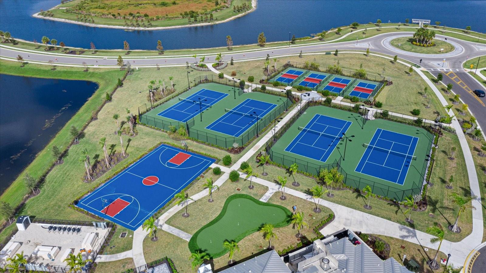 Impressive five-bedroom, five-bathroom residence in the heart of Lakewood Ranch within a picturesque resort community. Positioned on a lot that offers beautiful water views, the home is enhanced by lush privacy palms lining the backyard and perfect southwestern lighting with sunset vistas. The property includes a split three car garage and dual driveways with winding paver walkways leading to the glass front door. Upon entering, you are welcomed by an abundance of natural light that fills the home, creating a warm glow throughout. The first floor is finished with stunning, professionally sealed plank tile floors. To the right, a formal dining room with a butler's pantry provides an ideal space for special occasions and holiday gatherings with family and friends. The kitchen showcases sparkling quartz countertops and stainless steel appliances complemented by champagne bronze hardware and designer lighting. Adjacent to the kitchen, the open concept breakfast nook offers a comfortable spot for casual dining with lovely views of the water. A focal point of this stunning residence is the impressive two-story great room, which enhances the sense of spaciousness and grandeur within the home. The design incorporates two sets of glass sliding doors that invite natural light and provide a seamless transition between indoor and outdoor spaces. Relax on the covered, screened lanai watching the sun set over the water. On the first floor, there is also a generously sized bedroom that offers versatility, easily functioning as a home office or guest room. This bedroom features an attached full bathroom that serves as a convenient pool bath, adding to the home's functionality. Back inside, as you ascend the open grand staircase, you'll find the spacious primary bedroom, which features, not one, but two walk-in closets. The primary bathroom features split vanities, quartz countertops, and a large walk-in shower. Additionally, there are three large bedrooms upstairs, one of which includes its own ensuite full bathroom. A third full bathroom with double sinks is also conveniently located on this floor. Completing the upper level is a versatile bonus room, ideal for use as a playroom, movie room, or game room. Lorraine Lakes boasts attractive features such as paver driveways, tile roofs, and a guard gate for added security. The HOA covers cable and internet, lawn maintenance, irrigation water, and offers a full range of resort-style amenities. Residents can enjoy an outdoor bar, a restaurant for poolside dining, a resort pool with separate lap pool, a hot tub, a splash playground, and facilities for tennis, pickleball, and basketball, including both indoor and outdoor courts. Additional amenities include a full fitness center, an arcade, an indoor playroom, a playground, a fishing dock, and a coffee bar. Schedule a showing to see this beautiful five-bedroom, five-bathroom home complete with a three car garage in Lakewood Ranch before it's no longer available. The home has ample backyard space to design and customize your dream pool.
