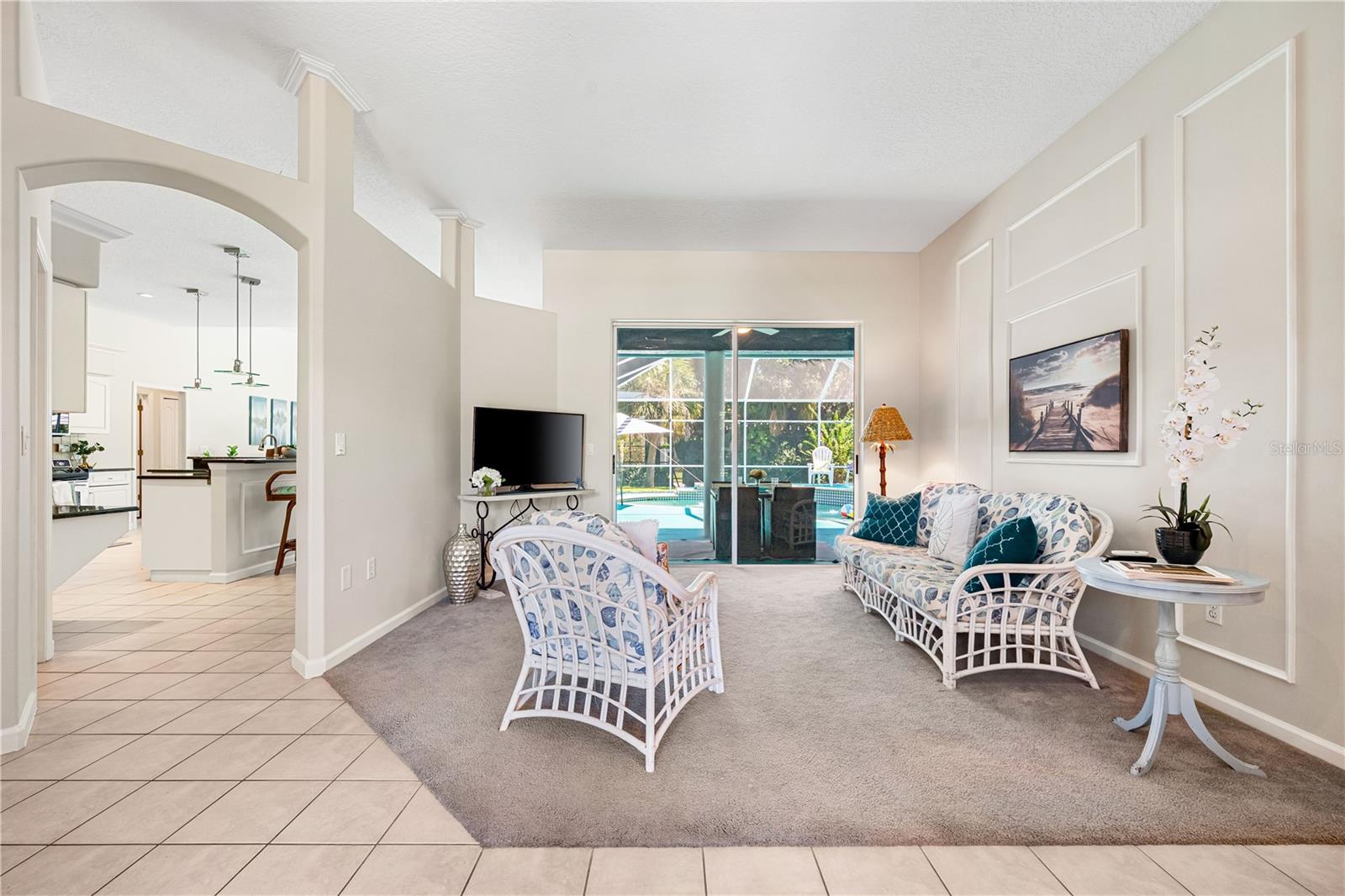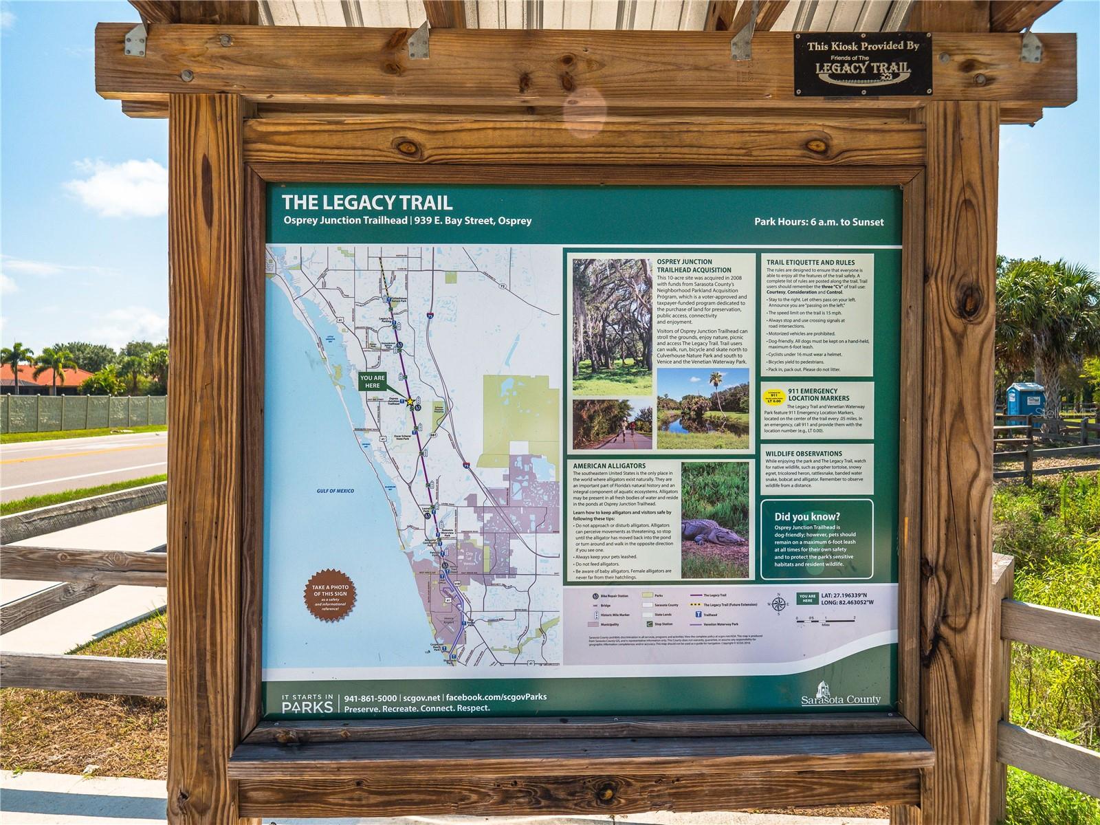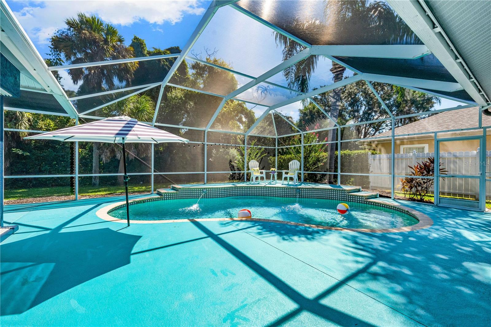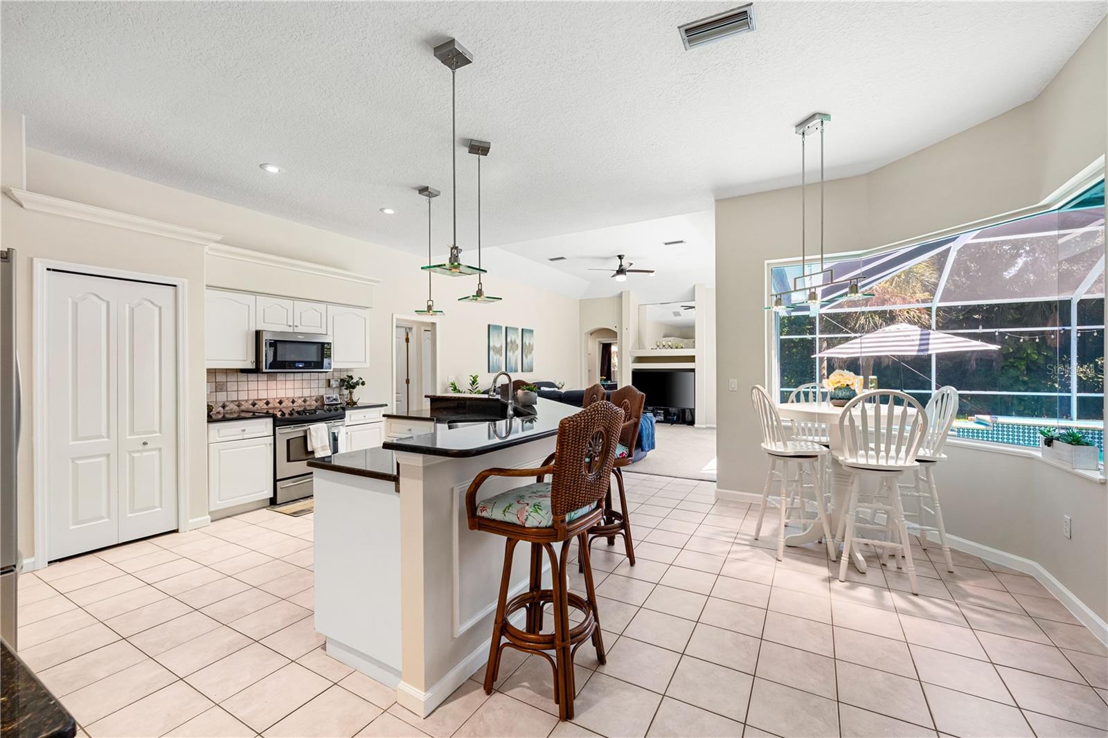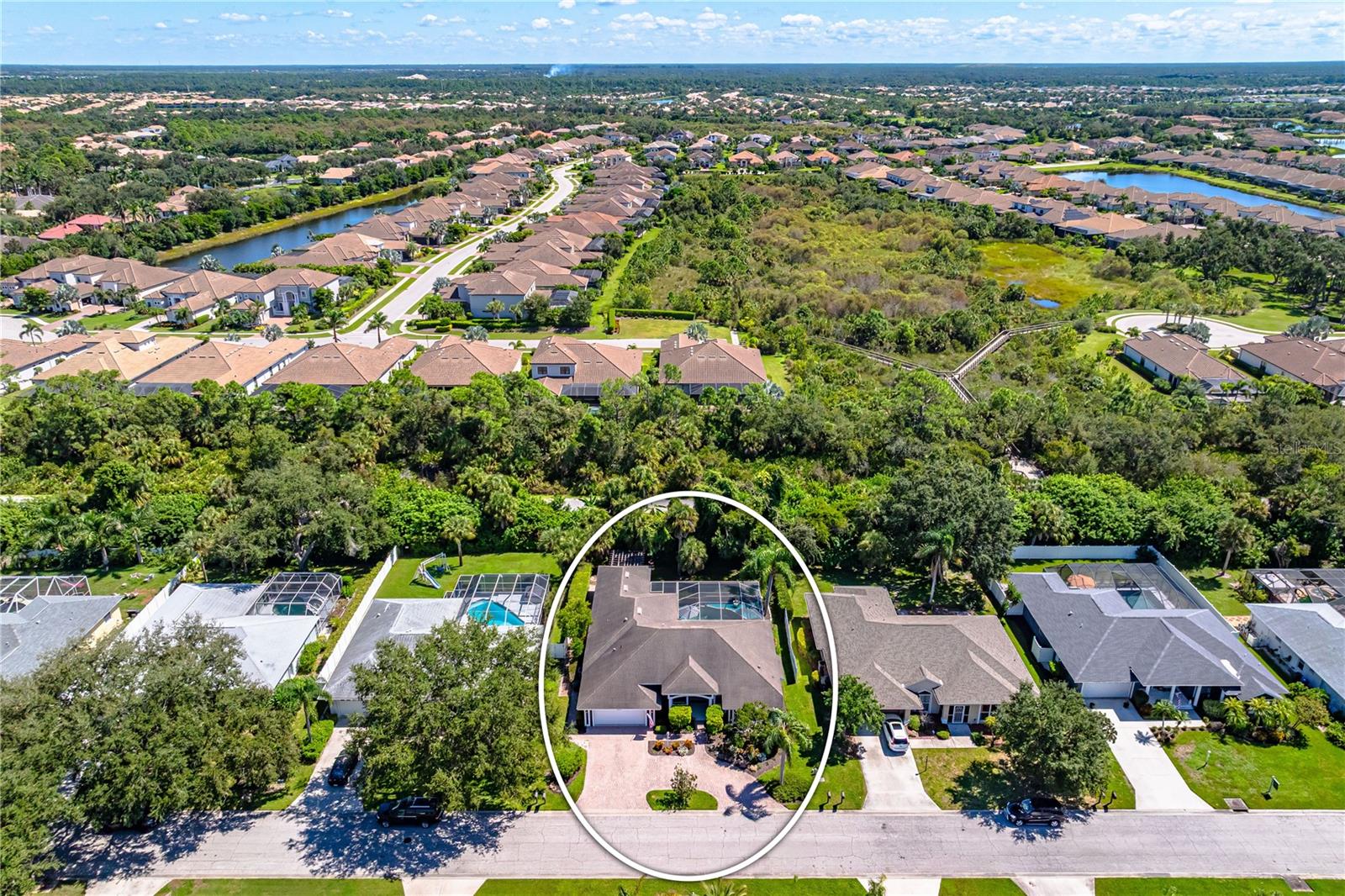 One of the largest homes in Bay Oaks Estates, this 5-bed, 2.5-bath single-story pool retreat delivers the best of indoor-outdoor Florida living with flexible spaces for guests, work, and play. Curb appeal pops with a brick paver circular drive, lush landscaping, and a covered, columned entry with French double doors and an arched transom. Inside, high ceilings and an abundance of natural light set a welcoming tone. The formal living and dining rooms flow to the heart of the home - a well-appointed kitchen designed for everyday living and entertaining, featuring granite counters, tile backsplash, stainless appliances, a center island with raised breakfast bar, closet pantry, built-in desk and wine rack, recessed & pendant lighting, and a picturesque breakfast nook with wraparound windows. The kitchen opens to the spacious family room with a tray ceiling and mirrored media niche. A pocketing three-panel slider seamlessly extends the living space to the covered lanai and screened pool; additional sliders from the formal living room, the primary suite, and a secondary bedroom maintain the indoor-outdoor connection.Out back, the lanai enjoys a private, tranquil, tree-lined backdrop, overlooking a curved, free-form pool with twin arc fountain jets, a raised sun terrace for lounging, and generous space to relax or gather. A screen door leads to the lawn and a separate pergola patio with power - perfect for morning coffee or an evening grill. From the backyard you have direct access to the Legacy Trail, the popular paved, multi-use path linking Sarasota and Venice, for miles of biking and walking through nature.The private primary retreat offers lanai access, two closets (one walk-in), and a spa-like en-suite bath with a Jacuzzi jetted soaking tub framed by an arched window with plantation shutters, separate walk-in shower with wall body sprays, a long double vanity, and a private water closet. Thoughtful split-bedroom design places three secondary bedrooms and a full bath together in their own wing (one is oversized with lanai access that can flex as a game/media space), while a full 5th bedroom - currently used as an office - sits near the primary suite. An interior laundry room adds storage shelves, cabinets, and a utility sink. Major updates for peace of mind include: replumbed water lines, roof (2015), A/C (2019), new water heater (2024), new pool pump (2024), kitchen appliances (2021), washer and dryer (2023), polycarbonate storm panels, and irrigation.All in a well-kept, low-fee, pet-friendly Osprey community conveniently located just minutes from top-rated schools, including the prestigious Pine View School, and close to the Gulf beaches of world-renowned Siesta Key, Nokomis, and Venice, as well as Oscar Scherer State Park, and a variety of shopping, dining, entertainment, and everyday conveniences; the Gulf Coast lifestyle at its finest. Schedule your private showing today and fall in love with the lifestyle that 571 Pine Ranch East Rd has to offer.