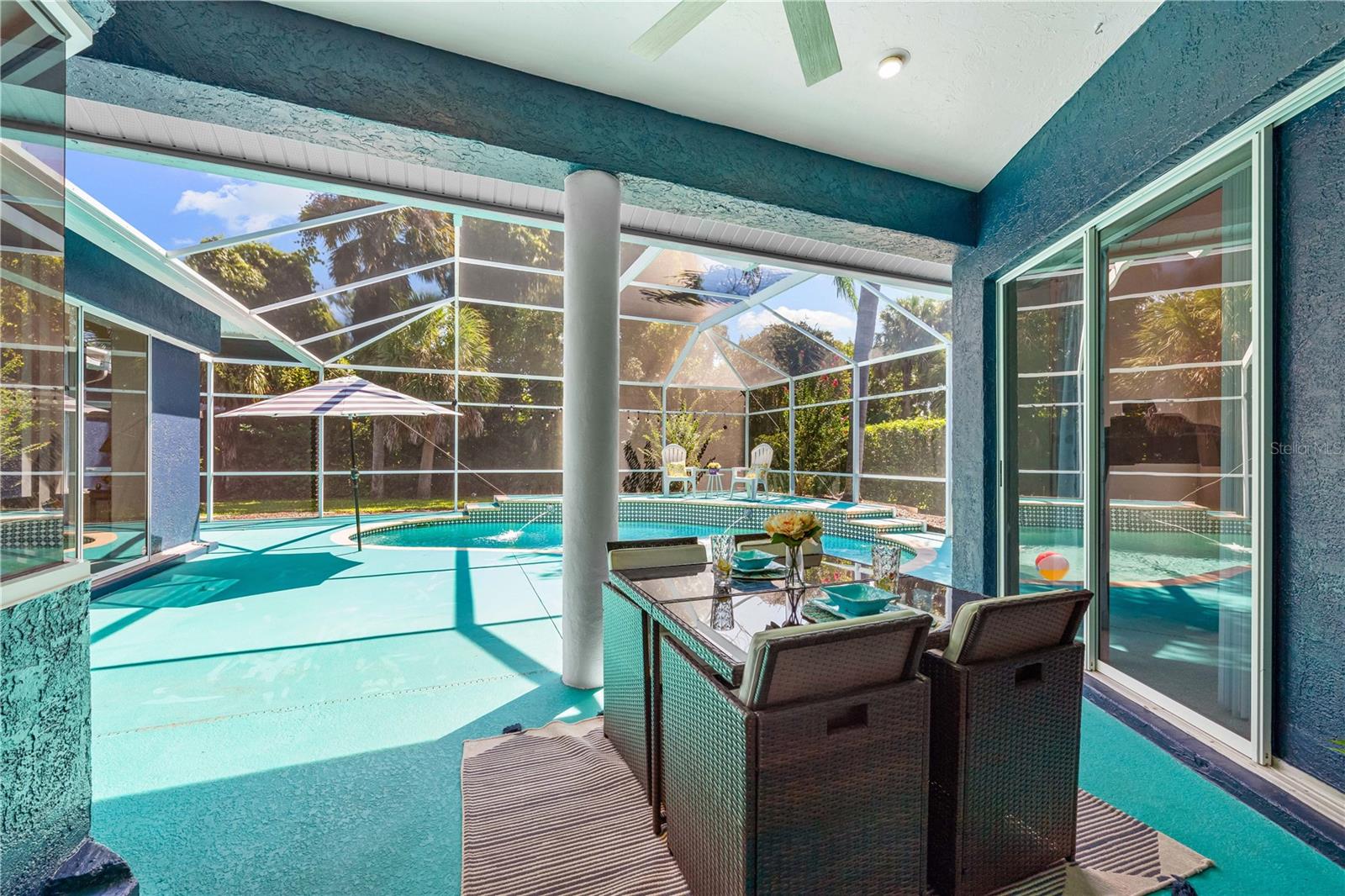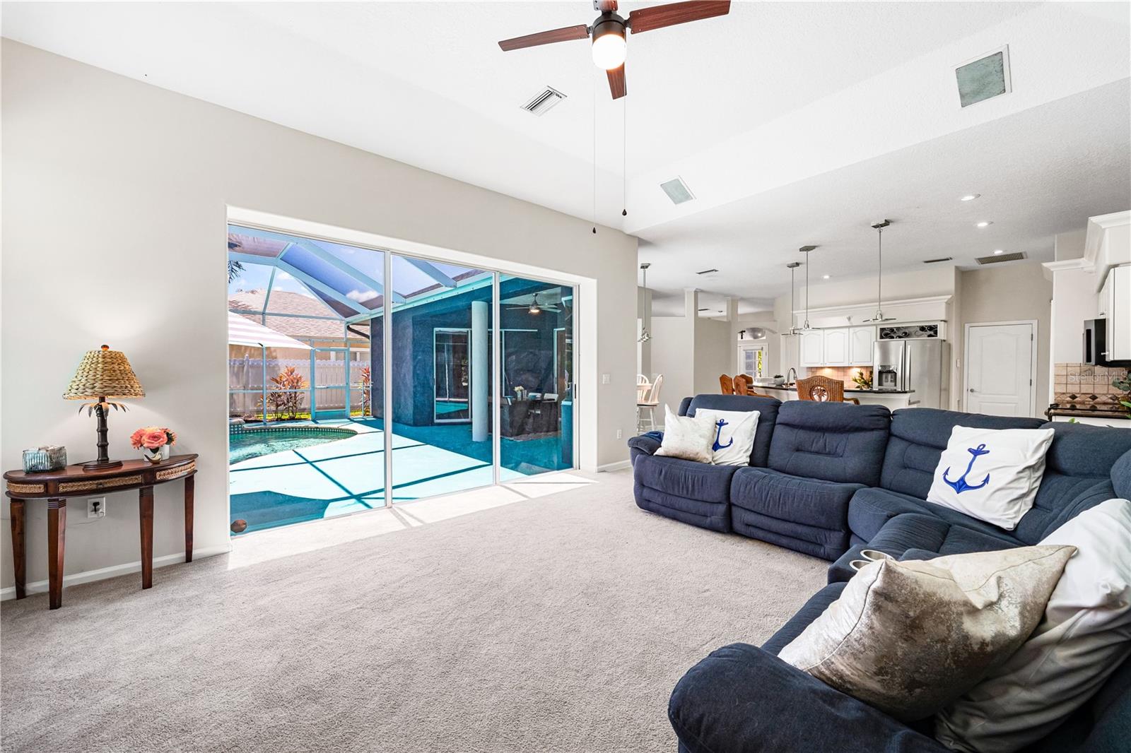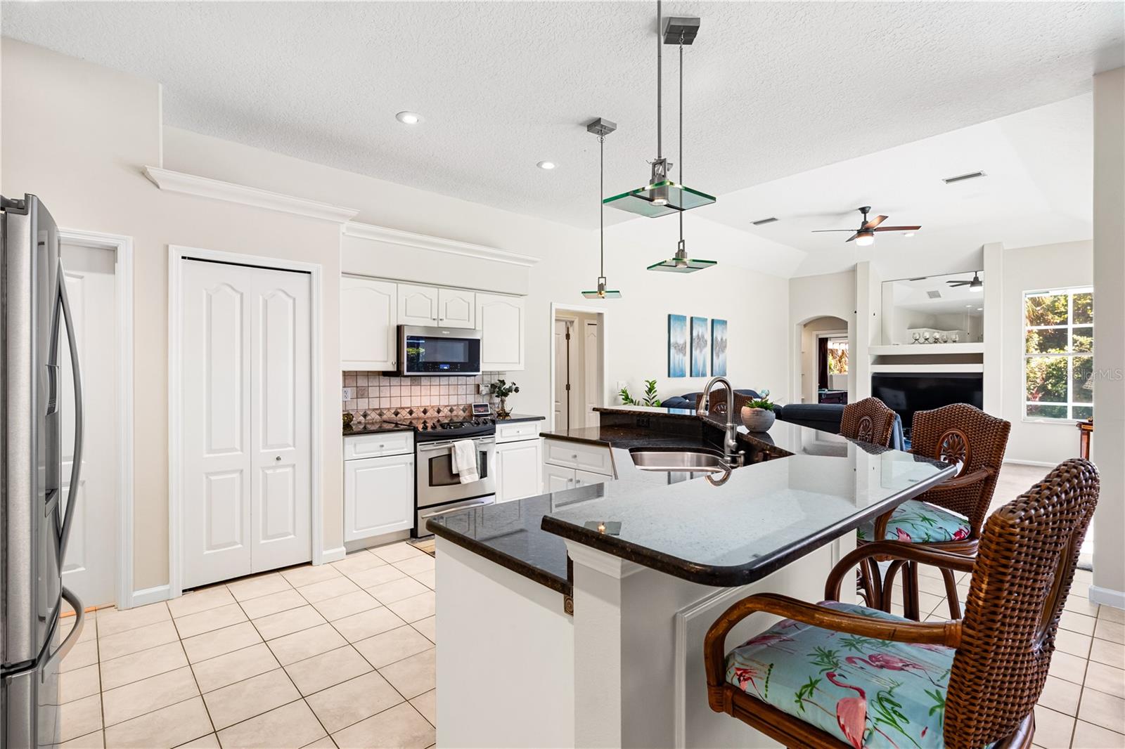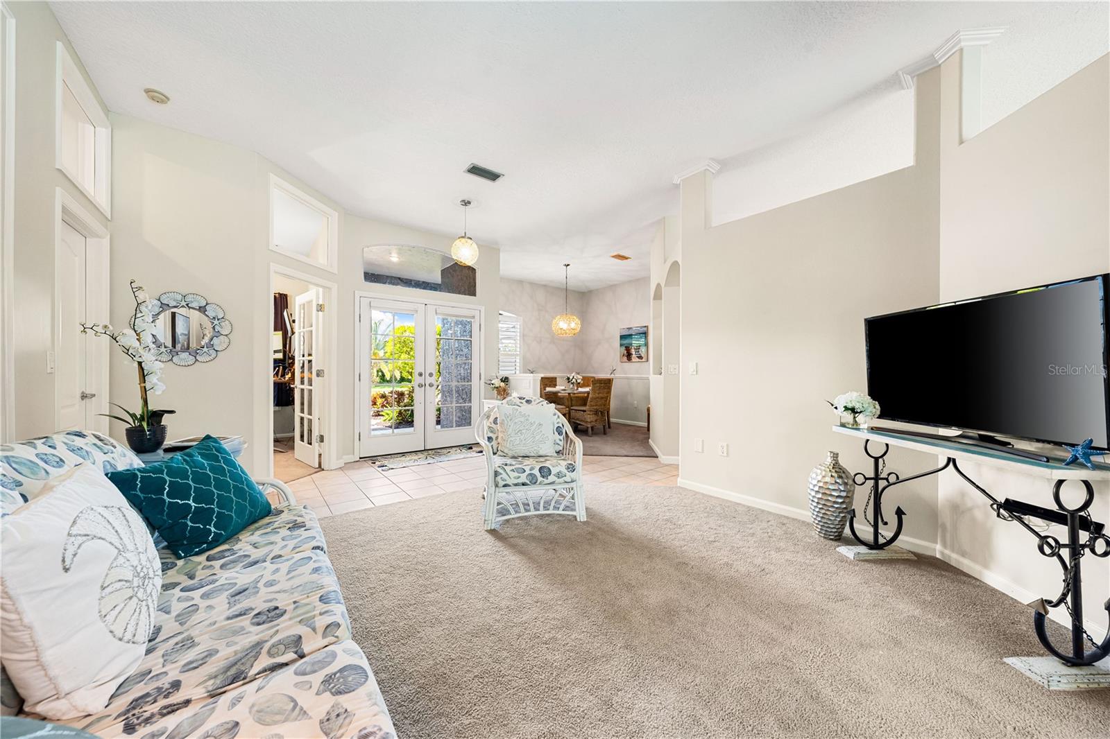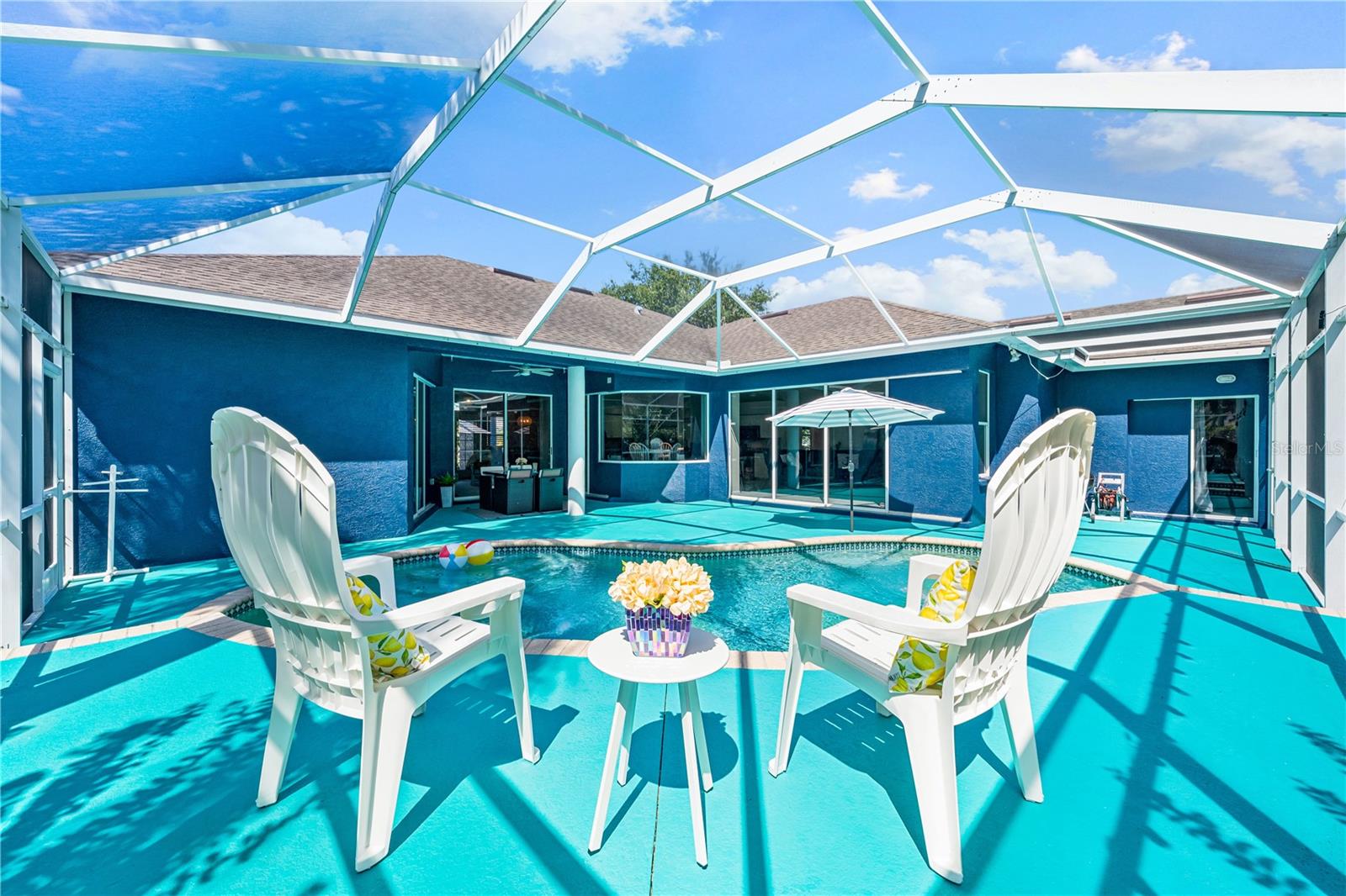 One of the largest homes in Bay Oaks Estates, this 5-bed, 2.5-bath single-story pool retreat delivers the best of indoor-outdoor Florida living with flexible spaces for guests, work, and play. Curb appeal pops with a brick paver circular drive, lush landscaping, and a covered, columned entry with French double doors and an arched transom. Inside, high ceilings and an abundance of natural light set a welcoming tone. The formal living and dining rooms flow to the heart of the home - a well-appointed kitchen designed for everyday living and entertaining, featuring granite counters, tile backsplash, stainless appliances, a center island with raised breakfast bar, closet pantry, built-in desk and wine rack, recessed & pendant lighting, and a picturesque breakfast nook with wraparound windows. The kitchen opens to the spacious family room with a tray ceiling and mirrored media niche. A pocketing three-panel slider seamlessly extends the living space to the covered lanai and screened pool; additional sliders from the formal living room, the primary suite, and a secondary bedroom maintain the indoor-outdoor connection.Out back, the lanai enjoys a private, tranquil, tree-lined backdrop, overlooking a curved, free-form pool with twin arc fountain jets, a raised sun terrace for lounging, and generous space to relax or gather. A screen door leads to the lawn and a separate pergola patio with power - perfect for morning coffee or an evening grill. From the backyard you have direct access to the Legacy Trail, the popular paved, multi-use path linking Sarasota and Venice, for miles of biking and walking through nature.The private primary retreat offers lanai access, two closets (one walk-in), and a spa-like en-suite bath with a Jacuzzi jetted soaking tub framed by an arched window with plantation shutters, separate walk-in shower with wall body sprays, a long double vanity, and a private water closet. Thoughtful split-bedroom design places three secondary bedrooms and a full bath together in their own wing (one is oversized with lanai access that can flex as a game/media space), while a full 5th bedroom - currently used as an office - sits near the primary suite. An interior laundry room adds storage shelves, cabinets, and a utility sink. Major updates for peace of mind include: replumbed water lines, roof (2015), A/C (2019), new water heater (2024), new pool pump (2024), kitchen appliances (2021), washer and dryer (2023), polycarbonate storm panels, and irrigation.All in a well-kept, low-fee, pet-friendly Osprey community conveniently located just minutes from top-rated schools, including the prestigious Pine View School, and close to the Gulf beaches of world-renowned Siesta Key, Nokomis, and Venice, as well as Oscar Scherer State Park, and a variety of shopping, dining, entertainment, and everyday conveniences; the Gulf Coast lifestyle at its finest. Schedule your private showing today and fall in love with the lifestyle that 571 Pine Ranch East Rd has to offer.