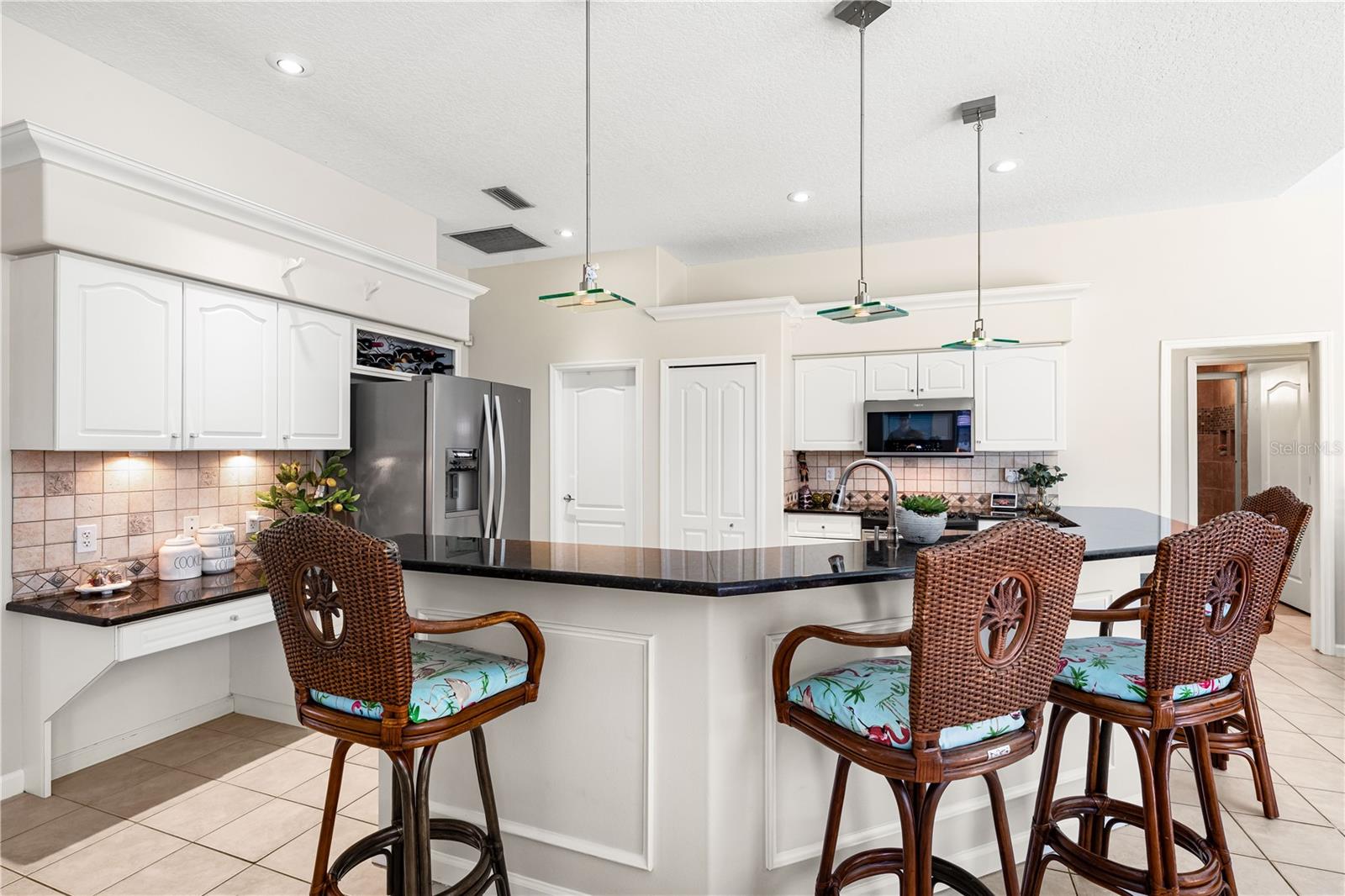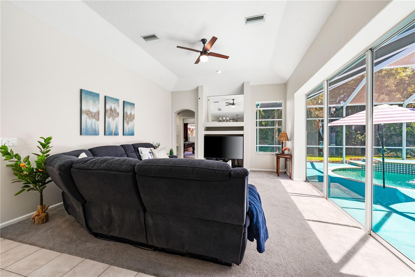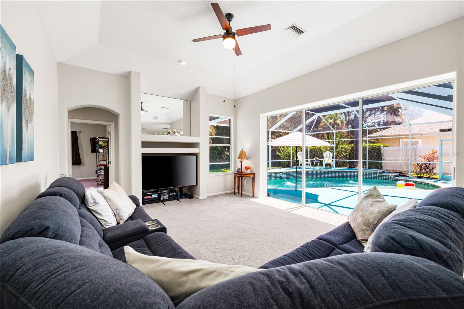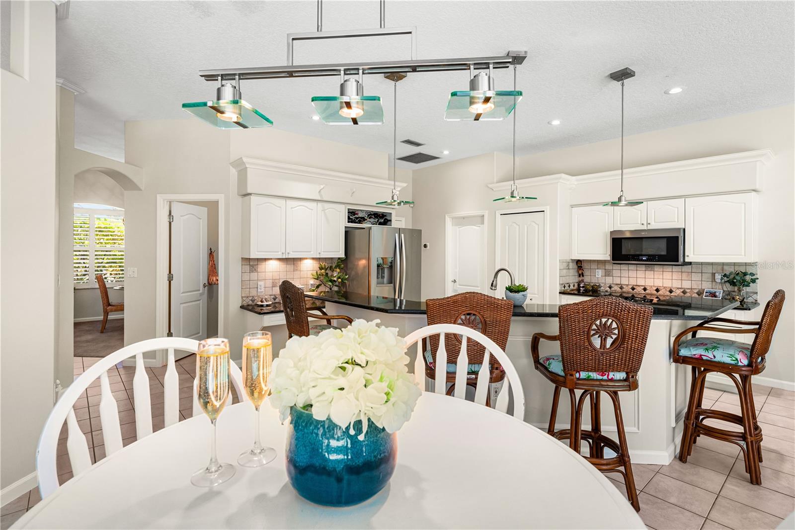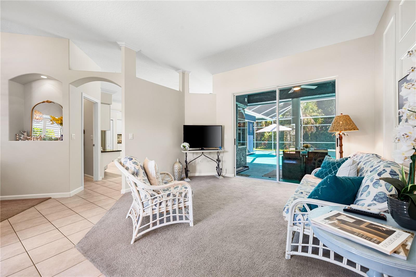 One of the largest homes in Bay Oaks Estates, this 5-bed, 2.5-bath single-story pool retreat delivers the best of indoor-outdoor Florida living with flexible spaces for guests, work, and play. Curb appeal pops with a brick paver circular drive, lush landscaping, and a covered, columned entry with French double doors and an arched transom. Inside, high ceilings and an abundance of natural light set a welcoming tone. The formal living and dining rooms flow to the heart of the home - a well-appointed kitchen designed for everyday living and entertaining, featuring granite counters, tile backsplash, stainless appliances, a center island with raised breakfast bar, closet pantry, built-in desk and wine rack, recessed & pendant lighting, and a picturesque breakfast nook with wraparound windows. The kitchen opens to the spacious family room with a tray ceiling and mirrored media niche. A pocketing three-panel slider seamlessly extends the living space to the covered lanai and screened pool; additional sliders from the formal living room, the primary suite, and a secondary bedroom maintain the indoor-outdoor connection.Out back, the lanai enjoys a private, tranquil, tree-lined backdrop, overlooking a curved, free-form pool with twin arc fountain jets, a raised sun terrace for lounging, and generous space to relax or gather. A screen door leads to the lawn and a separate pergola patio with power - perfect for morning coffee or an evening grill. From the backyard you have direct access to the Legacy Trail, the popular paved, multi-use path linking Sarasota and Venice, for miles of biking and walking through nature.The private primary retreat offers lanai access, two closets (one walk-in), and a spa-like en-suite bath with a Jacuzzi jetted soaking tub framed by an arched window with plantation shutters, separate walk-in shower with wall body sprays, a long double vanity, and a private water closet. Thoughtful split-bedroom design places three secondary bedrooms and a full bath together in their own wing (one is oversized with lanai access that can flex as a game/media space), while a full 5th bedroom - currently used as an office - sits near the primary suite. An interior laundry room adds storage shelves, cabinets, and a utility sink. Major updates for peace of mind include: replumbed water lines, roof (2015), A/C (2019), new water heater (2024), new pool pump (2024), kitchen appliances (2021), washer and dryer (2023), polycarbonate storm panels, and irrigation.All in a well-kept, low-fee, pet-friendly Osprey community conveniently located just minutes from top-rated schools, including the prestigious Pine View School, and close to the Gulf beaches of world-renowned Siesta Key, Nokomis, and Venice, as well as Oscar Scherer State Park, and a variety of shopping, dining, entertainment, and everyday conveniences; the Gulf Coast lifestyle at its finest. Schedule your private showing today and fall in love with the lifestyle that 571 Pine Ranch East Rd has to offer.