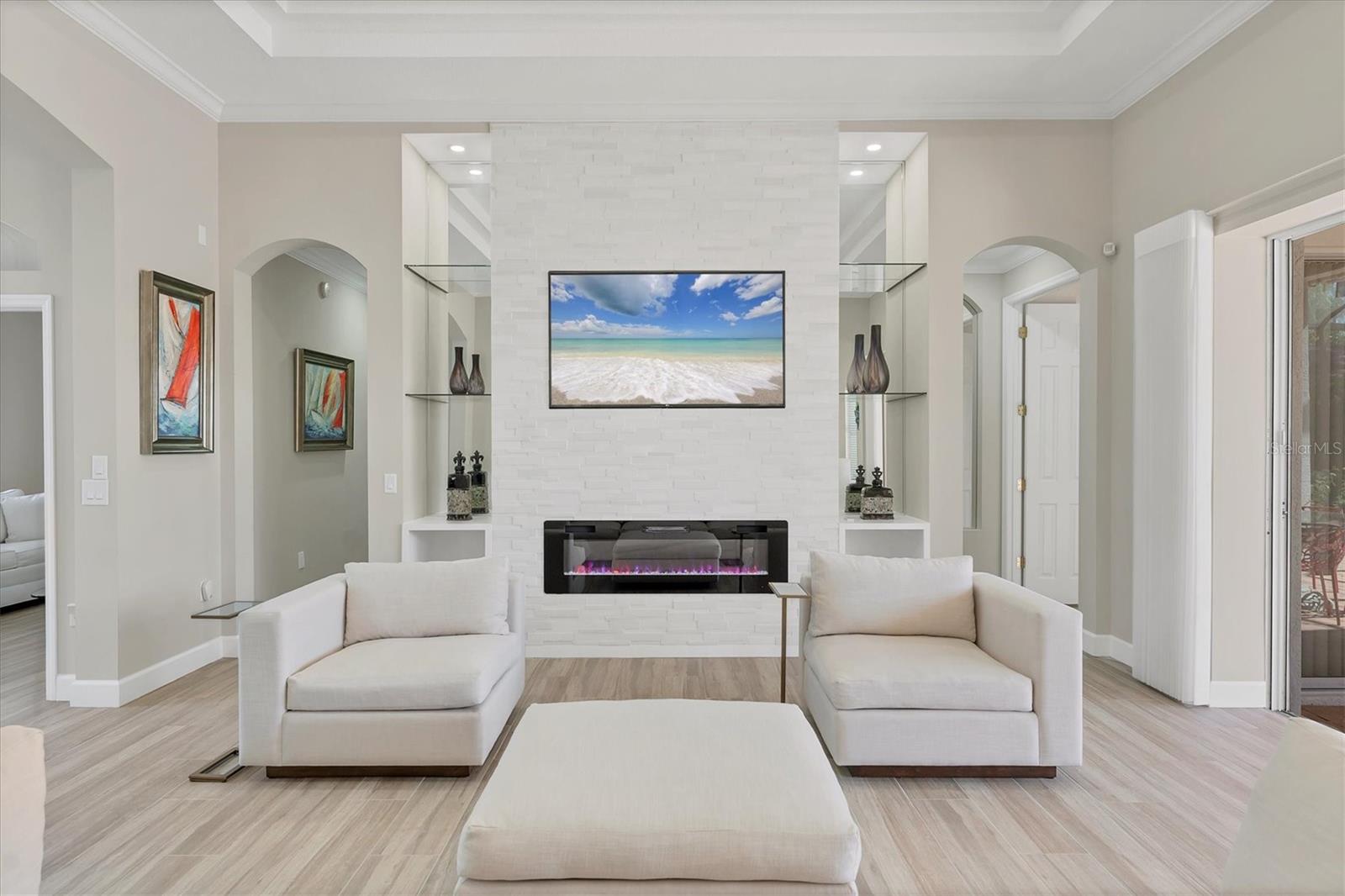 This home is FOR RENT as well $6,500 per month. Updates: ROOF, Entire Interior & Exterior, Pool and Equipment, Water Heater and more. Experience true luxury at an exceptional value. The current homeowner has invested extensively in the full renovation of this residence, creating a home that blends sophistication, comfort, and modern functionality.Step inside and imagine yourself relaxing by the magnificent marble fireplace that stretches from floor to ceiling, featuring an electric insert where you can customize your flame color to suit the mood. Love to cook gourmet meals with a glass of wine in hand? You'll be delighted by the brand-new chef's kitchen--equipped with Caf appliances, quartz countertops, a farmhouse sink, and a touchless faucet.The entire home showcases elegant new tile flooring and fresh interior paint, offering easy maintenance and a move-in-ready appeal.The primary suite is a delightful surprise--spacious and luxurious, featuring two custom walk-in closets designed by one of the most reputable firms in town. The primary bathroom is a masterpiece: dual custom vanities, an oversized walk-in shower with Moen fixtures, and a striking blue glass accent window that serves as art in itself.The guest bedroom includes a custom closet and a full bathroom adorned with a designer vanity, Moen fixtures, imported wallpaper from Switzerland, and a chic glass-enclosed shower. A third room, currently used as a den or home office, can easily be converted back into a bedroom with space for a full walk-in closet.The lanai is your private sanctuary--boasting a tongue-and-groove ceiling, stylish awning for shade, and a paved area spacious enough for multiple lounge chairs and a large 60-inch dining table with seating for six. Entertaining is effortless with a dedicated grilling area overlooking the sparkling pool and spa, the perfect retreat for relaxation.Lush, manicured landscaping frames this beautiful property, a true reflection of the owner's care and attention to detail. Every element was thoughtfully curated to transform this house into a warm, elegant home.