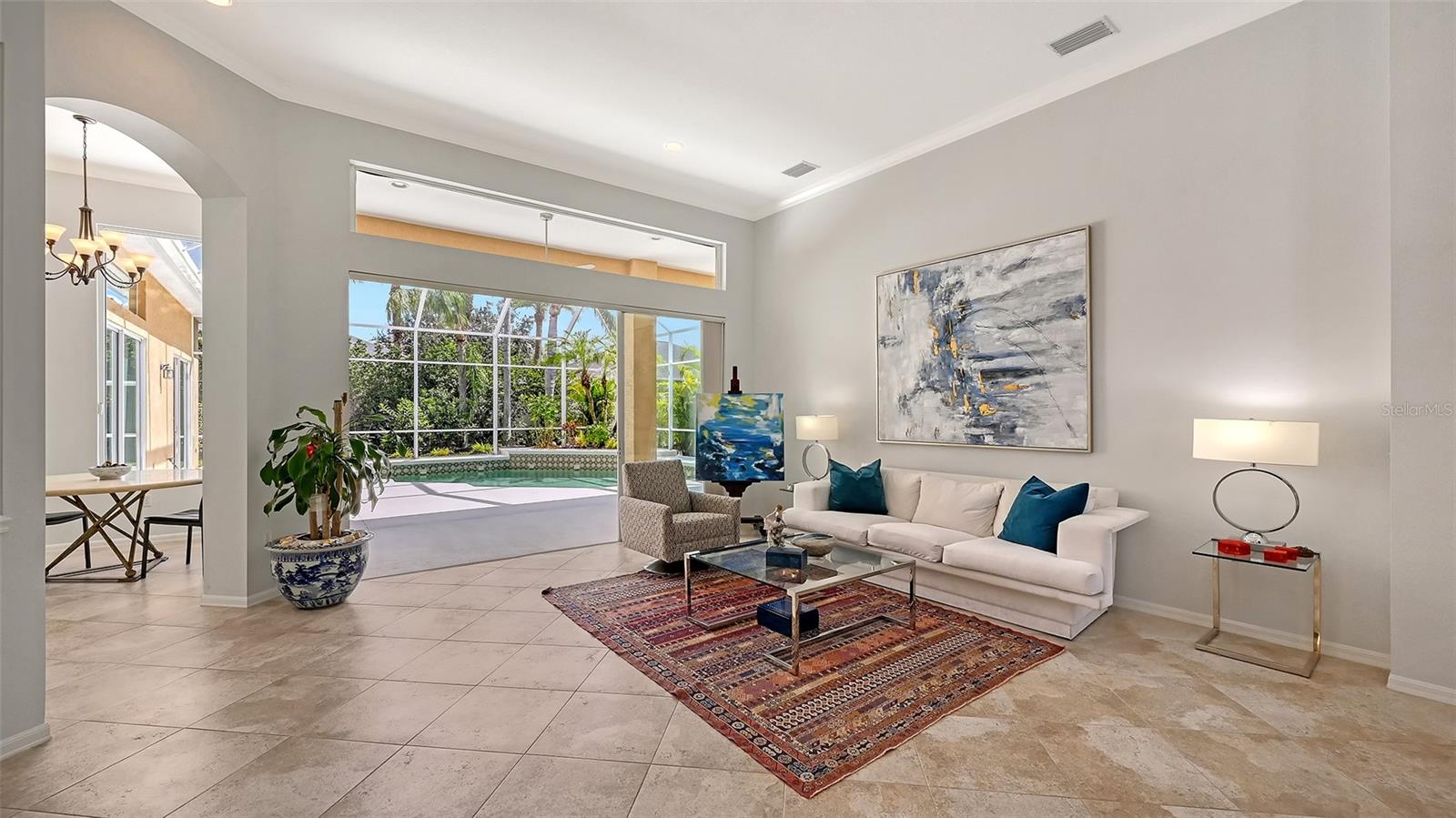 This Neal Communities-built home, featuring four bedrooms and three baths, offers several recent upgrades. The roof is one year old and the property benefits from two air-conditioning zones, with one unit replaced in 2020 and the other being brand new. The exterior boasts a freshly landscaped yard and a newly refurbished pool deck. The spacious interior includes a dining area, a formal living room, a family room and a kitchen designed for entertaining. The bedroom layout provides flexibility and privacy. Two guest bedrooms share a bath and can be separated by a pocket door. Additionally, a bonus room at the rear of the home, complete with a bedroom and full bath, serves as an ideal guest suite. The primary suite is generously sized, featuring a seating area, two closets and a large bath equipped with separate vanities, a soaking tub and a separate shower. The property is situated in University Place, a gated community known for its low HOA fees. Located in the University Parkway corridor, just west of I-75, University Place offers convenient access to various amenities. The UTC mall and numerous surrounding shopping areas provide diverse retail and dining options, including restaurants, gyms and grocery stores. The community itself features two resort-style pools, grilling areas, walking trails, a fitness center and a playground. Sarasota Airport is approximately a 15-minute drive away, enhancing accessibility for residents.