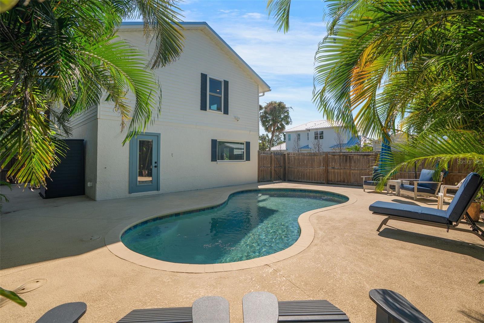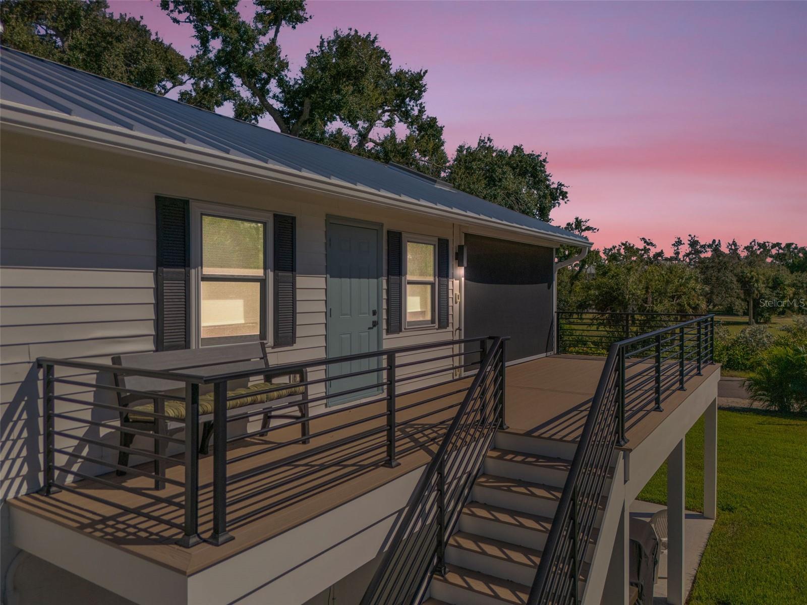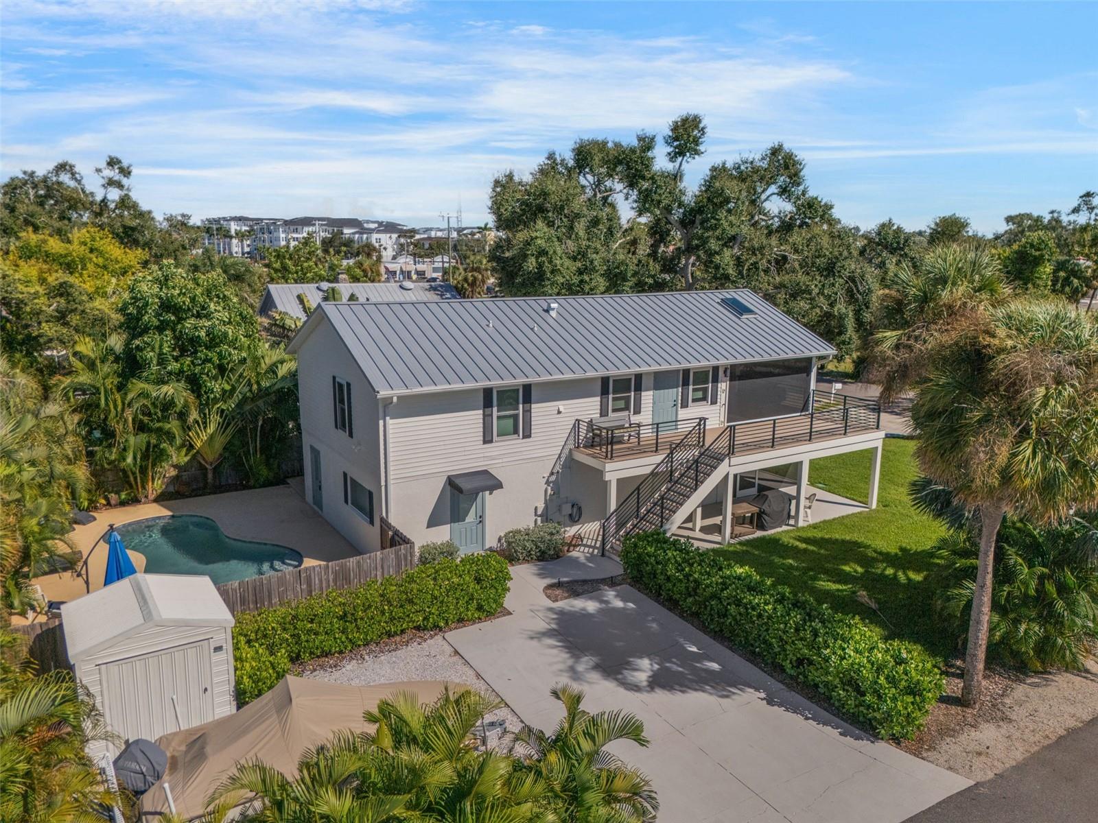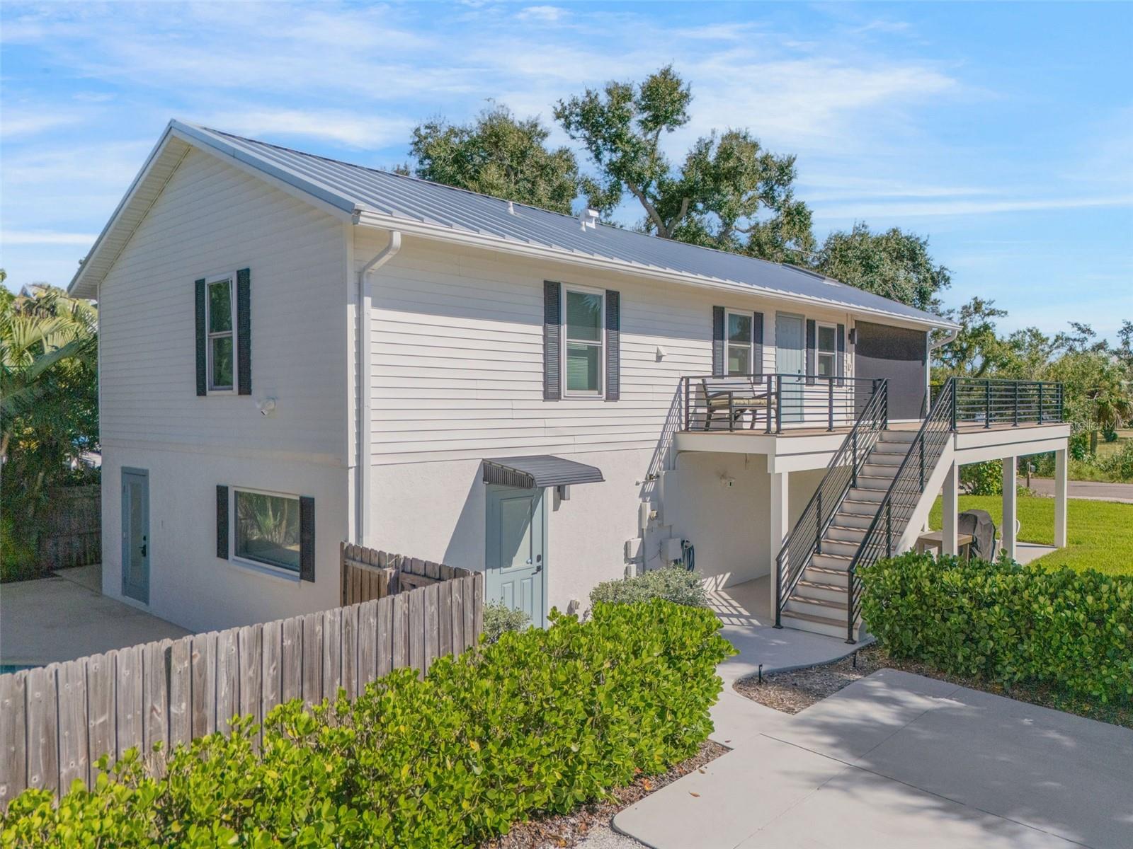 Live like you're on vacation in this updated Key West-style home West of the Trail. Upgrades include a new standing seam metal roof, hurricane impact windows, electric tankless water heater, wraparound "Lifeproof" composite decking, and a custom heated pool. Interior features vaulted ceilings with a mix of travertine, LVP, and tile flooring, plus a kitchen with solid wood cabinets, stainless steel appliances, beadboard ceiling, and custom backsplash. The screened second-story porch has an electronic roll-up system for open-air or enclosed comfort. A unique "hidden" door design allows the home to function as one residence or two separate units, with the lower level offering its own entrance, bedroom, bath, family room, and laundry--perfect for in-laws, guests, or rental income. Outdoors, enjoy lush landscaping, a tropical pool setting, and unbeatable location just a block from the public dock and kayak launch. Minutes to Sarasota, Venice Island, beaches, Legacy Trail, and Spanish Pointe.