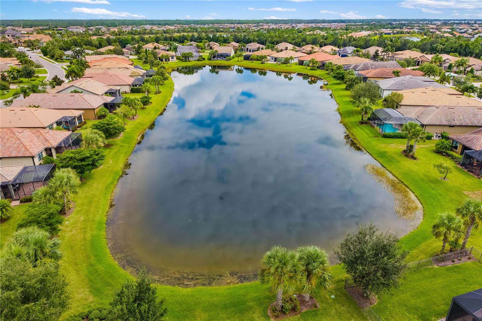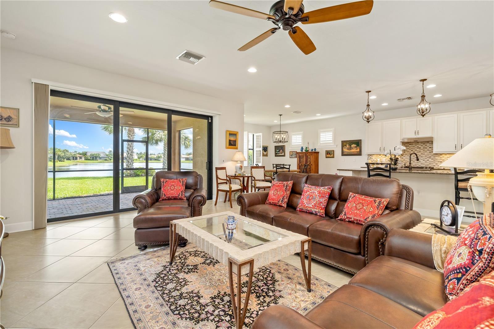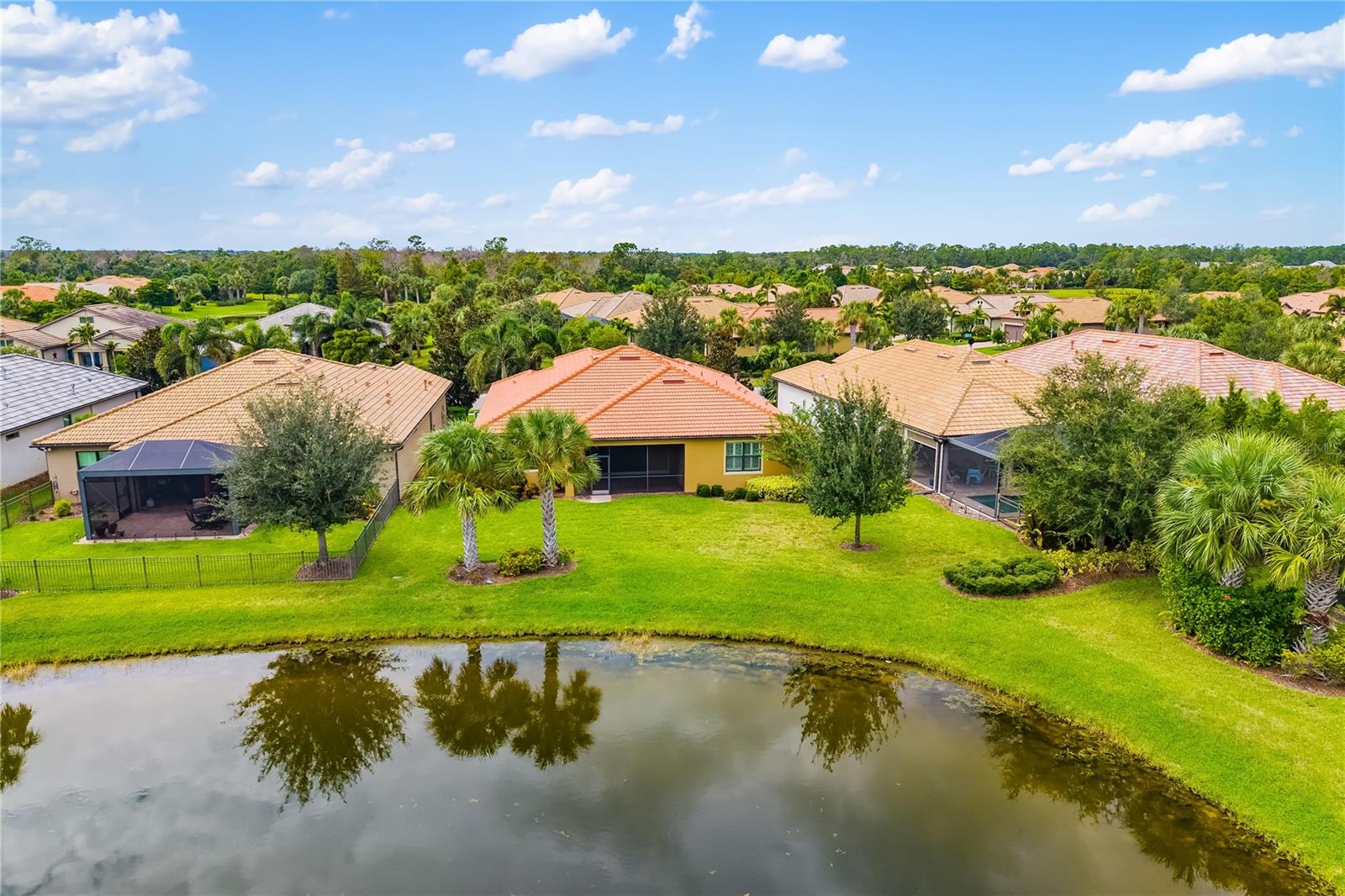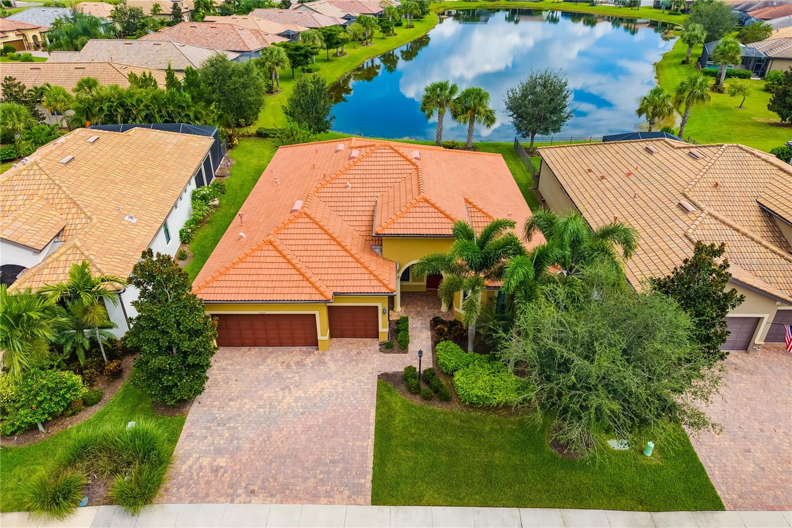 Under contract-accepting backup offers. Welcome to the Dell Webb 55+Community! This stunning~3 Bedroom,~3 Bathroom ~office/den~3 car Garage home features the desirable PINNACLE floor plan. It's packed with fabulous upgrades, including IMPACT WINDOWS AND DOORS, GENERAC GENERATOR, and elegant Plantation Shutters. Nestled alongside a pond, this home boasts a long water view that adds to its charm. EVERY bedroom includes Walk-in closets with built-ins, and the master suite features an Oversized closet for ample storage. Enjoy the beauty of porcelain tile flooring throughout, complemented by engineered hardwood floors in the bedrooms. The 20 x 27 Great Room is perfect for Entertaining and Family Gatherings. Tray ceilings in the Master Bedroom, Guest bedroom and Office. The Gourmet kitchen showcases Antique White Wood Cabinets and Drawers, Tile backsplash, along with a spacious Pantry with all built ins and a large eat-in area overlooking the tranquil water view. The paver lanai offers plenty of room for potential pool addition. The three-car garage with epoxy floors is great for a golf cart or added storage also included is a Large Storage closet. This home is truly fabulous, with countless upgrades and situated in a vibrant neighborhood that offers a resort-style community Pool, Gym, Restaurant, and Exercise classes. Experience a lifestyle where every day feels like a vacation. Don't miss out on this incredible opportunity!
