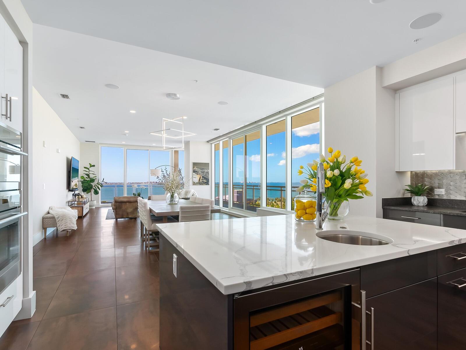 Welcome to BLVD Sarasota, a stunning downtown sanctuary in the sky where luxury living meets extraordinary views from every room. Perched in the desired corner stack of the building, this exclusive residence offers uninterrupted, floor-to-ceiling panoramas of Sarasota Bay and the vibrant city skyline -- all from the comfort of each space in the home. Whether you're waking up in the primary suite, preparing a meal in the chef's kitchen, or hosting guests in the expansive living and dining areas, you're surrounded by natural beauty at every turn. Exit your private elevator into over 5,000 square feet of exquisitely designed indoor-outdoor living. The open floor plan is drenched in natural light from walls of PGT impact-rated glass, ensuring every room becomes a front-row seat to Sarasota's spectacular sunsets, coastal waters and sparkling city lights. The oversized, wrap-around terrace extends your living experience outdoors, offering multiple seating, lounging and dining areas -- all designed to showcase the unrivaled, wrap-around water and city views. Offered turnkey furnished, this residence includes three spacious bedrooms with en-suite baths, a private office and two additional half baths, blending the space and comfort of a single-family home with the ease of elevated condominium living. Interior features include soaring 11-foot ceilings, Lutron-controlled lighting, motorized window shades, premium finishes, and designer-selected furnishings that elevate the elegance throughout. The gourmet kitchen is a showpiece with custom gray Irpinia cabinetry, quartz countertops and top-of-the-line appliances -- all positioned to ensure you never miss a moment of the view. Entertain effortlessly with two oversized pantries, dual sinks and generous storage. The primary suite is a retreat, offering breathtaking vistas right from bed, along with dual custom walk-in closets and a spa-inspired bath with a soaking tub, frameless glass shower, and refined Kohler fixtures. BLVD Sarasota is a lifestyle unlike any other, offering residents top-tier amenities such as a rooftop infinity-edge pool, outdoor kitchen, wine cellar, state-of-the-art fitness center, golf simulator and a fifth-floor pet lawn with a grooming station. Enjoy two premium parking spaces, a private elevator entrance and a humidity-controlled storage locker. Just a short distance from the 53-acre Bay Park and Sarasota's world-class dining, arts and marina scene, this is more than a home -- it's your front-row seat to the best of the Gulf Coast. Residence 1201 is not just a place to live -- it's a window to the world, where every room frames an unforgettable view. Seller to include a $50,000, 1000 North resident-only membership to the building's forthcoming private social and supper club, opening in late 2025, offering exclusive culinary experiences, event access and perks solely for residents.