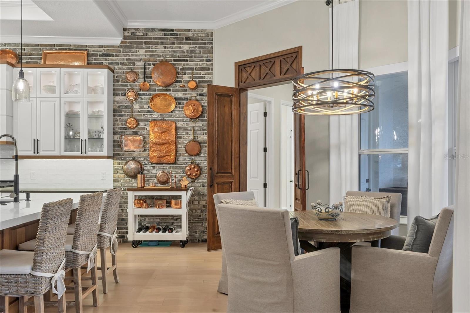 In the prestigious, gated Lakewood Ranch Country Club, with one of the most expansive and stunning golf course views, this beautiful four-bedroom, three-bath plus office residence blends modern sophistication with timeless architecture. The beautifully landscaped exterior and paver drive lead to an inviting double-door entry framed by stately arches and elegant transom windows. Inside, an open and airy floor plan unfolds beneath soaring tray ceilings with wood beam detailing and designer lighting. The great room showcases a dramatic custom feature wall with built-in shelving, shiplap accents, and warm wood tones ideally balanced by sleek contemporary finishes. Expansive glass sliders open to the lanai, creating seamless indoor-outdoor living with tranquil views of the pool, lush greenery and golf course beyond. The chef's kitchen is a showpiece featuring bright white cabinetry, quartz countertops, a six-burner gas range, built-in refrigerator and an oversized island with designer pendants, a showstopping stone accent wall and casual seating. A secondary island with open shelving provides additional prep space and storage, while the dining nook enjoys abundant natural light and views of the lanai. Entertain effortlessly outdoors with a full summer kitchen boasting stainless steel appliances, custom cabinetry, and a bar-height counter for dining al fresco. The screened lanai offers ample lounging space beside the sparkling pool, all framed by mature landscaping and sweeping sunset vistas. A spacious primary suite provides a serene retreat with high ceilings, sitting area and sliding glass doors to the pool. The spa-inspired bath features dual vanities, a soaking tub and an oversized walk-in shower. Three additional bedrooms, an oversized private office with beautiful, custom built-in shelving, and elegant formal dining with a glass enclosed wine storage provide versatility for everyday living and elegant entertaining. In one of Lakewood Ranch's sought-after enclaves, residents enjoy access to world-class amenities including three championship golf courses, tennis, pickleball, fitness center, resort-style pools and an active social calendar, all within minutes of premier dining, shopping and vibrant Lakewood Ranch Main Street.