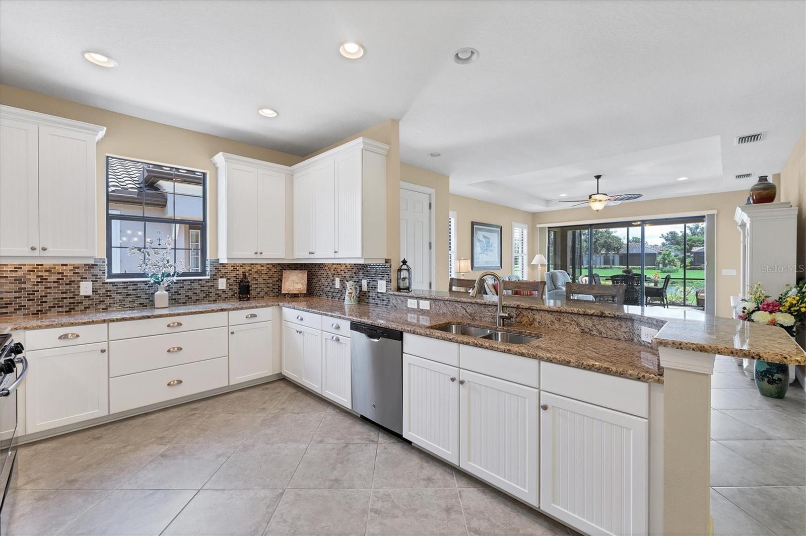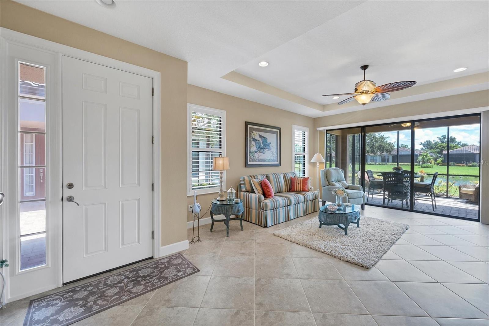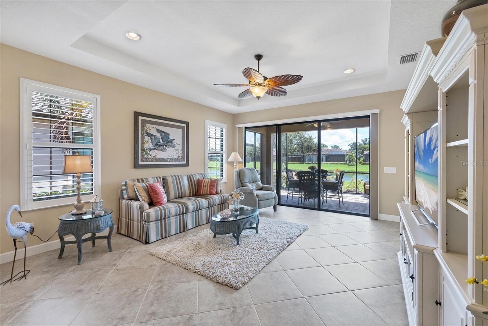 Situated in the highly desirable Esplanade by Siesta Key community, this maintenance-free villa is just minutes away from downtown Sarasota and the pristine, crystal-sand beaches of Siesta Key. Enjoy breathtaking water views from multiple vantage points within the villa. The living room opens up to an expansive lake view that creates a serene atmosphere. The kitchen is equipped with generous granite counters, making it both functional and stylish. This villa offers two en suite bedrooms, a third bedroom, and an office or den that can also serve as an additional guest room. The primary bedroom boasts impressive lake views, an en suite bathroom with double sinks, a spacious shower, and a large walk-in closet. The den provides a quiet, inviting space for work or relaxation. Step onto the extended lanai and experience the beauty of lush foliage and shimmering lake views. Whether enjoying a morning cup of coffee or a sunset dinner, the lanai offers the perfect setting for peaceful outdoor living. The villa has been "lightly lived-in," as the owners only reside here for short periods each year. Upgrades include Plantation shutters throughout, ceiling fans, granite countertops in the kitchen and bathrooms, custom cabinets in the laundry room, hurricane shutters, lanai pre-wired and plumbed for a summer kitchen, epoxy flooring in the garage, gutters, and a hurricane-resistant garage door. Esplanade by Siesta Key offers a variety of first-class amenities, including an elegant Amenity Center, pool and spa, a fully equipped fitness room, pickle ball court, Har-Tru tennis court, and a dog park. Residents can participate in a full menu of social activities and enjoy the benefits of no CDD fees and no hurricane concerns. This is a rare opportunity to experience Sarasota living at its finest. Furniture is optional.