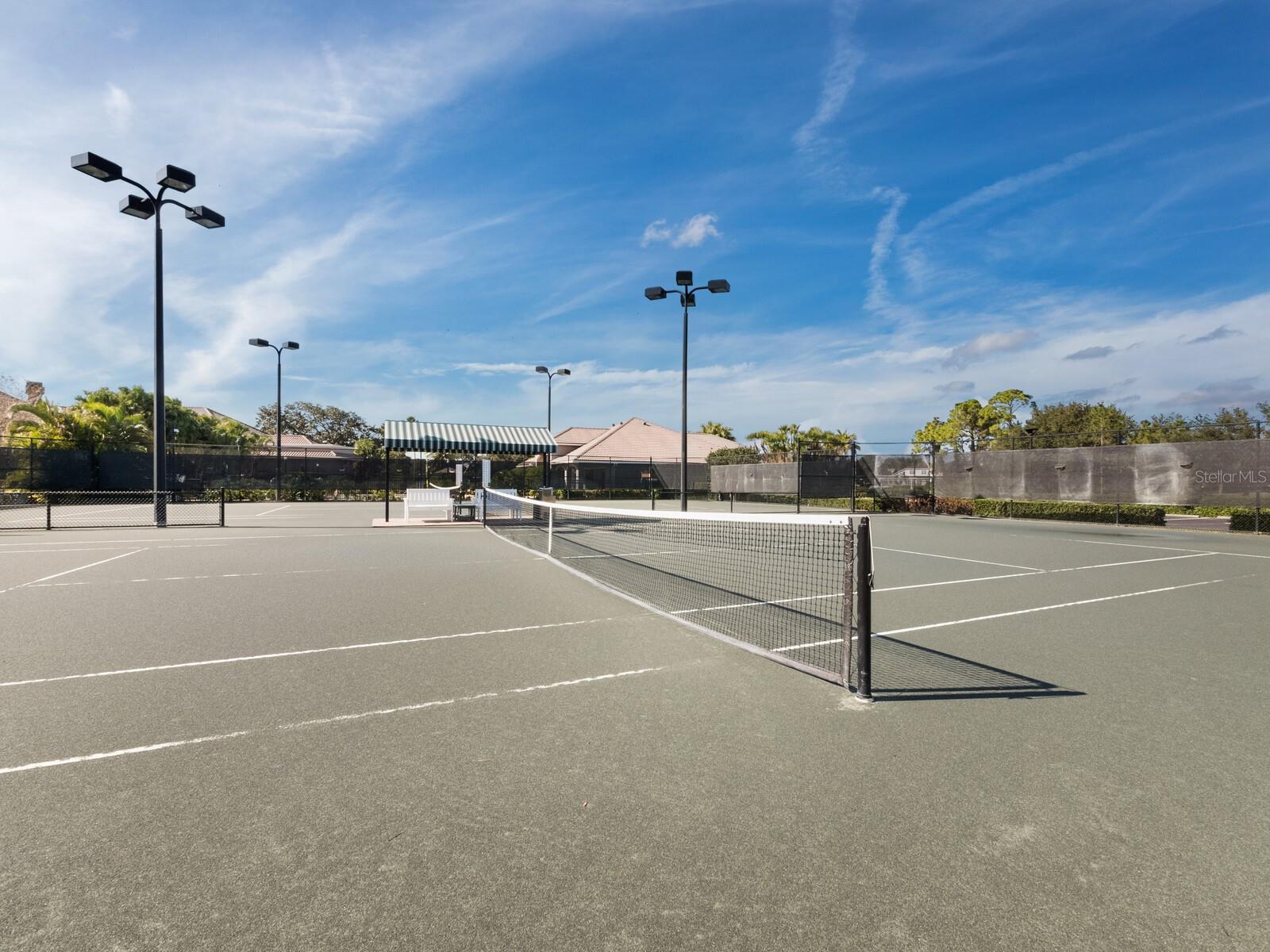 - Exterior: Lighting, Private Mailbox, Rain Gutters, Sidewalk, Sliding Doors, Tennis Court(s)