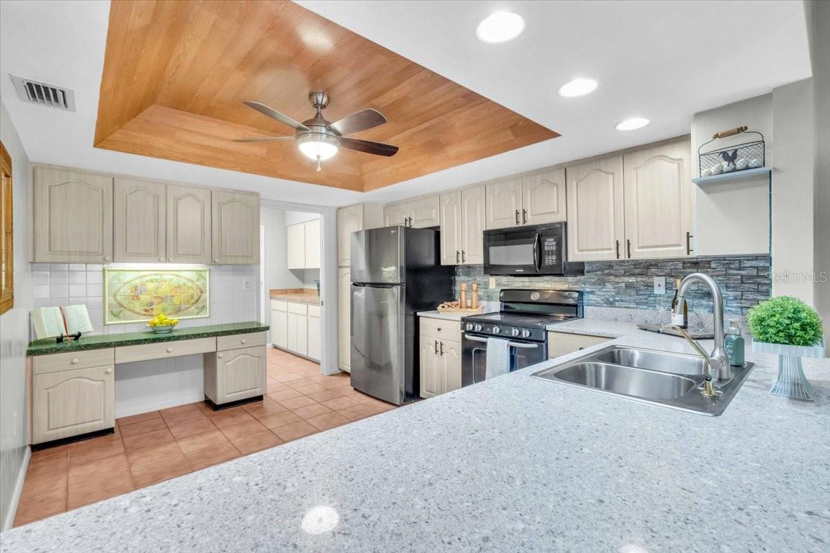 Holiday Special: PRICE IMPROVED by $15k! Saddle Up for Style in the 55+ community of Center Gate Villages 5!Welcome to this rarely available, well-maintained, and one-of-a-kind spacious 3-bedroom, 2-bath villanestled in the heart of the coveted Center Gate Estates. With a nod to western charm and a warm, welcoming vibe and high ceilings, this large home is perfect for anyone seeking character, comfort, and convenience.Step into a roomy foyerthat sets the tone for versatility--your first guest bedroom is to the left, complete with custom built-in shelving and storage, ideal as a den or home office. To the right, the home opens into a western-inspired family roomfeaturing custom saloon doors, a high-top bar setup, and sun-drenched windows--just add a pool table and you've got your very own at-home saloon! This can easily be used a dining room, family room, playroom, your choice! The open-concept kitchen and living roomare made for entertaining, with new quartz countertops, fresh paint, updated lighting, water filtration system, and a stone-faced wood-burning fireplaceunder soaring cathedral ceilingsand a skylight. Sliders lead to the enclosed screened-in Florida room, now upgraded with accordion shutters and glass sliders, creating a seamless indoor-outdoor flow. All bedrooms are generously sized with ample closet space, and the primary suiteoffers a peaceful retreat. As matter of fact, all rooms are spacious including the interior laundry room with new washer and the 2-car garage, both featuring a ton of cabinet space. Enjoy your morning coffee on the long side patioor in the Florida room facing the nature preserves in the back, both perfect for soaking up the Florida sunshine.Recent updates include: Water Heater (2018), HVAC (2018), Refrigerator (2018), Range (2016), Microwave (2011), Washer (2024), primary bathroom shower. Located just steps from the community pool, and minutes from shopping, dining, hospitals, I-75, beaches, UTC Mall, golf courses, and more--this home offers the hassle-free lifestyleof a maintenance-free communitywith all the perks of Sarasota living.Priced to sell--don't miss your chance to own this unique gem! Schedule your showing today and experience the charm for yourself. Check out the property website!