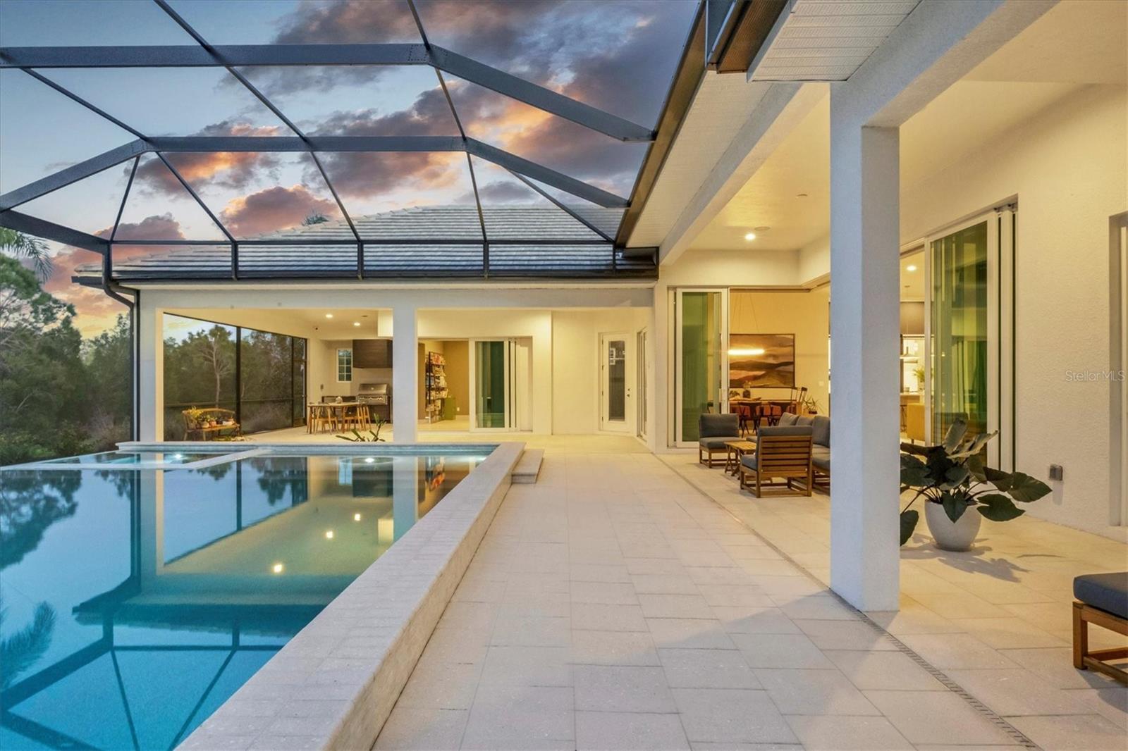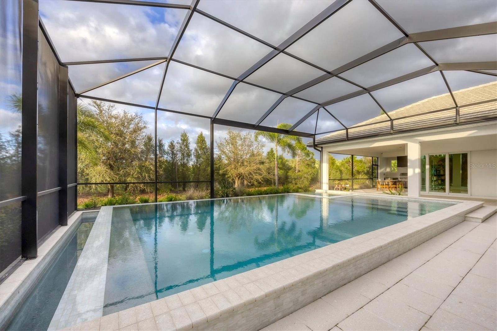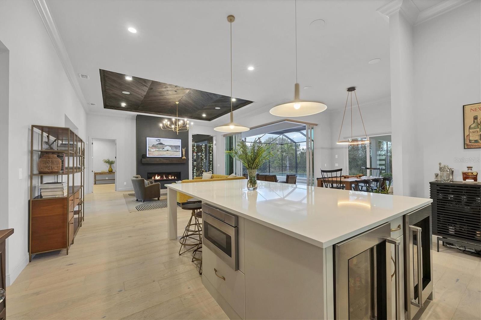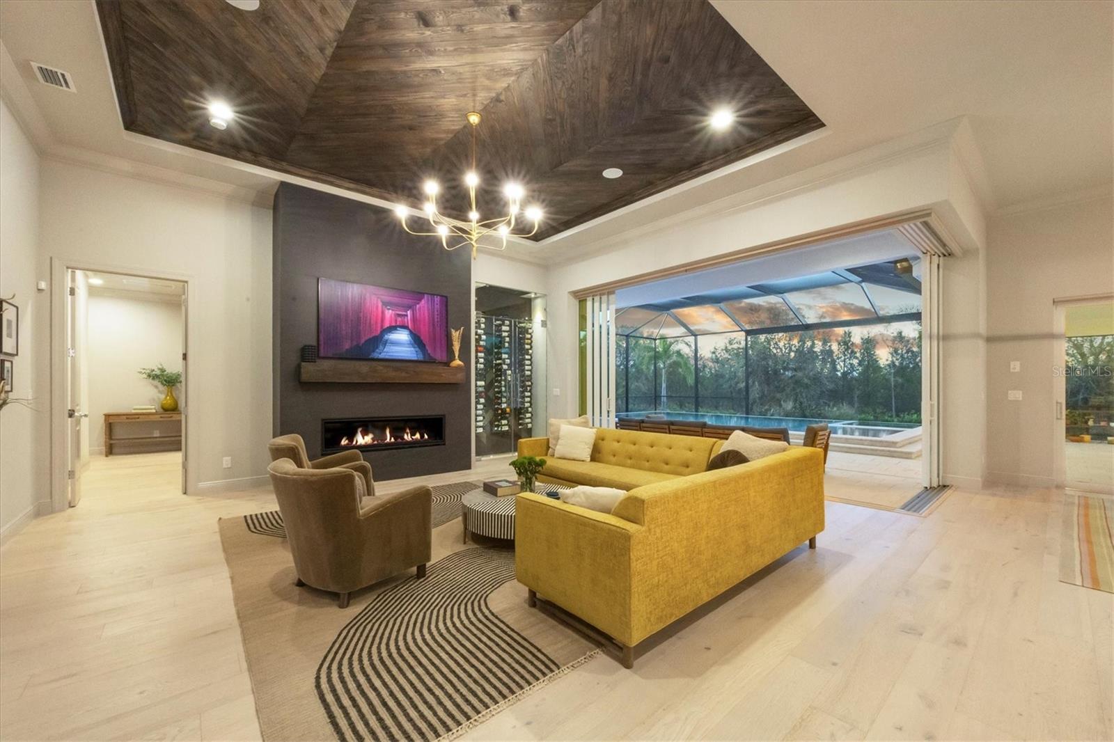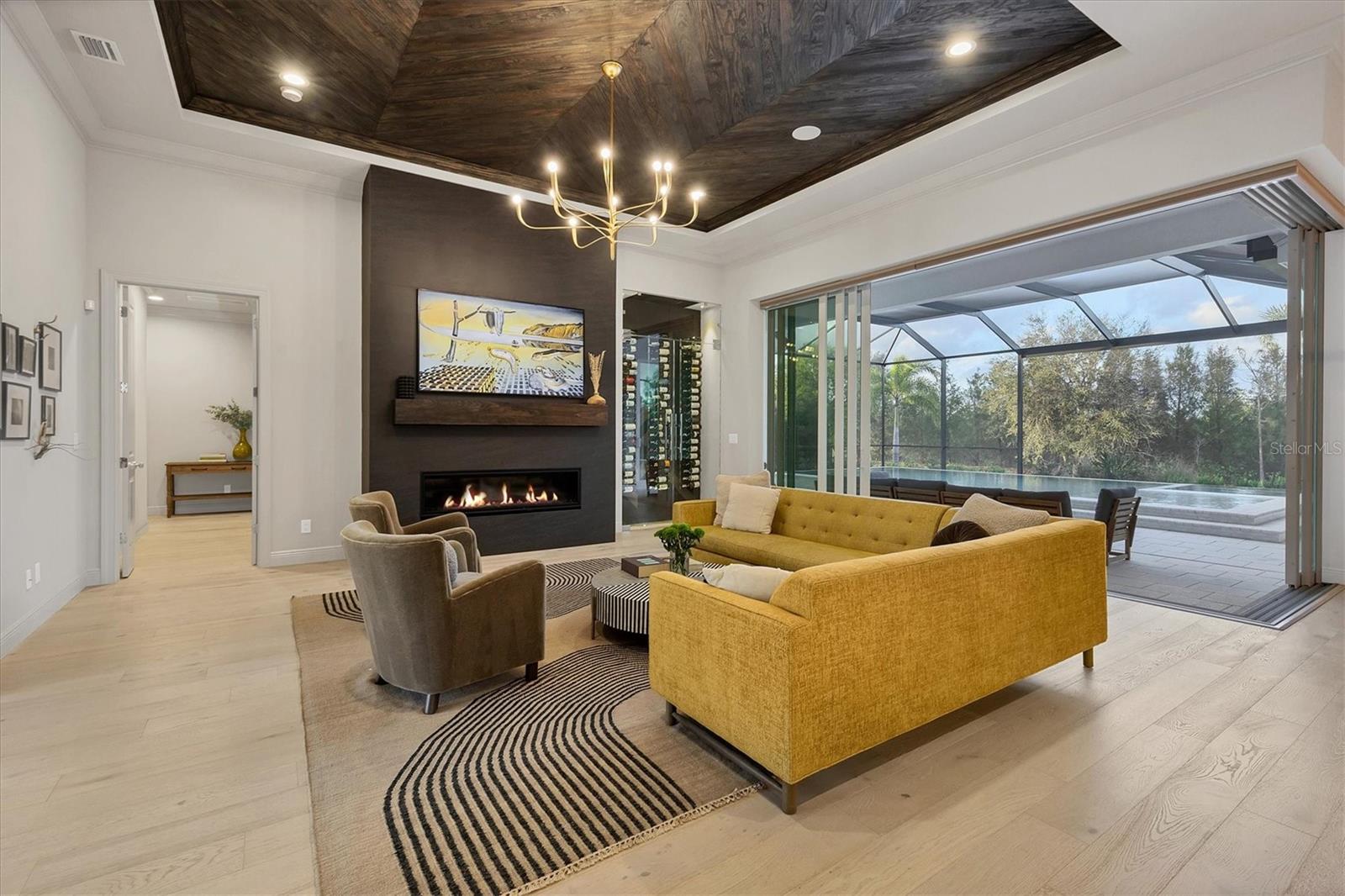 On a quiet preserve in the exclusive gated enclave of Country Club East, this exceptional John Cannon residence showcases refined craftsmanship, modern luxury, and seamless indoor-outdoor living. Designed for comfort and impact, the home features impact-rated windows and doors, a full-house generator, and an open layout that's as functional as it is beautiful. Enter through 10-foot iron and glass double doors into a dramatic great room with whitewashed European oak flooring, soaring 13-foot ceilings with chevron wood detail, and a striking natural gas fireplace framed by Basalt volcanic tile and reclaimed wood mantle. A custom Whisperkool wine wall holds up to 130 bottles, accented by a chevron Stickwood backdrop. The main foyer features a hidden closet for bags and shoes. The chef's kitchen boasts Sub-Zero and Wolf appliances, a six-burner range, built-in oven and microwave, quartz countertops, a prep island outfitted with pullout drawers, two for spices, a farmhouse sink and a standalone ice maker. An entertaining-sized island outside the kitchen features Sub-Zero beverage and wine coolers, an additional microwave and ample hidden storage. A spacious walk-in pantry is nearby and includes a built-in tall closet. The great room's 10-foot sliders fold back into a disappearing corner and lead to the expansive lanai with a PebbleTec infinity-edge heated saltwater pool and spa, panoramic screen enclosure, Shell Lock pavers and a fully outfitted summer kitchen with Alfresco grill, Trailwinds hood, True ice machine, Uline refrigerator and Blanco sink. The private owner's wing includes two walk-in closets, tray ceiling with crown molding, lanai access, and a spa-style bath with radiant heated floors and a steam shower. Two guest suites are positioned in separate wings, each with its full bath and walk-in closet, one with a private entrance and drop zone, the other with pool bath access. Additional living spaces include a bonus room with 10-foot sliders as a second disappearing corner as well as a study/exercise room with 15-foot ceilings. The laundry room features abundant cabinet storage, designer tile, sink and an additional 60 square feet of dedicated storage carved out behind two double doors. Adding even more value, the home is equipped with a whole-house water filtration system, designer lighting, automatic blinds and an oversized three-car garage. Every detail of this home has been thoughtfully curated for elevated living in one of Lakewood Ranch's prestigious communities.