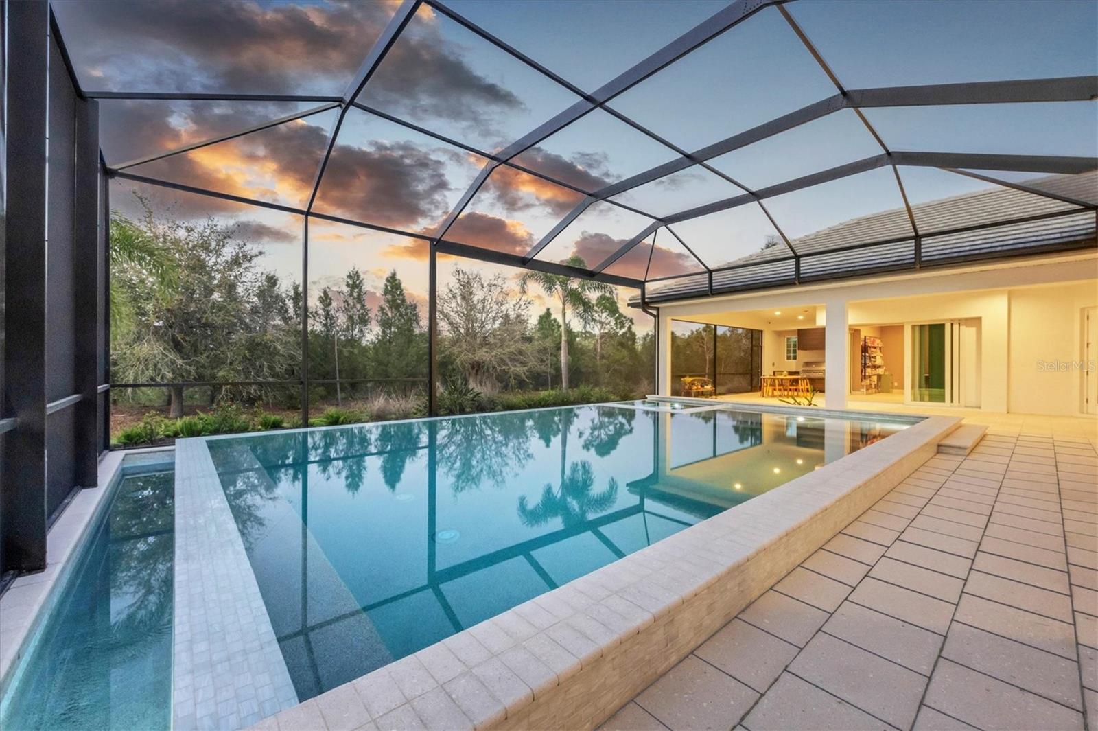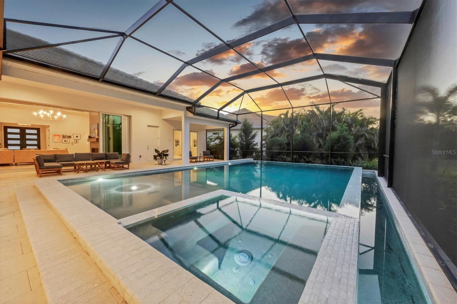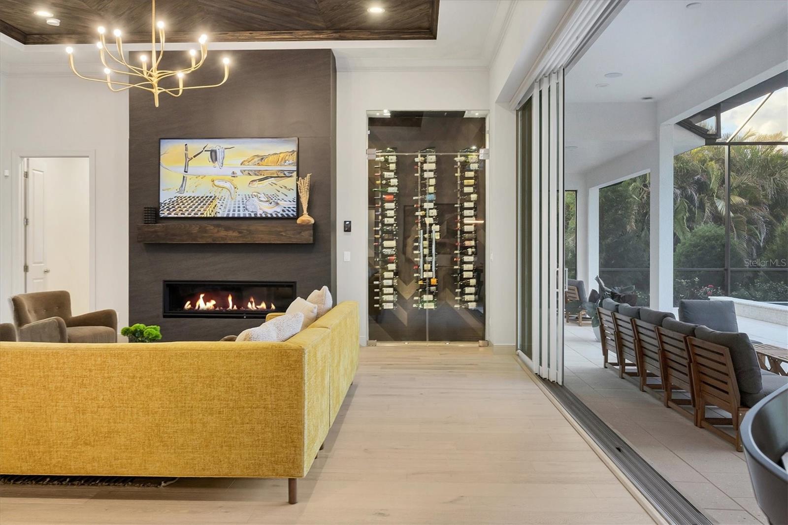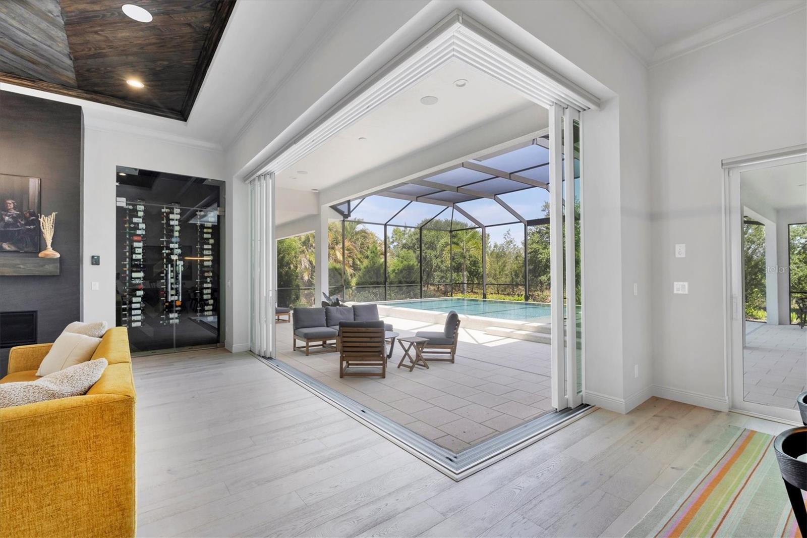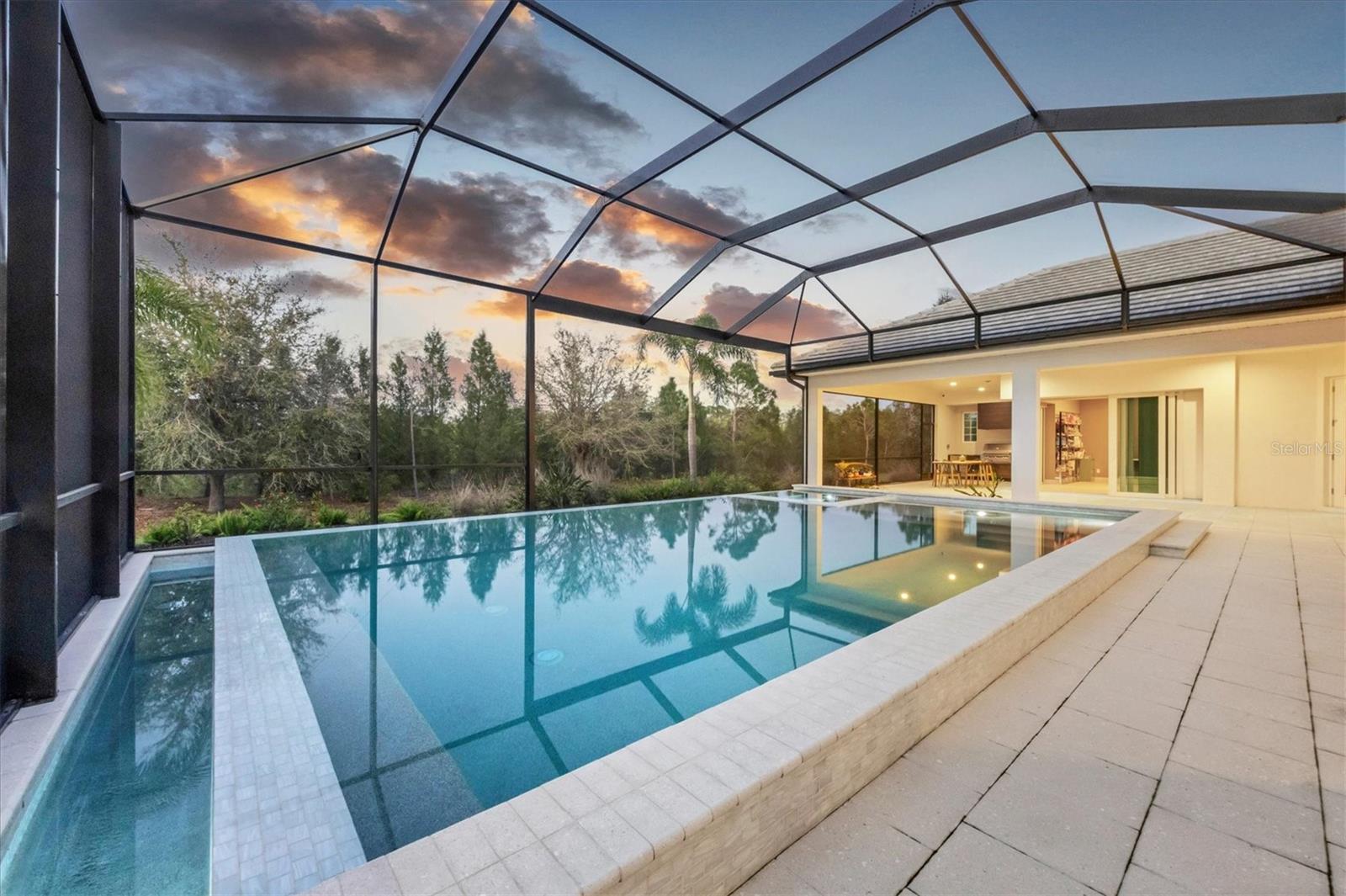 On a quiet preserve in the exclusive gated enclave of Country Club East, this exceptional John Cannon residence showcases refined craftsmanship, modern luxury, and seamless indoor-outdoor living. Designed for comfort and impact, the home features impact-rated windows and doors, a full-house generator, and an open layout that's as functional as it is beautiful. Enter through 10-foot iron and glass double doors into a dramatic great room with whitewashed European oak flooring, soaring 13-foot ceilings with chevron wood detail, and a striking natural gas fireplace framed by Basalt volcanic tile and reclaimed wood mantle. A custom Whisperkool wine wall holds up to 130 bottles, accented by a chevron Stickwood backdrop. The main foyer features a hidden closet for bags and shoes. The chef's kitchen boasts Sub-Zero and Wolf appliances, a six-burner range, built-in oven and microwave, quartz countertops, a prep island outfitted with pullout drawers, two for spices, a farmhouse sink and a standalone ice maker. An entertaining-sized island outside the kitchen features Sub-Zero beverage and wine coolers, an additional microwave and ample hidden storage. A spacious walk-in pantry is nearby and includes a built-in tall closet. The great room's 10-foot sliders fold back into a disappearing corner and lead to the expansive lanai with a PebbleTec infinity-edge heated saltwater pool and spa, panoramic screen enclosure, Shell Lock pavers and a fully outfitted summer kitchen with Alfresco grill, Trailwinds hood, True ice machine, Uline refrigerator and Blanco sink. The private owner's wing includes two walk-in closets, tray ceiling with crown molding, lanai access, and a spa-style bath with radiant heated floors and a steam shower. Two guest suites are positioned in separate wings, each with its full bath and walk-in closet, one with a private entrance and drop zone, the other with pool bath access. Additional living spaces include a bonus room with 10-foot sliders as a second disappearing corner as well as a study/exercise room with 15-foot ceilings. The laundry room features abundant cabinet storage, designer tile, sink and an additional 60 square feet of dedicated storage carved out behind two double doors. Adding even more value, the home is equipped with a whole-house water filtration system, designer lighting, automatic blinds and an oversized three-car garage. Every detail of this home has been thoughtfully curated for elevated living in one of Lakewood Ranch's prestigious communities.