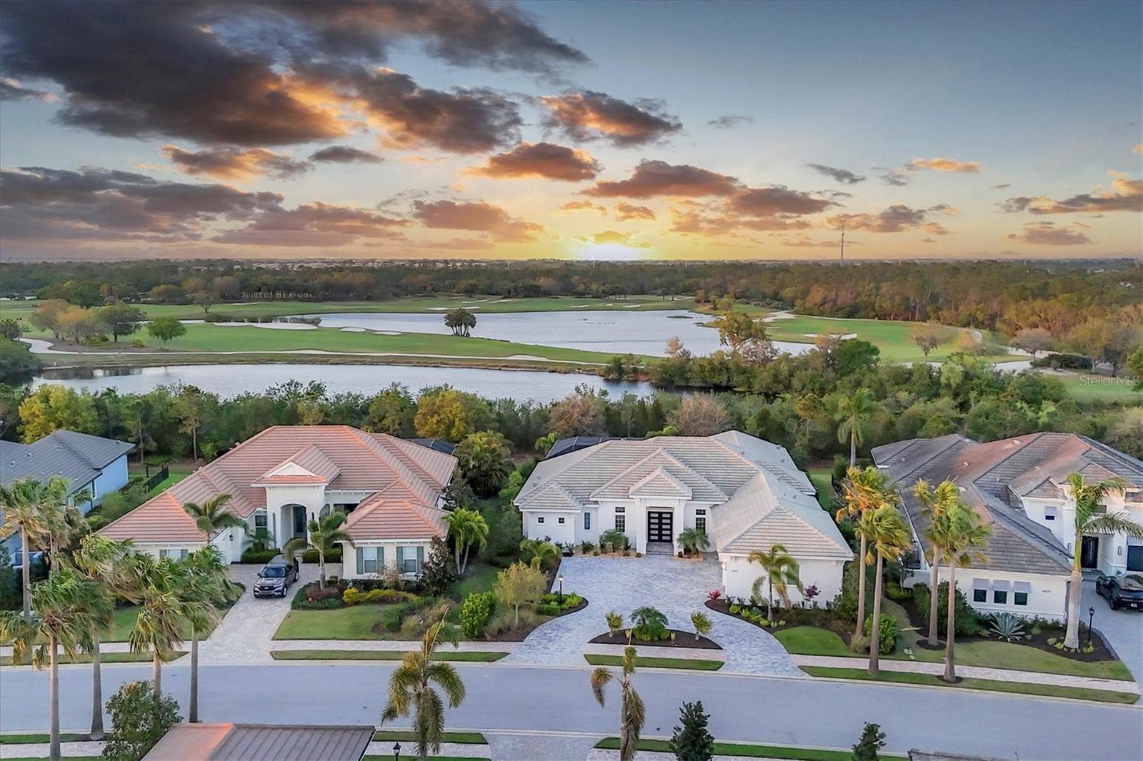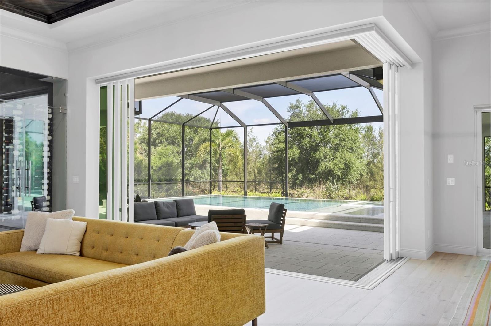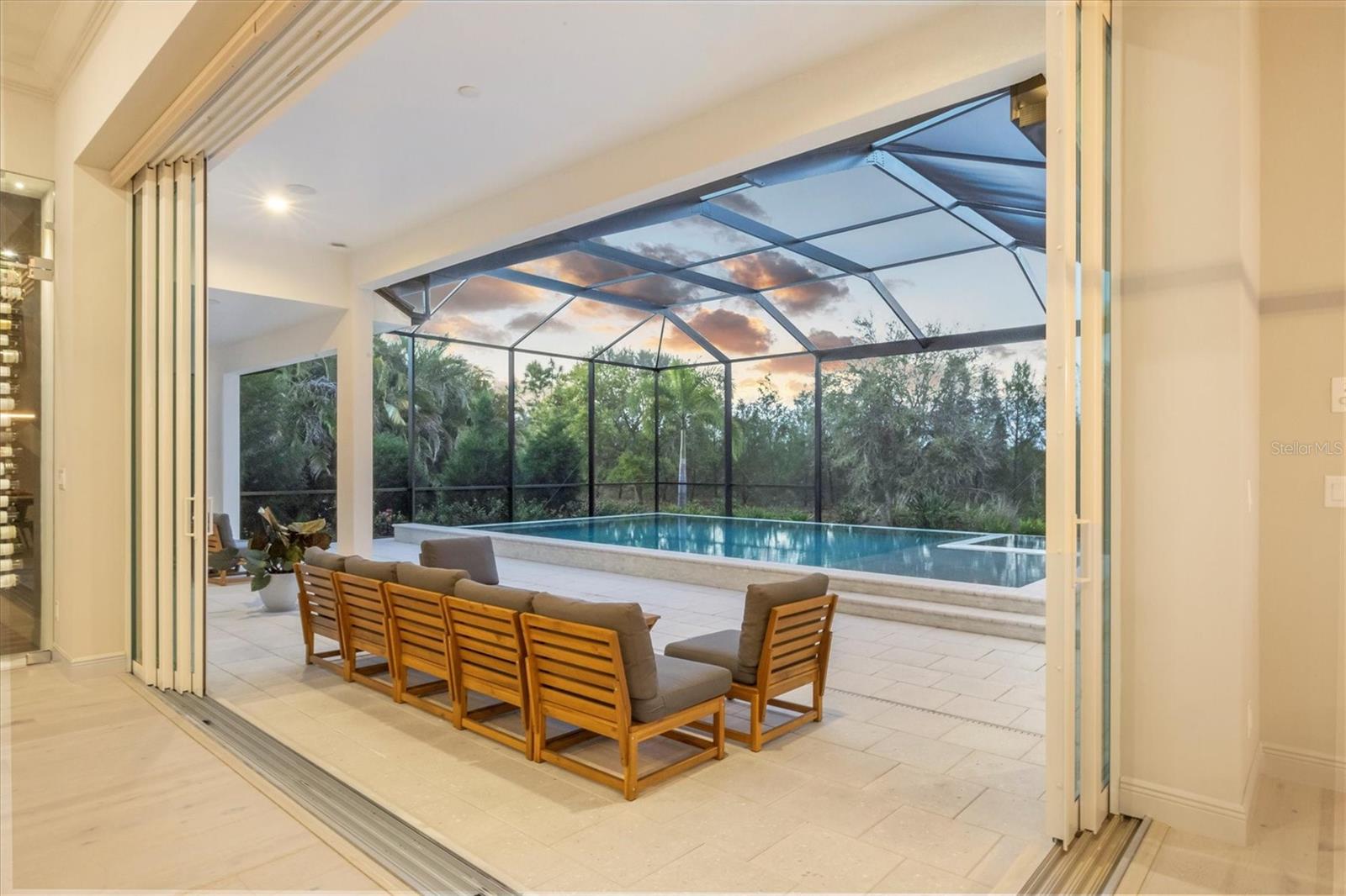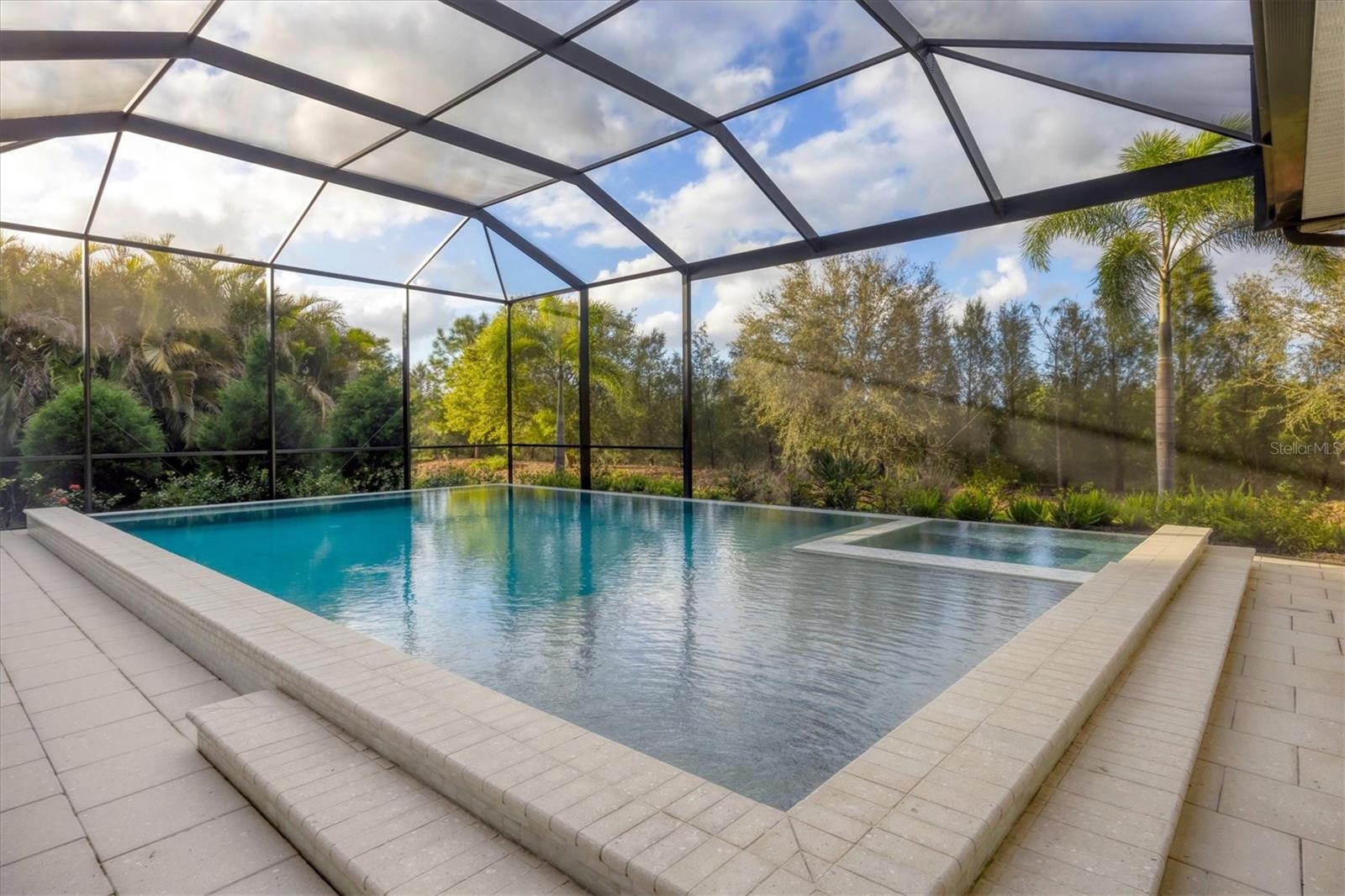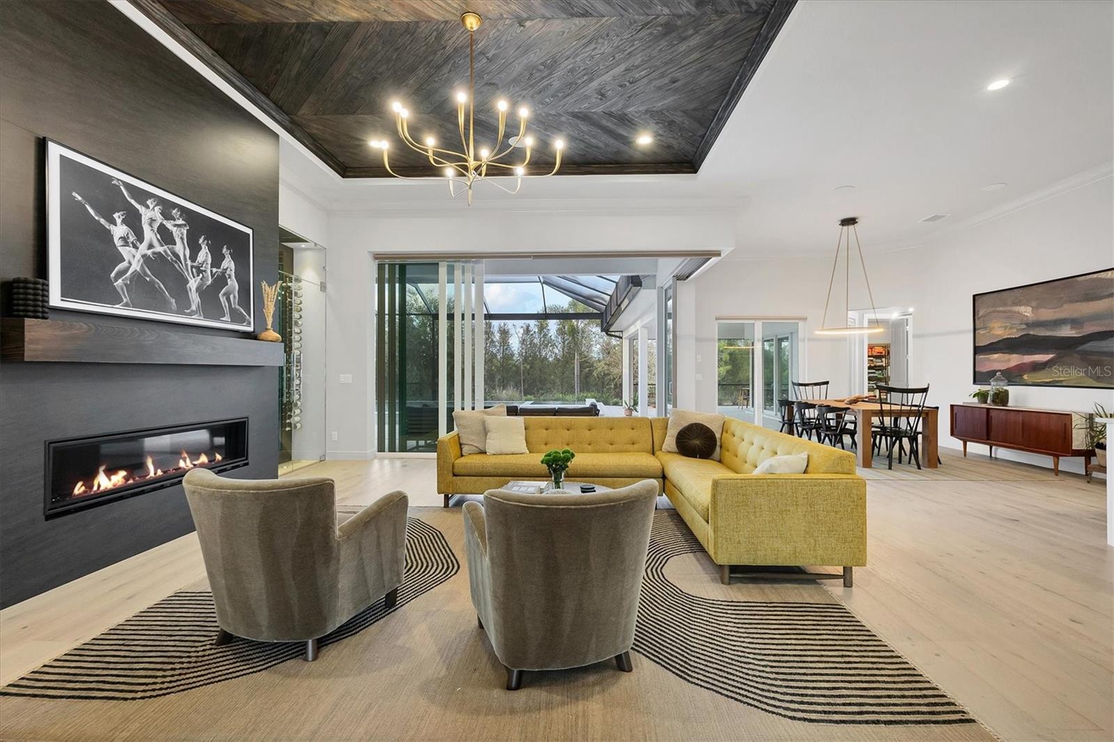 On a quiet preserve in the exclusive gated enclave of Country Club East, this exceptional John Cannon residence showcases refined craftsmanship, modern luxury, and seamless indoor-outdoor living. Designed for comfort and impact, the home features impact-rated windows and doors, a full-house generator, and an open layout that's as functional as it is beautiful. Enter through 10-foot iron and glass double doors into a dramatic great room with whitewashed European oak flooring, soaring 13-foot ceilings with chevron wood detail, and a striking natural gas fireplace framed by Basalt volcanic tile and reclaimed wood mantle. A custom Whisperkool wine wall holds up to 130 bottles, accented by a chevron Stickwood backdrop. The main foyer features a hidden closet for bags and shoes. The chef's kitchen boasts Sub-Zero and Wolf appliances, a six-burner range, built-in oven and microwave, quartz countertops, a prep island outfitted with pullout drawers, two for spices, a farmhouse sink and a standalone ice maker. An entertaining-sized island outside the kitchen features Sub-Zero beverage and wine coolers, an additional microwave and ample hidden storage. A spacious walk-in pantry is nearby and includes a built-in tall closet. The great room's 10-foot sliders fold back into a disappearing corner and lead to the expansive lanai with a PebbleTec infinity-edge heated saltwater pool and spa, panoramic screen enclosure, Shell Lock pavers and a fully outfitted summer kitchen with Alfresco grill, Trailwinds hood, True ice machine, Uline refrigerator and Blanco sink. The private owner's wing includes two walk-in closets, tray ceiling with crown molding, lanai access, and a spa-style bath with radiant heated floors and a steam shower. Two guest suites are positioned in separate wings, each with its full bath and walk-in closet, one with a private entrance and drop zone, the other with pool bath access. Additional living spaces include a bonus room with 10-foot sliders as a second disappearing corner as well as a study/exercise room with 15-foot ceilings. The laundry room features abundant cabinet storage, designer tile, sink and an additional 60 square feet of dedicated storage carved out behind two double doors. Adding even more value, the home is equipped with a whole-house water filtration system, designer lighting, automatic blinds and an oversized three-car garage. Every detail of this home has been thoughtfully curated for elevated living in one of Lakewood Ranch's prestigious communities.
