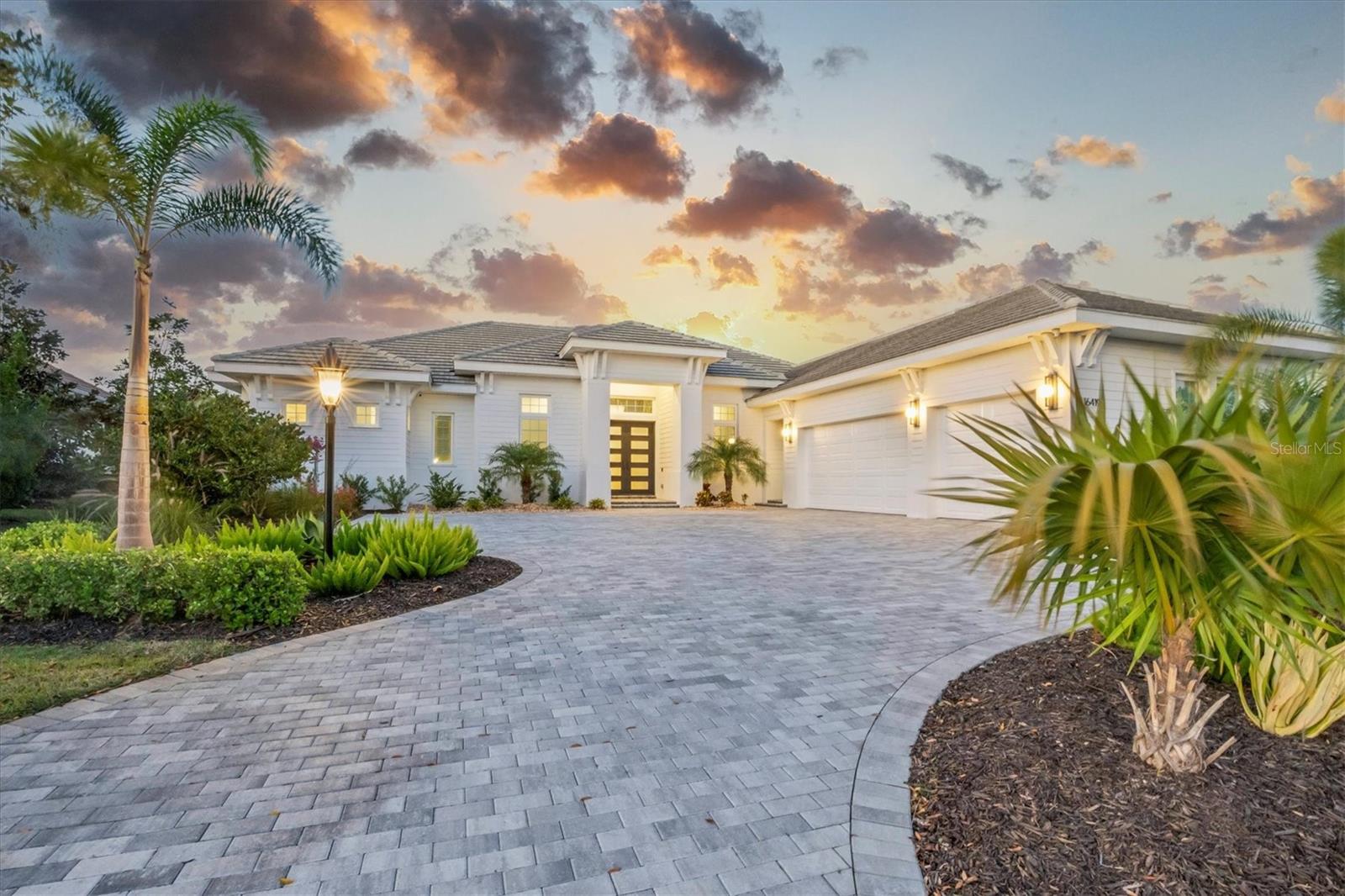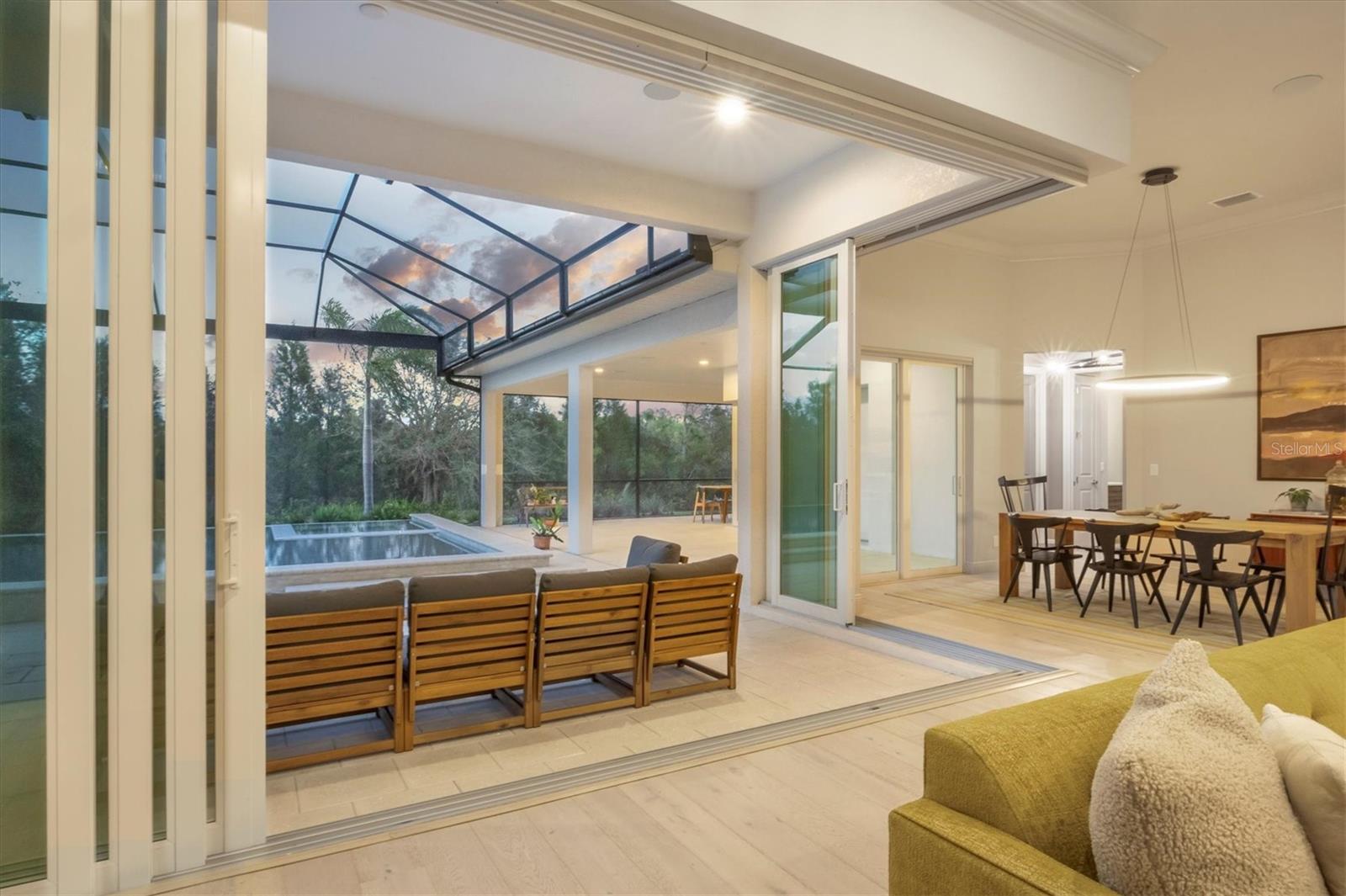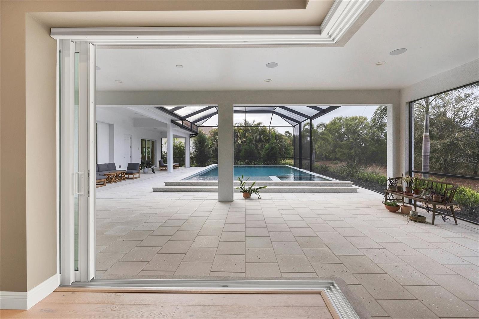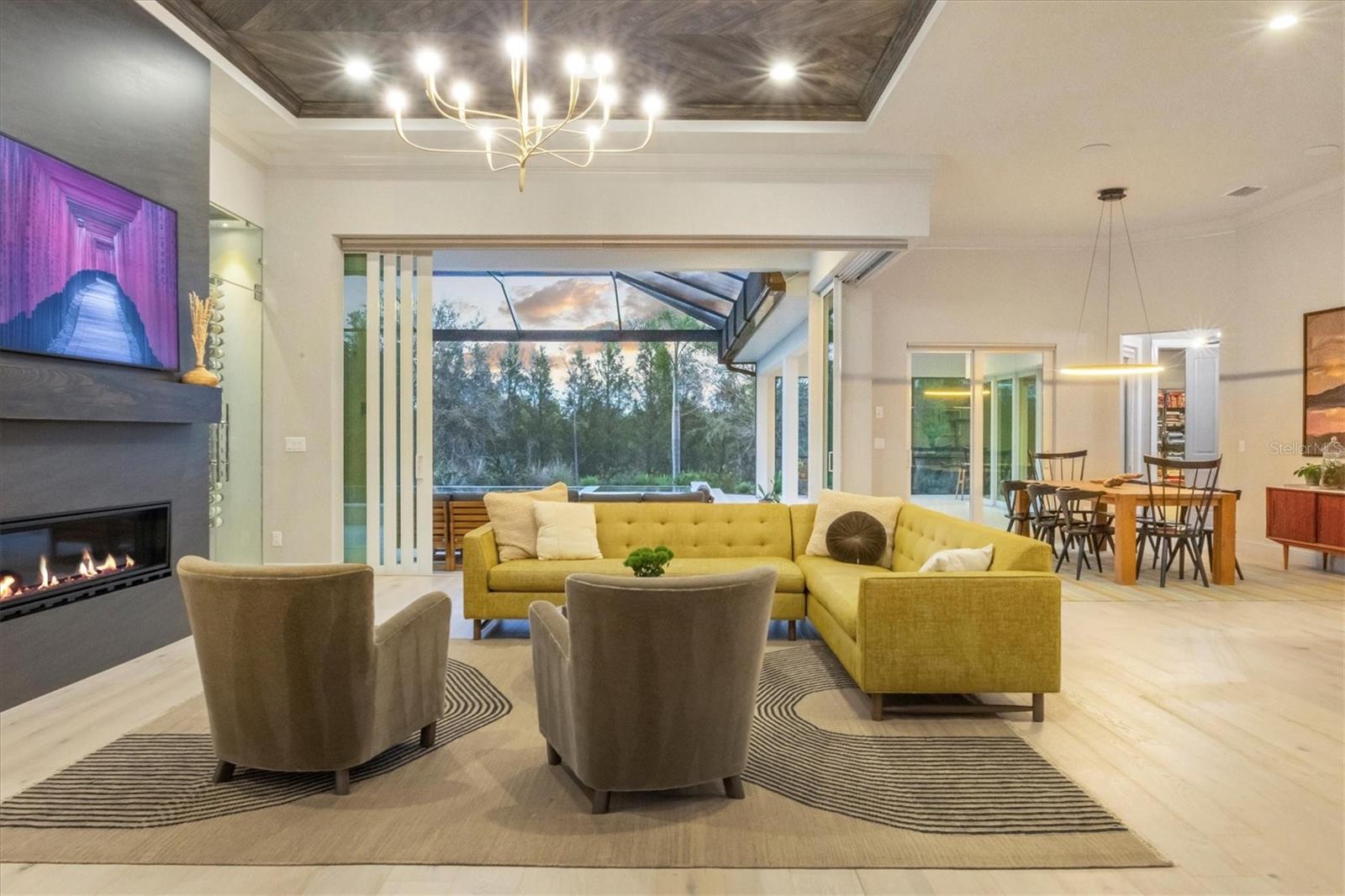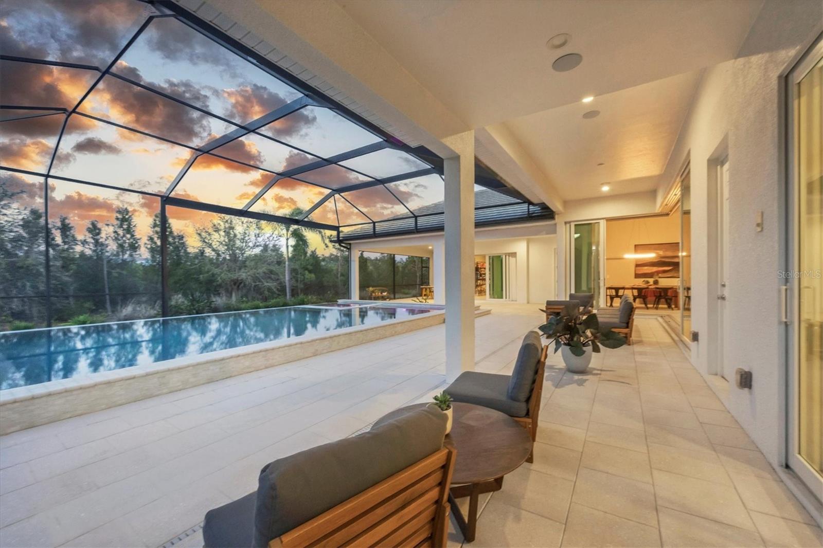 On a quiet preserve in the exclusive gated enclave of Country Club East, this exceptional John Cannon residence showcases refined craftsmanship, modern luxury, and seamless indoor-outdoor living. Designed for comfort and impact, the home features impact-rated windows and doors, a full-house generator, and an open layout that's as functional as it is beautiful. Enter through 10-foot iron and glass double doors into a dramatic great room with whitewashed European oak flooring, soaring 13-foot ceilings with chevron wood detail, and a striking natural gas fireplace framed by Basalt volcanic tile and reclaimed wood mantle. A custom Whisperkool wine wall holds up to 130 bottles, accented by a chevron Stickwood backdrop. The main foyer features a hidden closet for bags and shoes. The chef's kitchen boasts Sub-Zero and Wolf appliances, a six-burner range, built-in oven and microwave, quartz countertops, a prep island outfitted with pullout drawers, two for spices, a farmhouse sink and a standalone ice maker. An entertaining-sized island outside the kitchen features Sub-Zero beverage and wine coolers, an additional microwave and ample hidden storage. A spacious walk-in pantry is nearby and includes a built-in tall closet. The great room's 10-foot sliders fold back into a disappearing corner and lead to the expansive lanai with a PebbleTec infinity-edge heated saltwater pool and spa, panoramic screen enclosure, Shell Lock pavers and a fully outfitted summer kitchen with Alfresco grill, Trailwinds hood, True ice machine, Uline refrigerator and Blanco sink. The private owner's wing includes two walk-in closets, tray ceiling with crown molding, lanai access, and a spa-style bath with radiant heated floors and a steam shower. Two guest suites are positioned in separate wings, each with its full bath and walk-in closet, one with a private entrance and drop zone, the other with pool bath access. Additional living spaces include a bonus room with 10-foot sliders as a second disappearing corner as well as a study/exercise room with 15-foot ceilings. The laundry room features abundant cabinet storage, designer tile, sink and an additional 60 square feet of dedicated storage carved out behind two double doors. Adding even more value, the home is equipped with a whole-house water filtration system, designer lighting, automatic blinds and an oversized three-car garage. Every detail of this home has been thoughtfully curated for elevated living in one of Lakewood Ranch's prestigious communities.