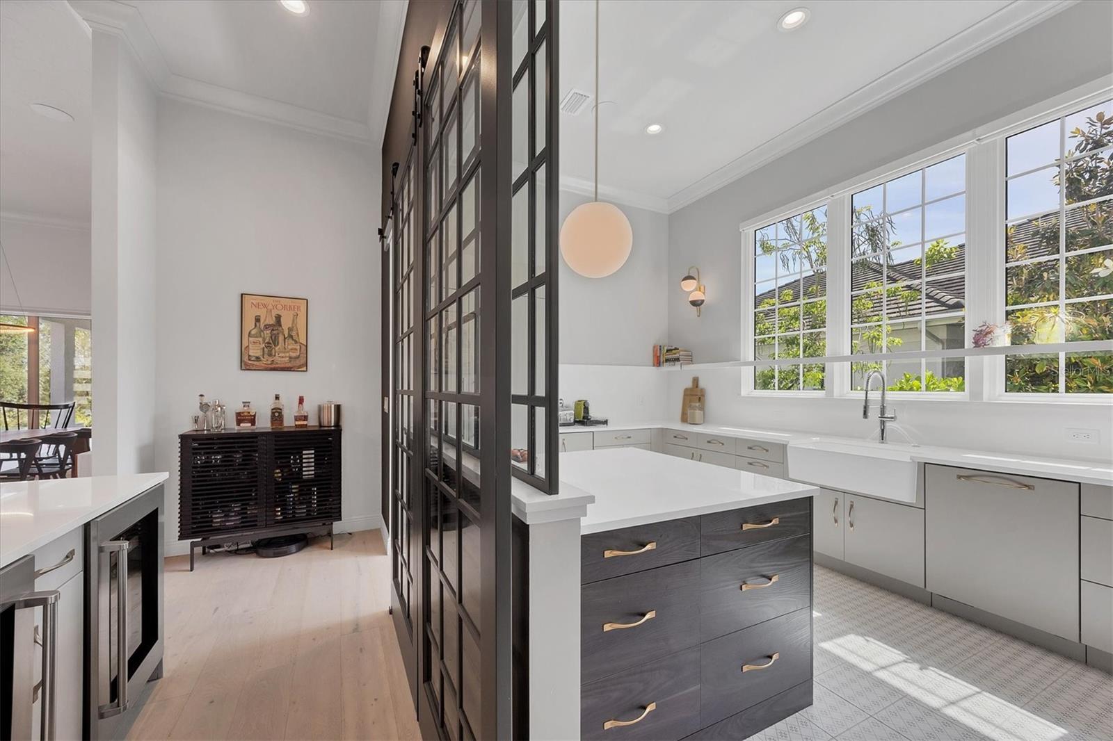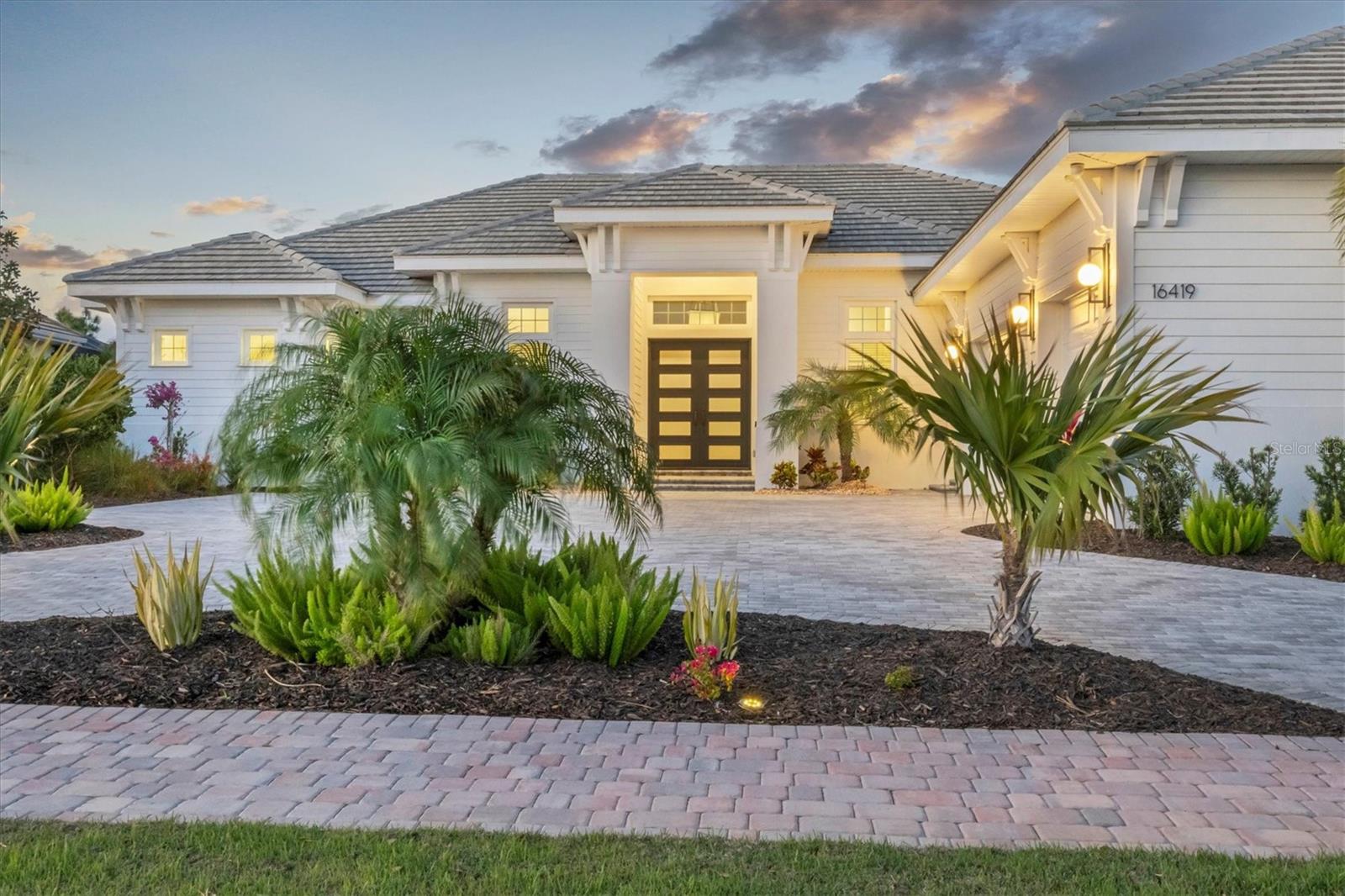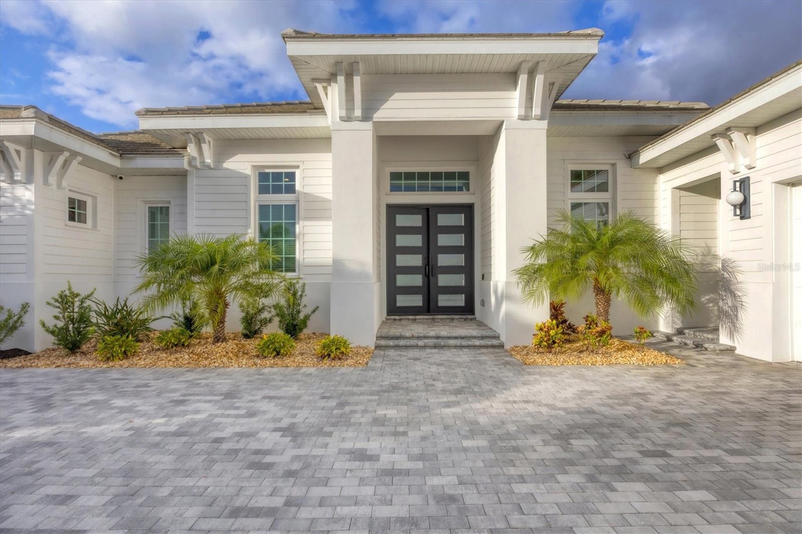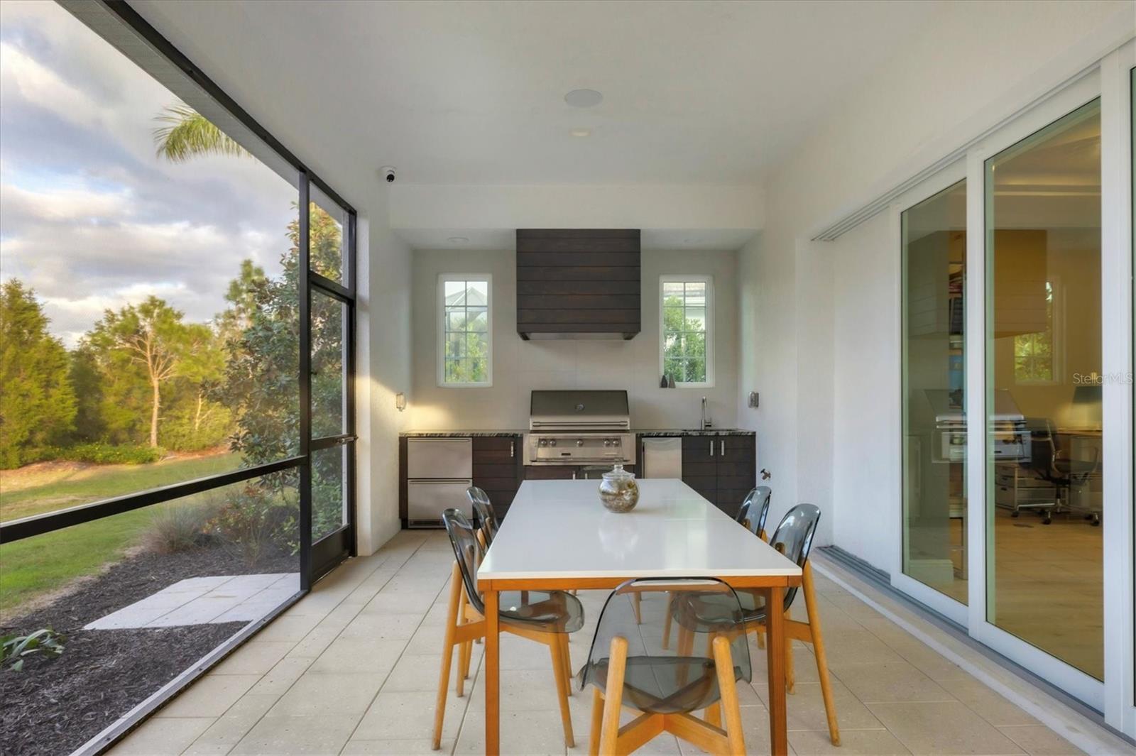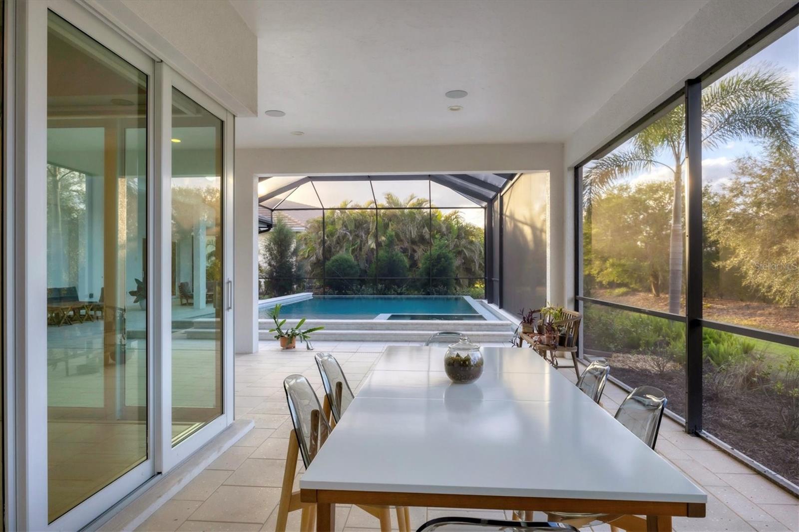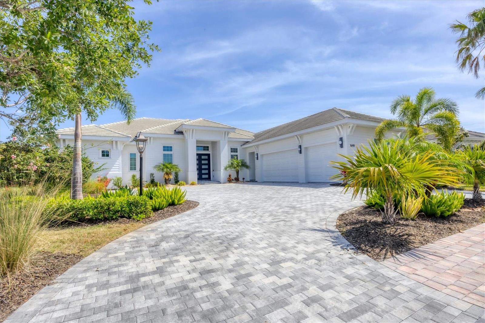 On a quiet preserve in the exclusive gated enclave of Country Club East, this exceptional John Cannon residence showcases refined craftsmanship, modern luxury, and seamless indoor-outdoor living. Designed for comfort and impact, the home features impact-rated windows and doors, a full-house generator, and an open layout that's as functional as it is beautiful. Enter through 10-foot iron and glass double doors into a dramatic great room with whitewashed European oak flooring, soaring 13-foot ceilings with chevron wood detail, and a striking natural gas fireplace framed by Basalt volcanic tile and reclaimed wood mantle. A custom Whisperkool wine wall holds up to 130 bottles, accented by a chevron Stickwood backdrop. The main foyer features a hidden closet for bags and shoes. The chef's kitchen boasts Sub-Zero and Wolf appliances, a six-burner range, built-in oven and microwave, quartz countertops, a prep island outfitted with pullout drawers, two for spices, a farmhouse sink and a standalone ice maker. An entertaining-sized island outside the kitchen features Sub-Zero beverage and wine coolers, an additional microwave and ample hidden storage. A spacious walk-in pantry is nearby and includes a built-in tall closet. The great room's 10-foot sliders fold back into a disappearing corner and lead to the expansive lanai with a PebbleTec infinity-edge heated saltwater pool and spa, panoramic screen enclosure, Shell Lock pavers and a fully outfitted summer kitchen with Alfresco grill, Trailwinds hood, True ice machine, Uline refrigerator and Blanco sink. The private owner's wing includes two walk-in closets, tray ceiling with crown molding, lanai access, and a spa-style bath with radiant heated floors and a steam shower. Two guest suites are positioned in separate wings, each with its full bath and walk-in closet, one with a private entrance and drop zone, the other with pool bath access. Additional living spaces include a bonus room with 10-foot sliders as a second disappearing corner as well as a study/exercise room with 15-foot ceilings. The laundry room features abundant cabinet storage, designer tile, sink and an additional 60 square feet of dedicated storage carved out behind two double doors. Adding even more value, the home is equipped with a whole-house water filtration system, designer lighting, automatic blinds and an oversized three-car garage. Every detail of this home has been thoughtfully curated for elevated living in one of Lakewood Ranch's prestigious communities.