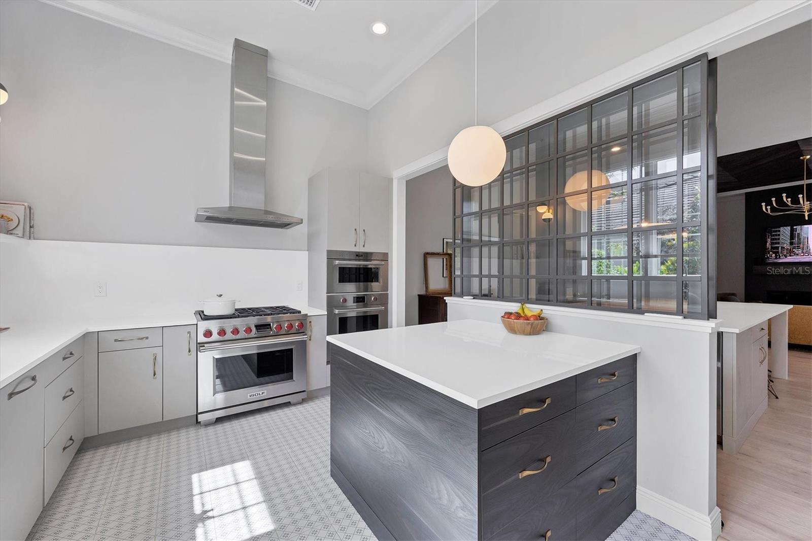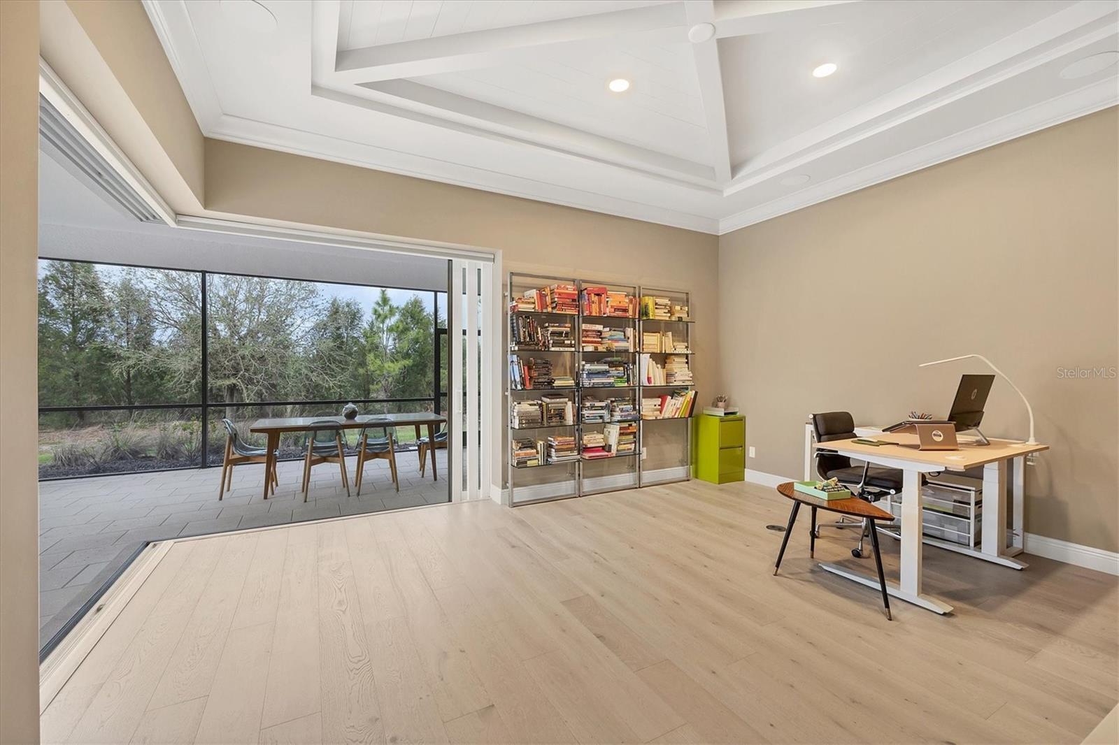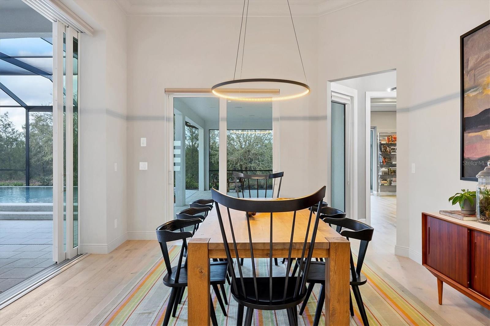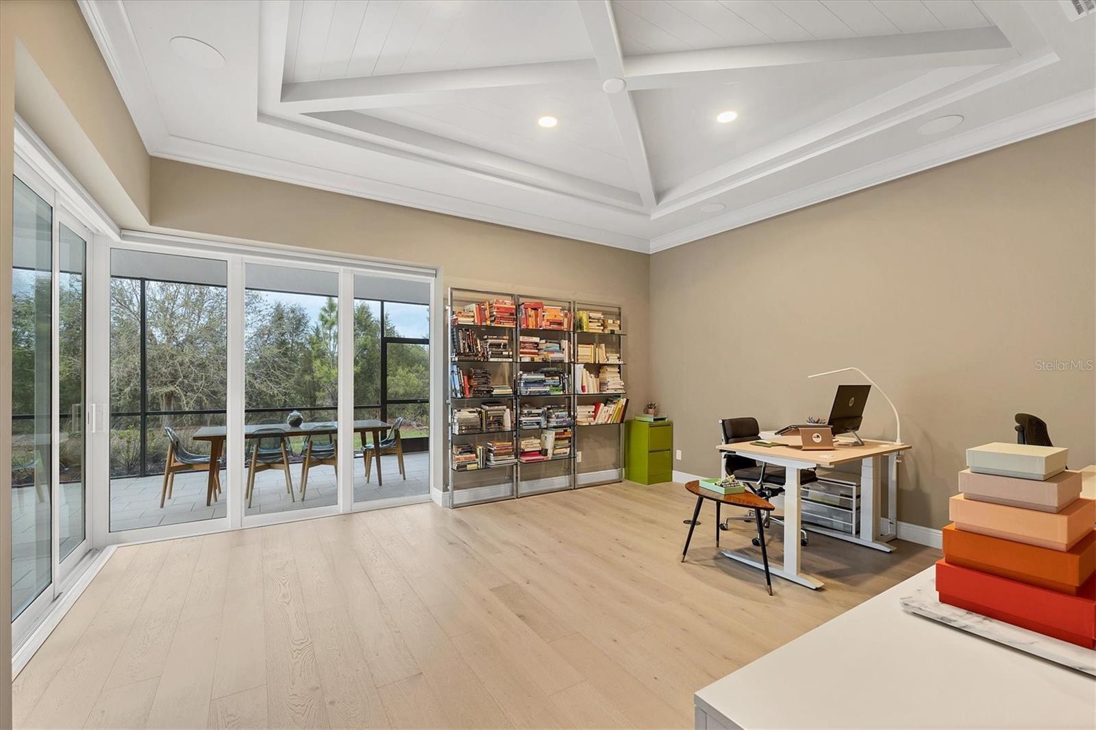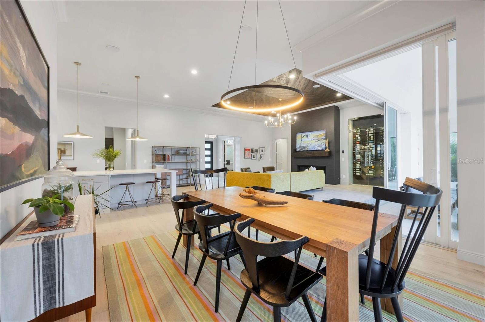 On a quiet preserve in the exclusive gated enclave of Country Club East, this exceptional John Cannon residence showcases refined craftsmanship, modern luxury, and seamless indoor-outdoor living. Designed for comfort and impact, the home features impact-rated windows and doors, a full-house generator, and an open layout that's as functional as it is beautiful. Enter through 10-foot iron and glass double doors into a dramatic great room with whitewashed European oak flooring, soaring 13-foot ceilings with chevron wood detail, and a striking natural gas fireplace framed by Basalt volcanic tile and reclaimed wood mantle. A custom Whisperkool wine wall holds up to 130 bottles, accented by a chevron Stickwood backdrop. The main foyer features a hidden closet for bags and shoes. The chef's kitchen boasts Sub-Zero and Wolf appliances, a six-burner range, built-in oven and microwave, quartz countertops, a prep island outfitted with pullout drawers, two for spices, a farmhouse sink and a standalone ice maker. An entertaining-sized island outside the kitchen features Sub-Zero beverage and wine coolers, an additional microwave and ample hidden storage. A spacious walk-in pantry is nearby and includes a built-in tall closet. The great room's 10-foot sliders fold back into a disappearing corner and lead to the expansive lanai with a PebbleTec infinity-edge heated saltwater pool and spa, panoramic screen enclosure, Shell Lock pavers and a fully outfitted summer kitchen with Alfresco grill, Trailwinds hood, True ice machine, Uline refrigerator and Blanco sink. The private owner's wing includes two walk-in closets, tray ceiling with crown molding, lanai access, and a spa-style bath with radiant heated floors and a steam shower. Two guest suites are positioned in separate wings, each with its full bath and walk-in closet, one with a private entrance and drop zone, the other with pool bath access. Additional living spaces include a bonus room with 10-foot sliders as a second disappearing corner as well as a study/exercise room with 15-foot ceilings. The laundry room features abundant cabinet storage, designer tile, sink and an additional 60 square feet of dedicated storage carved out behind two double doors. Adding even more value, the home is equipped with a whole-house water filtration system, designer lighting, automatic blinds and an oversized three-car garage. Every detail of this home has been thoughtfully curated for elevated living in one of Lakewood Ranch's prestigious communities.