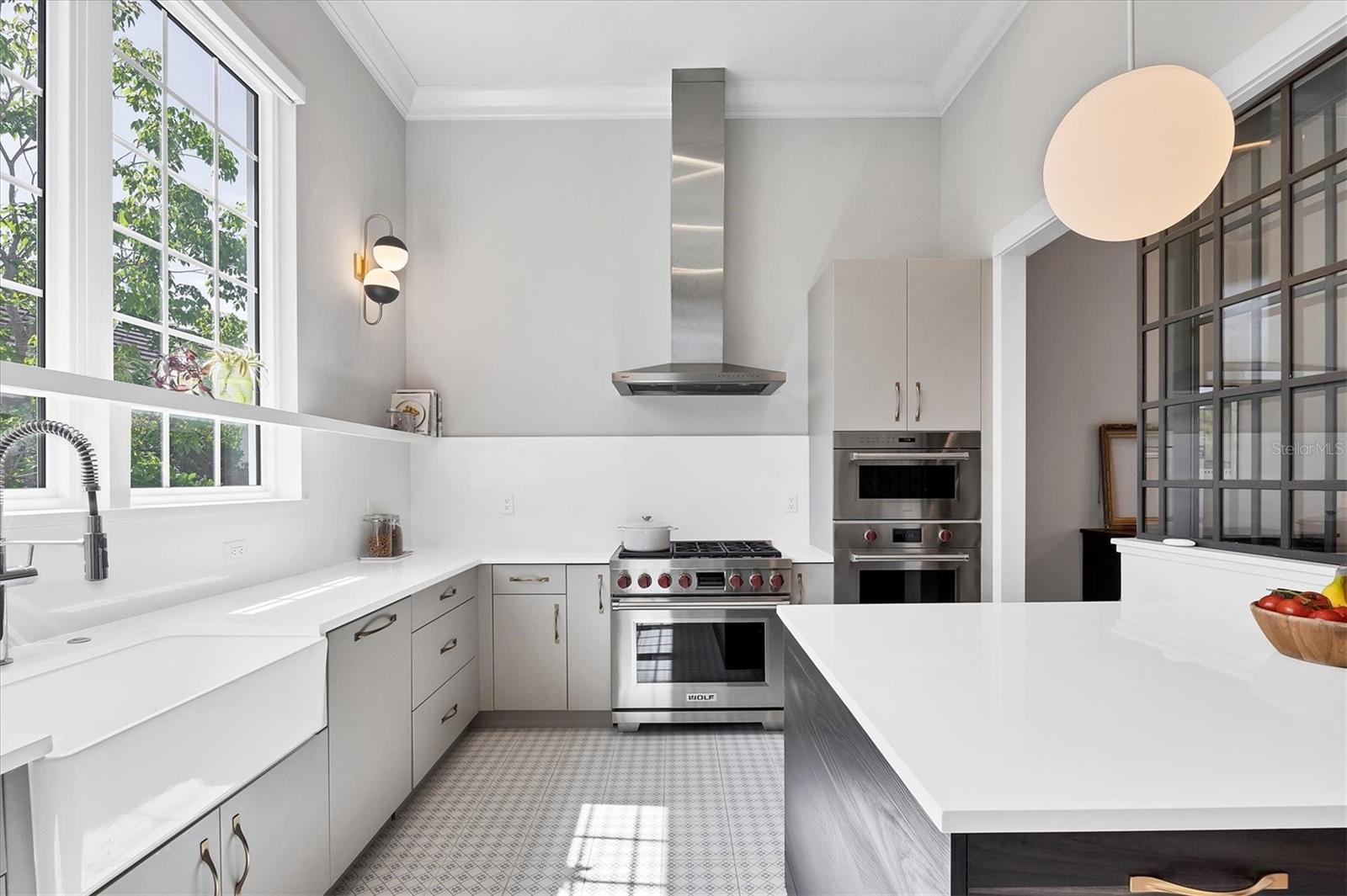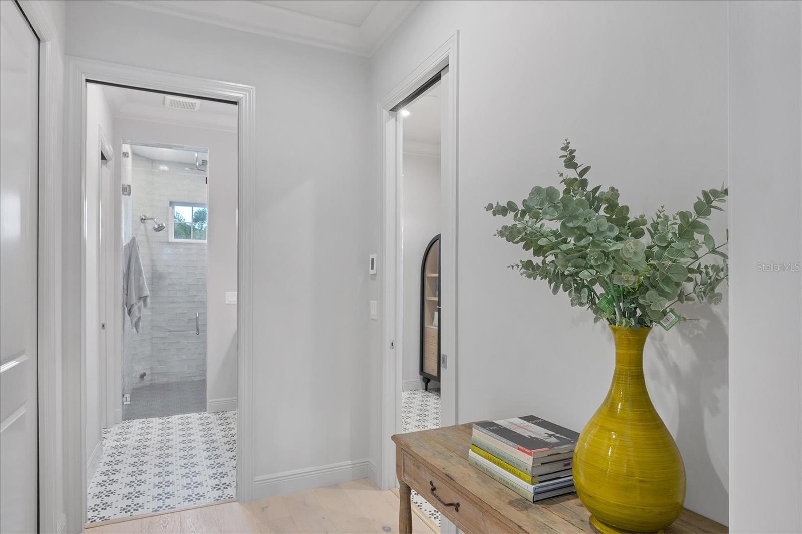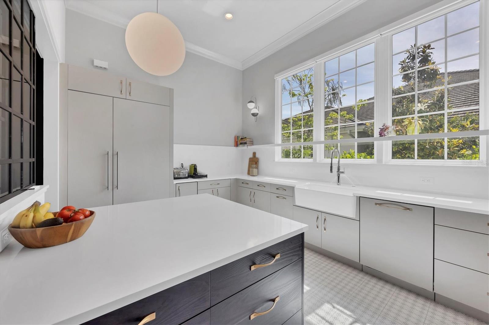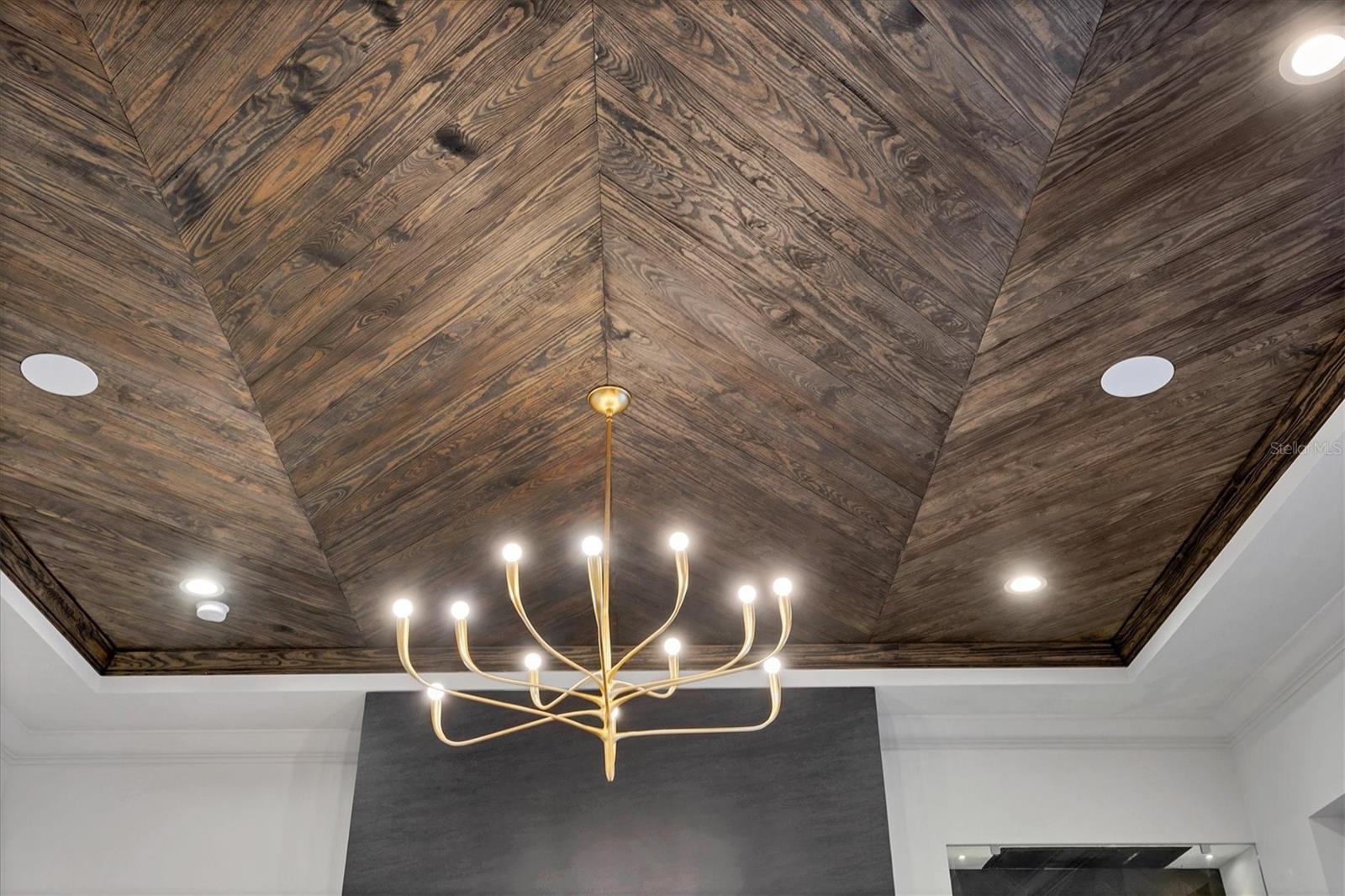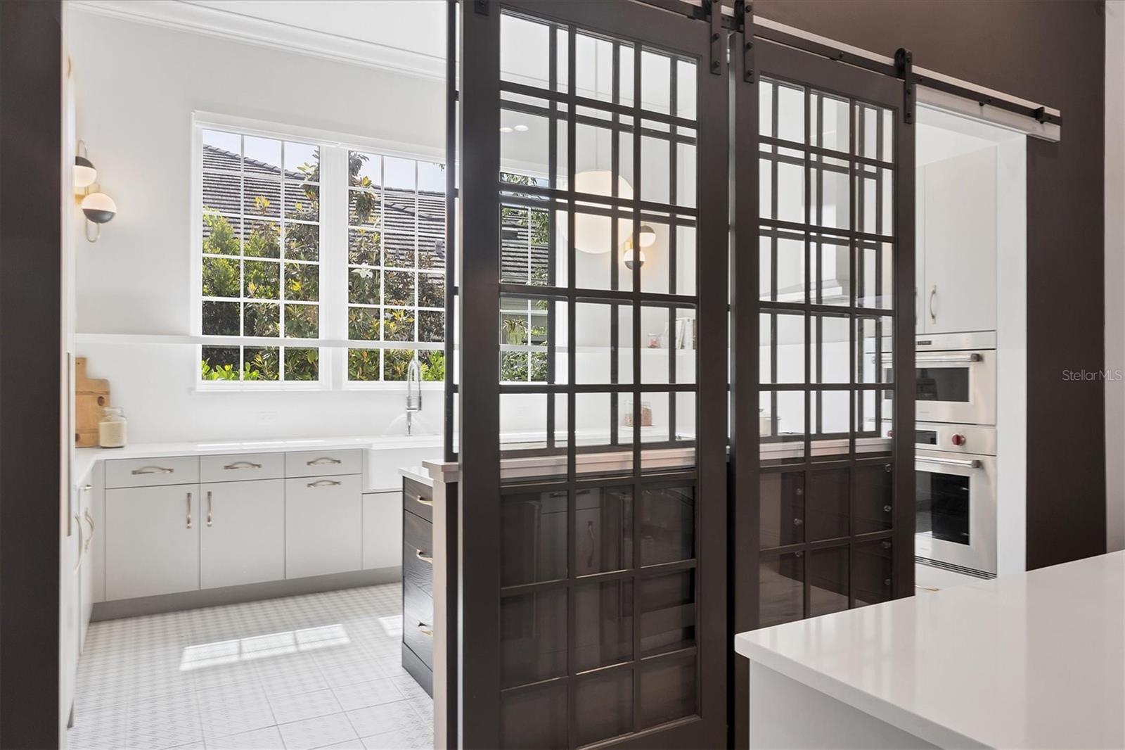On a quiet preserve in the exclusive gated enclave of Country Club East, this exceptional John Cannon residence showcases refined craftsmanship, modern luxury, and seamless indoor-outdoor living. Designed for comfort and impact, the home features impact-rated windows and doors, a full-house generator, and an open layout that's as functional as it is beautiful. Enter through 10-foot iron and glass double doors into a dramatic great room with whitewashed European oak flooring, soaring 13-foot ceilings with chevron wood detail, and a striking natural gas fireplace framed by Basalt volcanic tile and reclaimed wood mantle. A custom Whisperkool wine wall holds up to 130 bottles, accented by a chevron Stickwood backdrop. The main foyer features a hidden closet for bags and shoes. The chef's kitchen boasts Sub-Zero and Wolf appliances, a six-burner range, built-in oven and microwave, quartz countertops, a prep island outfitted with pullout drawers, two for spices, a farmhouse sink and a standalone ice maker. An entertaining-sized island outside the kitchen features Sub-Zero beverage and wine coolers, an additional microwave and ample hidden storage. A spacious walk-in pantry is nearby and includes a built-in tall closet. The great room's 10-foot sliders fold back into a disappearing corner and lead to the expansive lanai with a PebbleTec infinity-edge heated saltwater pool and spa, panoramic screen enclosure, Shell Lock pavers and a fully outfitted summer kitchen with Alfresco grill, Trailwinds hood, True ice machine, Uline refrigerator and Blanco sink. The private owner's wing includes two walk-in closets, tray ceiling with crown molding, lanai access, and a spa-style bath with radiant heated floors and a steam shower. Two guest suites are positioned in separate wings, each with its full bath and walk-in closet, one with a private entrance and drop zone, the other with pool bath access. Additional living spaces include a bonus room with 10-foot sliders as a second disappearing corner as well as a study/exercise room with 15-foot ceilings. The laundry room features abundant cabinet storage, designer tile, sink and an additional 60 square feet of dedicated storage carved out behind two double doors. Adding even more value, the home is equipped with a whole-house water filtration system, designer lighting, automatic blinds and an oversized three-car garage. Every detail of this home has been thoughtfully curated for elevated living in one of Lakewood Ranch's prestigious communities.