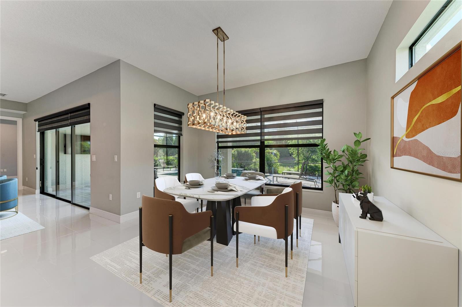 - Exterior: Hurricane Shutters, Lighting, Rain Gutters, Shade Shutter(s), Sidewalk, Sliding Doors