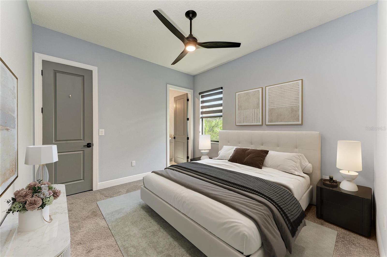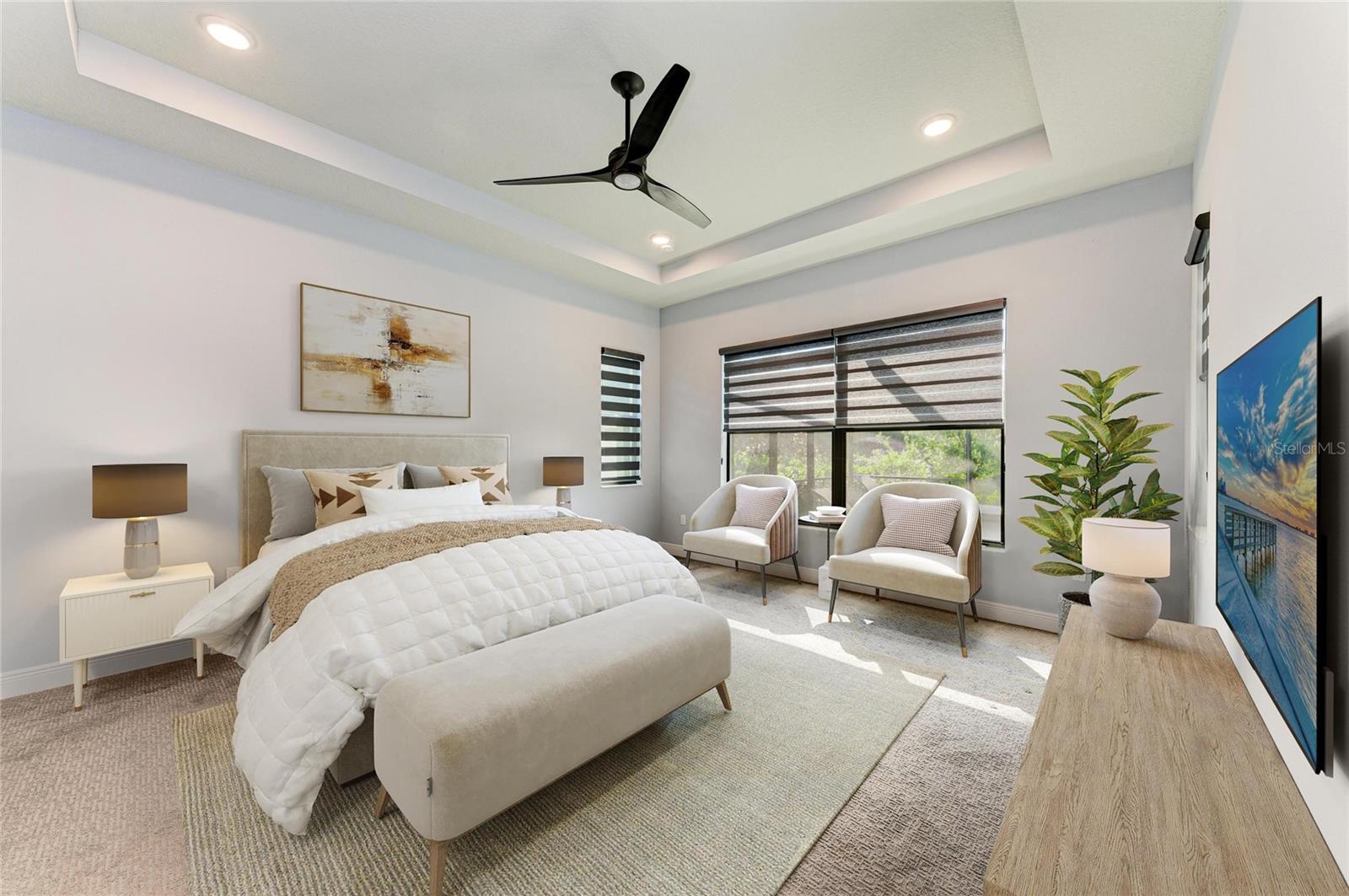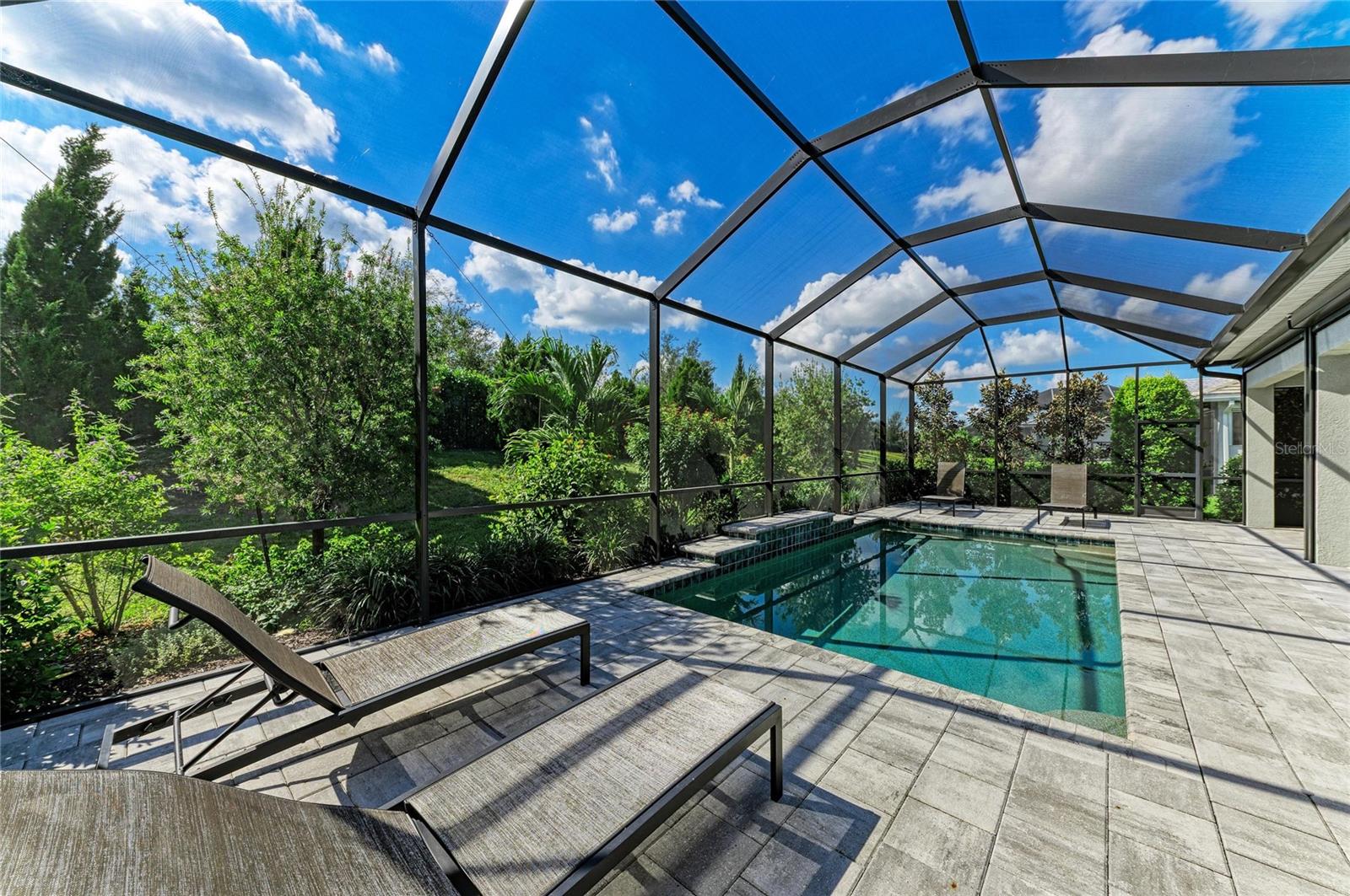 Imagine waking up each morning to the soft sounds of nature -- coffee in hand, sitting beneath the covered lanai as sunlight dances off the waterfall spilling into your private pool. The only thing more serene than the view is knowing that everything -- from the lawn to the high-speed internet -- is already taken care of. This is the effortless Florida lifestyle waiting for you in Cresswind, Lakewood Ranch's premier 55+ resort community.Step through custom glass entry doors into a light-filled home that strikes the perfect balance between elegant design and everyday comfort. The open-concept great room welcomes you with soaring tray ceilings, designer lighting, and a stunning custom-built entertainment wall featuring a 6-foot linear electric fireplace flanked by dual bookshelves. A wall-mounted TV (included) creates a ready-to-enjoy gathering space that seamlessly connects to the chef-inspired kitchen -- complete with quartz countertops, graphite cabinetry, a beverage cooler, upgraded pantry, and built-in appliances.The primary suite offers a tranquil retreat overlooking the pool, with a spa-like bath featuring a walk-in shower with bench, dual raised vanities, and a spacious custom closet. Two additional guest bedrooms and a private den provide flexibility for visiting family, hobbies, or a home office (with a wall-mounted TV included). Every inch of this home is curated with thoughtful detail -- from designer fans and window treatments to brass-trim floor outlets and upgraded plumbing fixtures.Outside, your personal oasis awaits. A 12'x24 lighted pool with waterfall anchors the expanded lanai, where motorized hurricane screens offer instant protection and privacy. The outdoor TV (included) and under-roof living space make it ideal for entertaining year-round. Beyond the lanai, lush 360 landscaping and paver driveway set the tone for timeless curb appeal -- all maintained by the HOA.Even the garage impresses with an epoxy floor, insulated door, backup opener, steel storage racks and cabinets -- perfect for your Florida lifestyle essentials.As a resident of Cresswind at Lakewood Ranch, you'll enjoy access to a vibrant active-adult community designed for connection and wellness: resort-style and resistance pools, tennis and pickleball courts, fitness center, walking trails, arts studio, dog parks, food truck nights, and a full-time lifestyle director. All just minutes from the shopping, dining, and beaches that make Lakewood Ranch the #1 multi-generational community in the U.S.Why wait to start living your best Florida life? This home is the perfect blend of sophistication, low-maintenance living, and resort-level amenities -- ready for you to move in and start making memories today. Home is virtually staged.