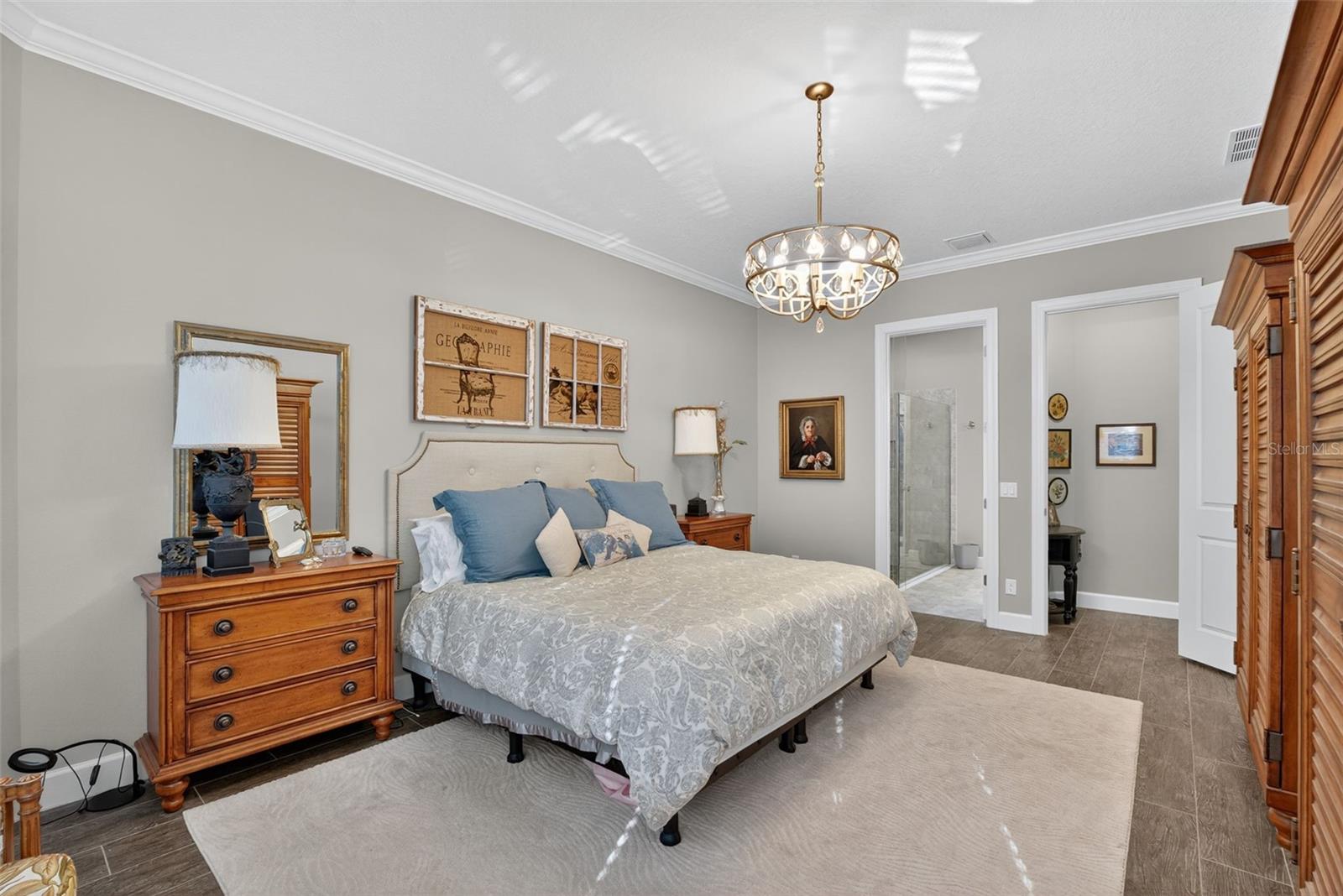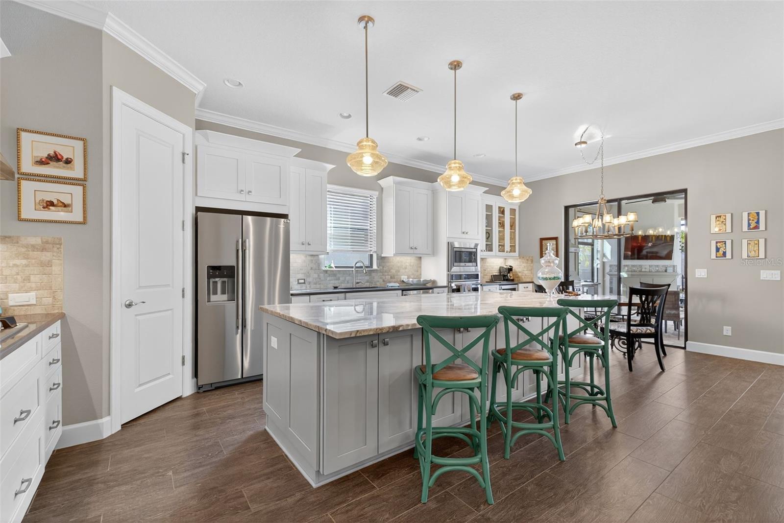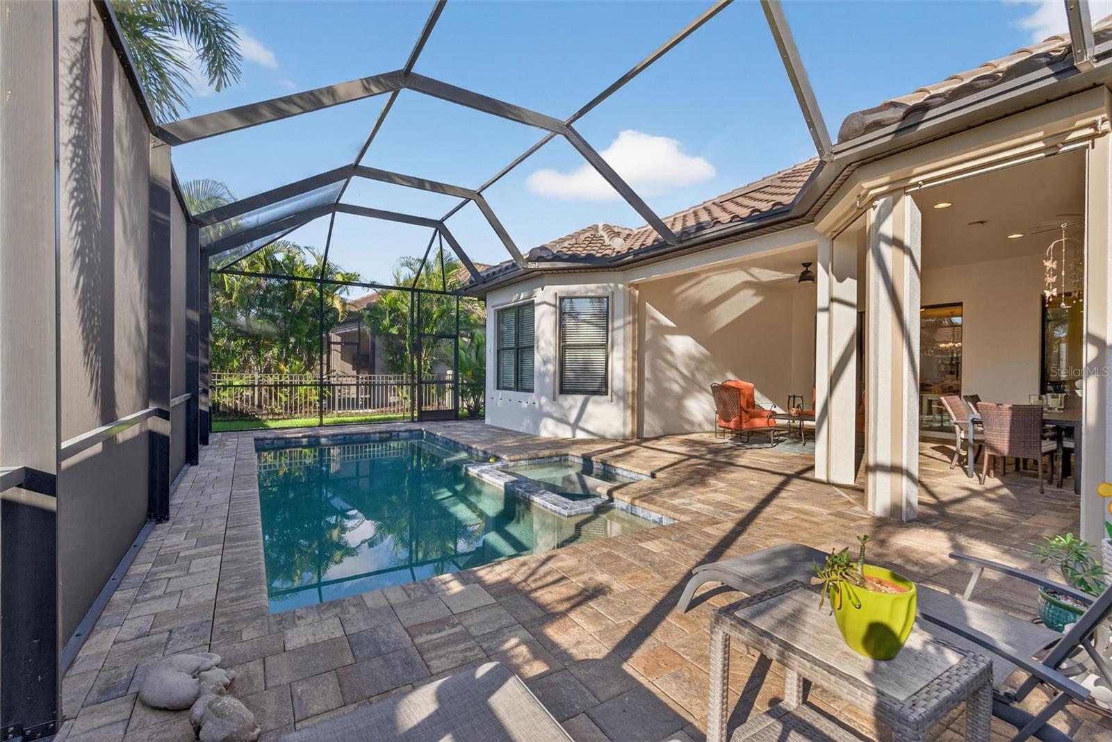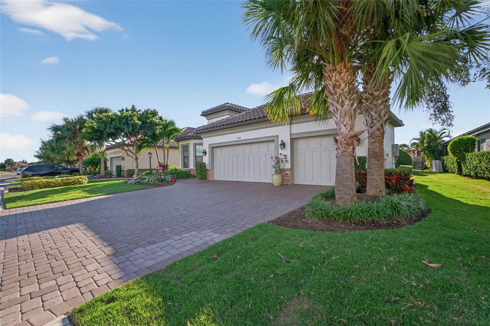 A rare Lazio floorplan with golf and a full 3-car garage on an oversized lot complete with a private fenced yard nestled in the gated, resort-style community of Esplanade Golf & Country Club at Lakewood Ranch. This meticulously maintained 3-bedroom, 3-bathroom residence offers elegant design, premium finishes, and an ideal layout for both everyday comfort and upscale entertaining. This house boasts an eat-in kitchen, expanded primary suite, expanded front bedroom, extended covered lanai, pool and spa. At the heart of the home, the GE Cafe gourmet kitchen is a chef's dream, showcasing white cabinetry, an oversized granite island with extra storage, and carefully laid out soft-close drawers everywhere, ideal for all your pots, pans and serving pieces. The undercabinet lighting showcases the expansive quartz countertops. A built-in GE Monogram wine refrigerator in the breakfast nook adds a touch of luxury, complemented by expanded cabinetry for added functionality. The open-concept layout features sophisticated tray ceilings in the entry along with crown molding in both the main living space and primary suite. A dedicated office space is elevated with custom-built-ins and stylish sliding doors, offering the perfect balance of privacy and productivity. The large laundry room includes ample cabinetry, a deep sink, and premium LG washer and dryer, combining practicality with refined design. Outdoor living is a true highlight, with the expanded covered lanai featuring a full summer kitchen and a cozy fireplace, all overlooking a private, custom heated pool and spa, fenced-in yard with lush tranquil landscaping. Impact-rated shades on the lanai and Kevlar hurricane screens on all other windows and doors offer peace of mind year-round, while gutters and landscape lighting enhance curb appeal and functionality. This is a golf deeded property. Esplanade is located in the heart of Lakewood Ranch, close to I-75, Lakewood Ranch Main St., University Town Center, Sarasota Polo Club, shopping, dining, entertainment, hospitals, cultural attractions, boating, parks and Florida's famous sandy beaches.