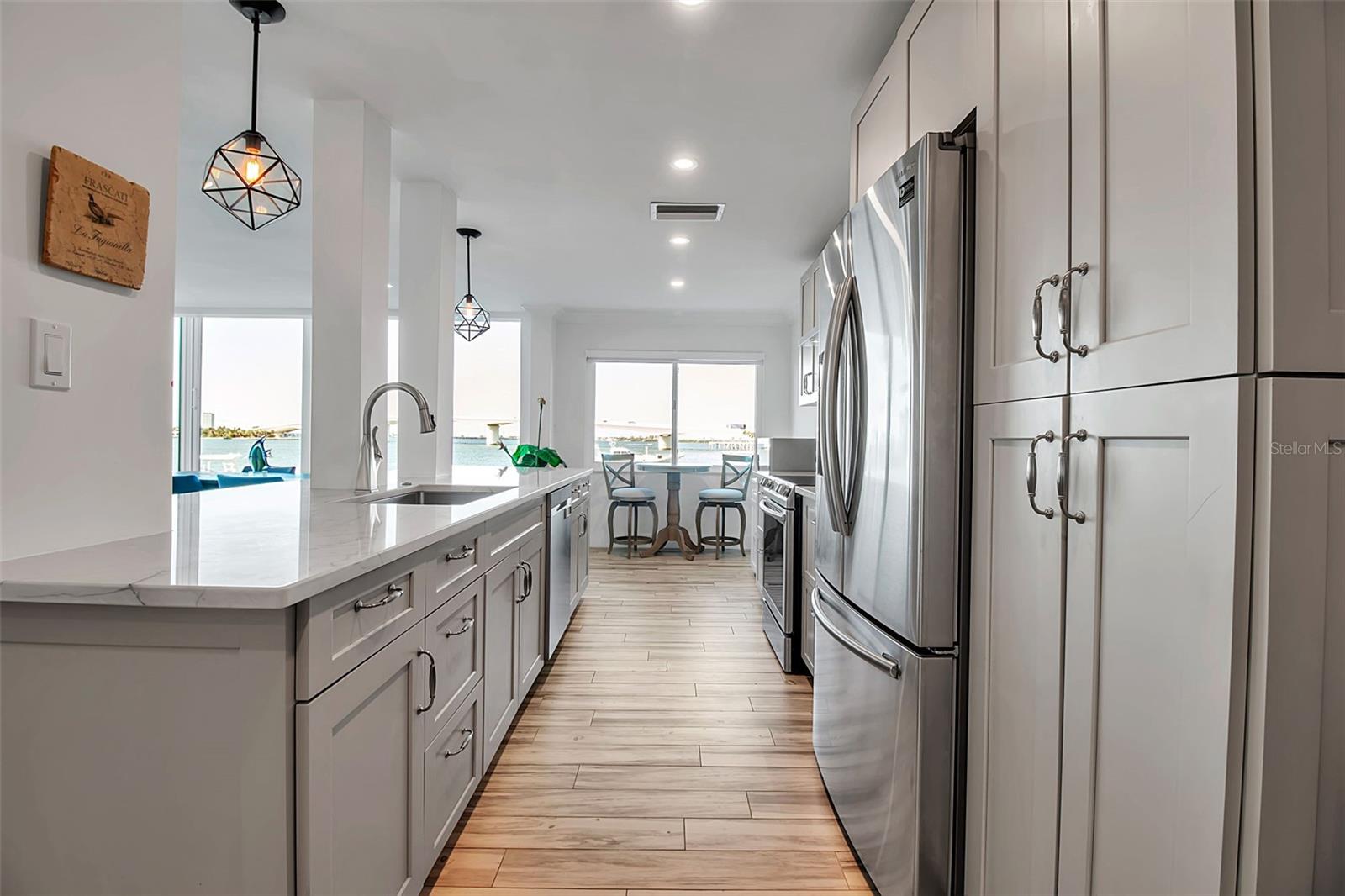 With panoramic water views and a refined coastal aesthetic, this Sarasota Bay-facing condominium on Golden Gate Point offers an exceptional balance of style, comfort, and location. The residence comes furnished and boasts an open floor plan designed to maximize natural light and stunning vistas through impact windows. Remote-controlled blinds, soft neutral tones, and crown molding establish an elegant coastal palette, while porcelain tile flooring flows seamlessly throughout. The kitchen serves as the home's centerpiece, showcasing marble countertops, a stylish tile backsplash, and an expansive island with seating, perfect for entertaining or casual dining. Soft-close cabinetry pairs beautifully with Samsung stainless steel appliances, including a refrigerator, electric range, dishwasher, and counter-depth microwave. The adjacent living and dining spaces open to dramatic bay views that set the mood for colorful sunsets reflecting off the John Ringling Bridge. The primary suite is a serene retreat with plantation-shuttered windows, a custom California Closet system, and a spa-inspired ensuite bath featuring a marble-topped vanity, walk-in shower, and Wendell bidet toilet. The guest bedroom includes a California Closet system and frosted-glass barn doors, while the nearby full bath continues the modern design with a walk-in shower, marble vanity, natural light, and a matching Wendell bidet toilet. Additional highlights include an LG stackable washer and dryer, tankless water heater and assigned covered parking. Harbor House West also provides a day dock, ample guest parking, and a pet-friendly environment within a secure, well-managed community. Set within walking distance to the marina, Bayfront Park, and downtown Sarasota's acclaimed restaurants, galleries, and theaters, this residence offers the ultimate blend of coastal serenity and urban sophistication, a front-row seat to the city's most breathtaking sunsets and skyline views.
