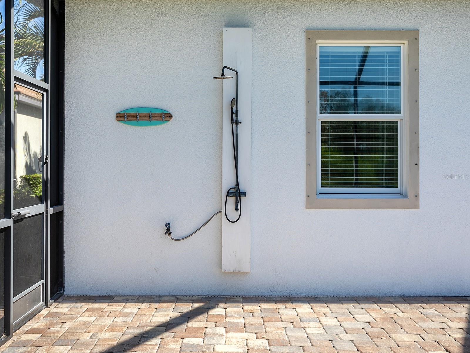 - Exterior: Hurricane Shutters, Lighting, Outdoor Kitchen, Outdoor Shower, Rain Gutters, Sidewalk, Sliding Doors, Sprinkler Metered
