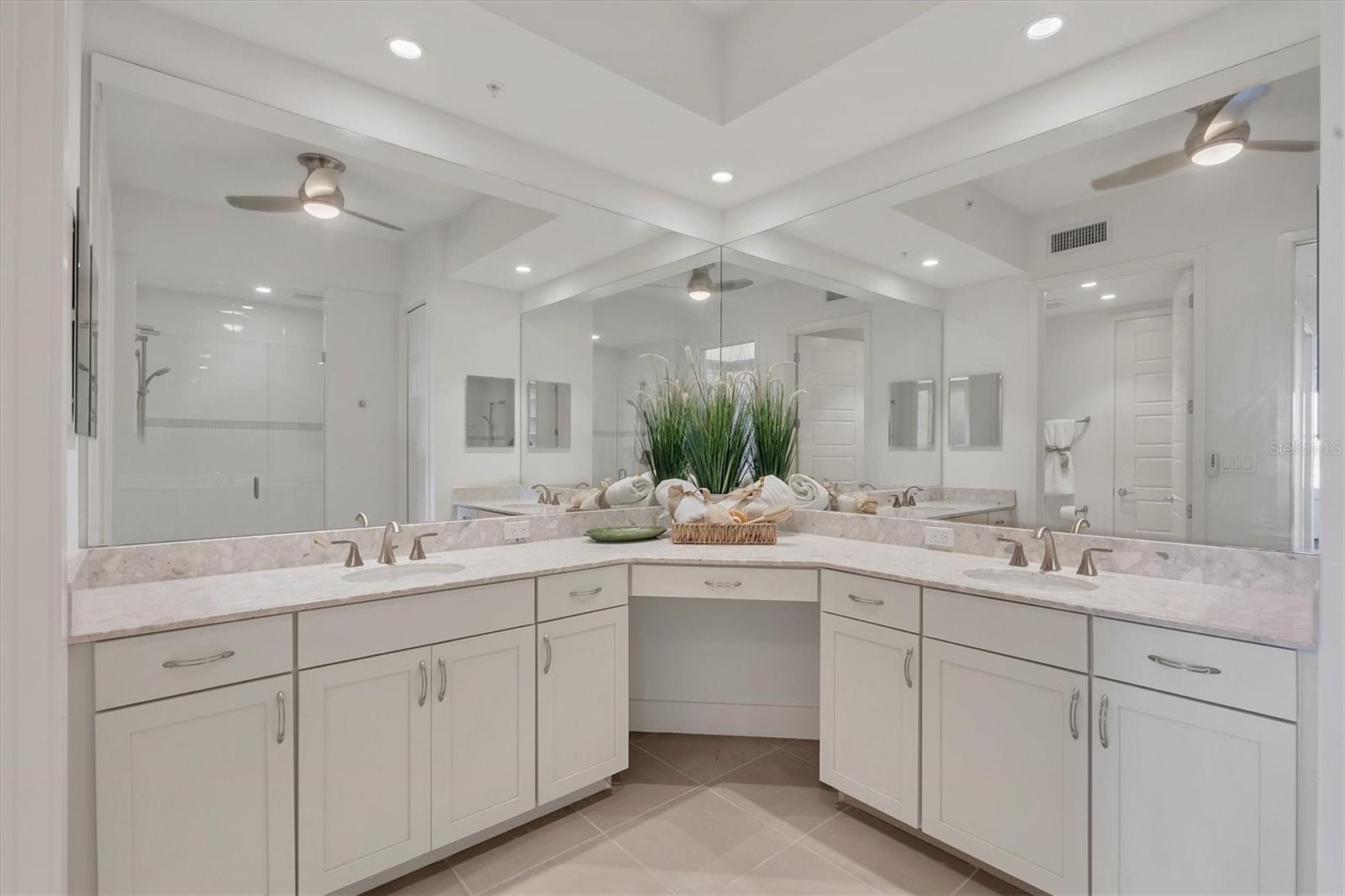 Under contract-accepting backup offers. Experience lakefront sunsets and modern luxury in this top-floor penthouse at Waterfront at Main in Lakewood Ranch. Designed by Homes by Towne, the sought-after Eleuthera floor plan blends contemporary sophistication with relaxed coastal style, offering 3 bedrooms, 2.5 baths, and beautifully curated finishes throughout. Upon entry, tray ceilings, designer lighting, and warm wood flooring introduce an airy open concept where high ceilings and expansive windows fill the home with natural light. The dining area centers around a sleek linear fireplace, creating an intimate yet elegant setting that flows seamlessly into the living area and chef's kitchen. The kitchen is a showpiece, highlighted by a quartz waterfall-edge island with seating, GE Monogram stainless steel appliances, white cabinetry with pullouts, an electric cooktop, and a modern tile backsplash that completes the refined aesthetic. Six sliding glass panels open to a large, screened lanai with tile flooring and tranquil lake views, an inviting outdoor retreat ideal for morning coffee or sunsets. The primary suite impresses with double-door entry, two walk-in closets, a tray ceiling, and private access to the lanai. Its spa-inspired bath features dual sinks, a quartz-topped vanity with a makeup area, a walk-in shower, a private water closet, and designer tile finishes. Two additional bedrooms provide flexibility for guests or office space. Bedroom two includes plush carpet and an oversized closet, while bedroom three enjoys peaceful lake views and a ceiling fan. A stylish full bath with a tub/shower combination and a chic powder room with a barn door and designer vanity complete the layout. Additional highlights include an oversized laundry room with a frosted glass door, ample cabinetry, and counter space, as well as two covered parking spaces, an air-conditioned storage locker, dual A/C units, and two water heaters for enhanced comfort and convenience. Waterfront at Main offers gated entry and resort-style amenities, a saltwater pool, spa, outdoor firepit, clubhouse, and fitness center, plus a vibrant social calendar. Step outside to enjoy Lakewood Ranch Main Street's array of shops, dining, and entertainment, or take a short drive to Waterside Place, UTC, and Sarasota's world-famous beaches. This penthouse pairs contemporary luxury with a low-maintenance lifestyle, an exceptional opportunity to live effortlessly in one of the nation's most desirable communities.