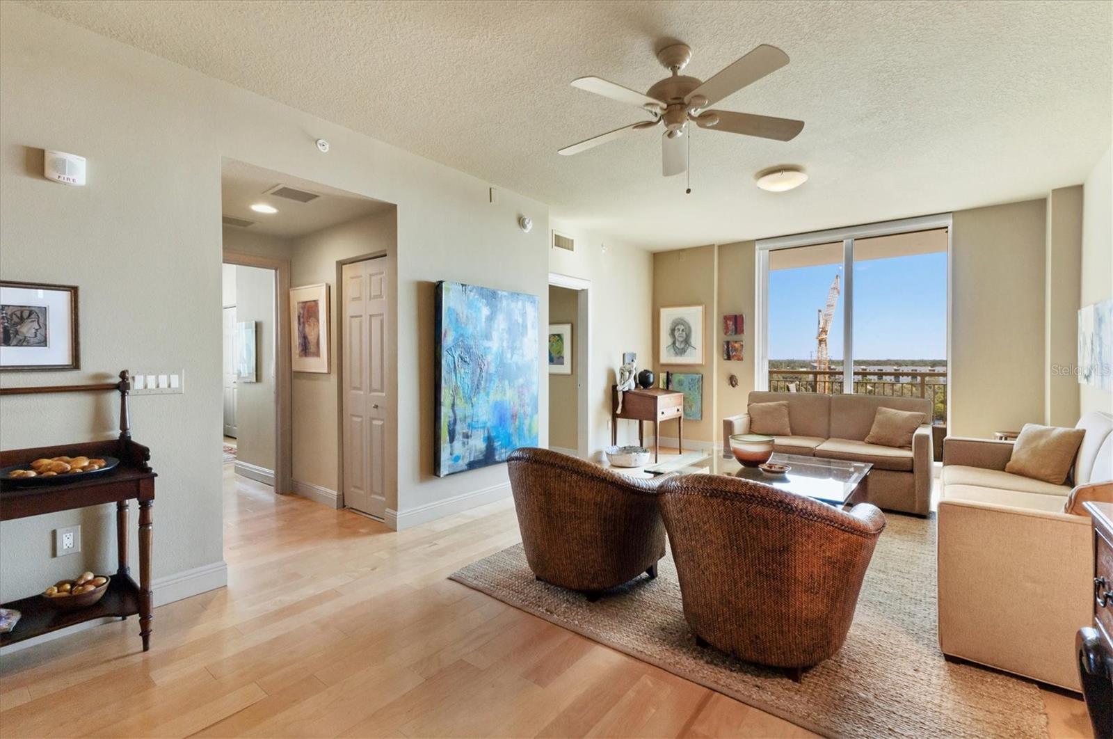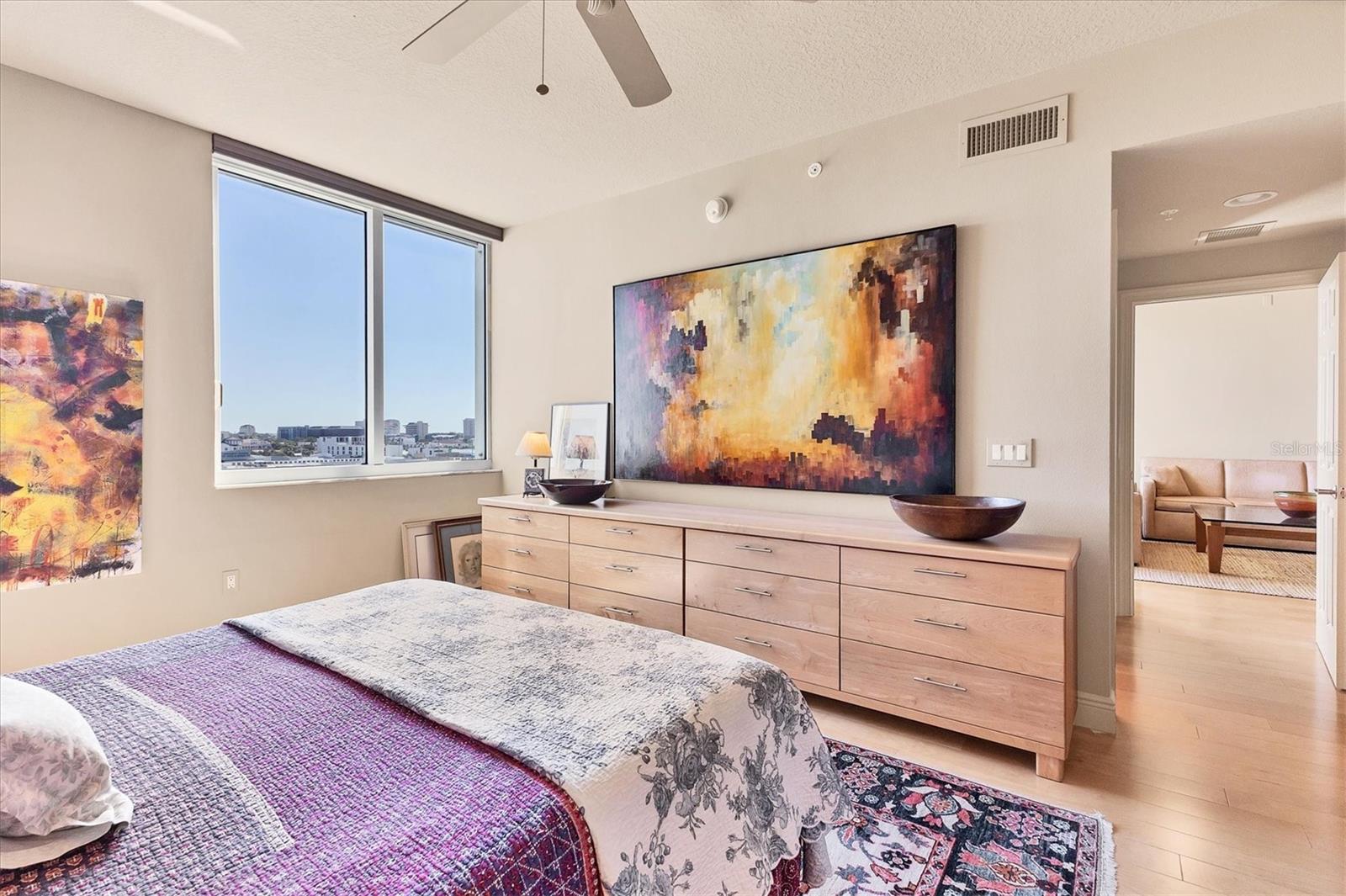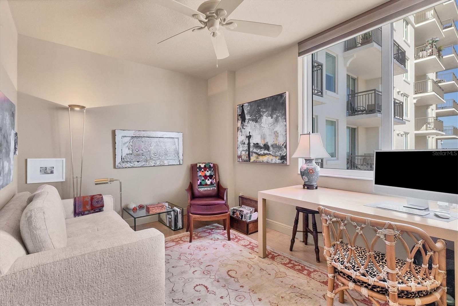 Live effortlessly in this stunning corner-unit residence located in Downtown Sarasota's coveted Rosemary District. With 1,484 sq. ft., two bedrooms plus a den, and two full baths, this home perfectly blends style and comfort. Natural light pours through large windows, accentuating the elegant maple hardwood floors and high ceilings. The chef's kitchen is a showpiece--featuring custom cabinetry, expansive countertops, and a central island designed for entertaining. The den, with built-in shelving, provides the ideal space for a home library or creative studio. The primary suite offers serene comfort with thoughtfully designed closets and refined finishes. Additional highlights include electric blinds, a covered terrace, a temperature-controlled storage unit, and a dedicated parking space. The community's amenities are unparalleled--offering every convenience imaginable, including 24/7 concierge services, guest parking, three guest suites, on-site management and maintenance, a lap pool, spa, sauna, fitness center, movie theater, club room, billiards and game lounge, business office, library, dog run, wine-tasting room, and EV charging stations. Internet and streaming services are included in the HOA for added convenience. Enjoy a true sense of community with monthly resident events designed to bring neighbors together. Savor the best of Sarasota--fine dining, the Van Wezel Performing Arts Hall, and the vibrant downtown scene--all just steps from your door.