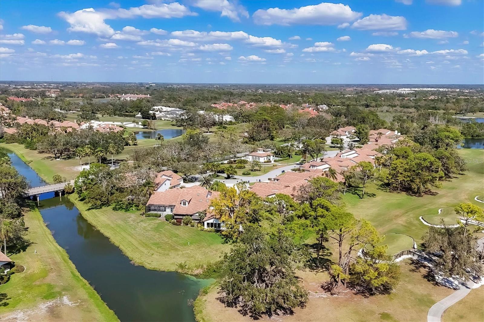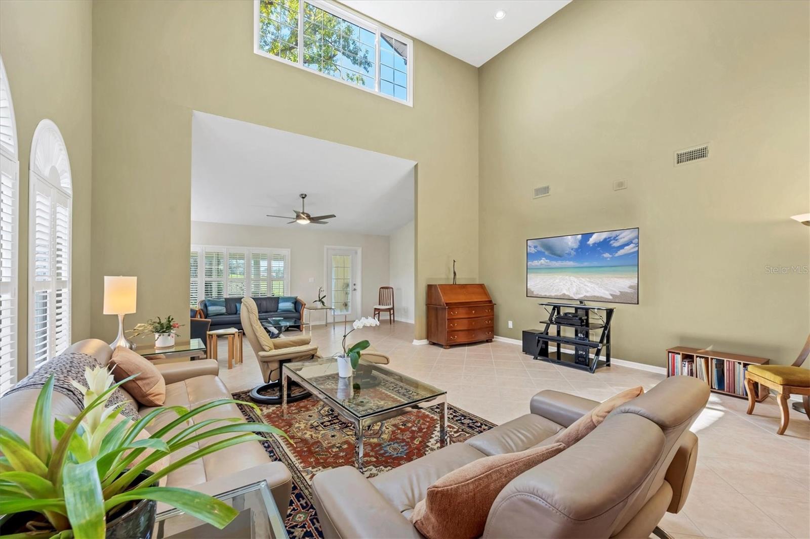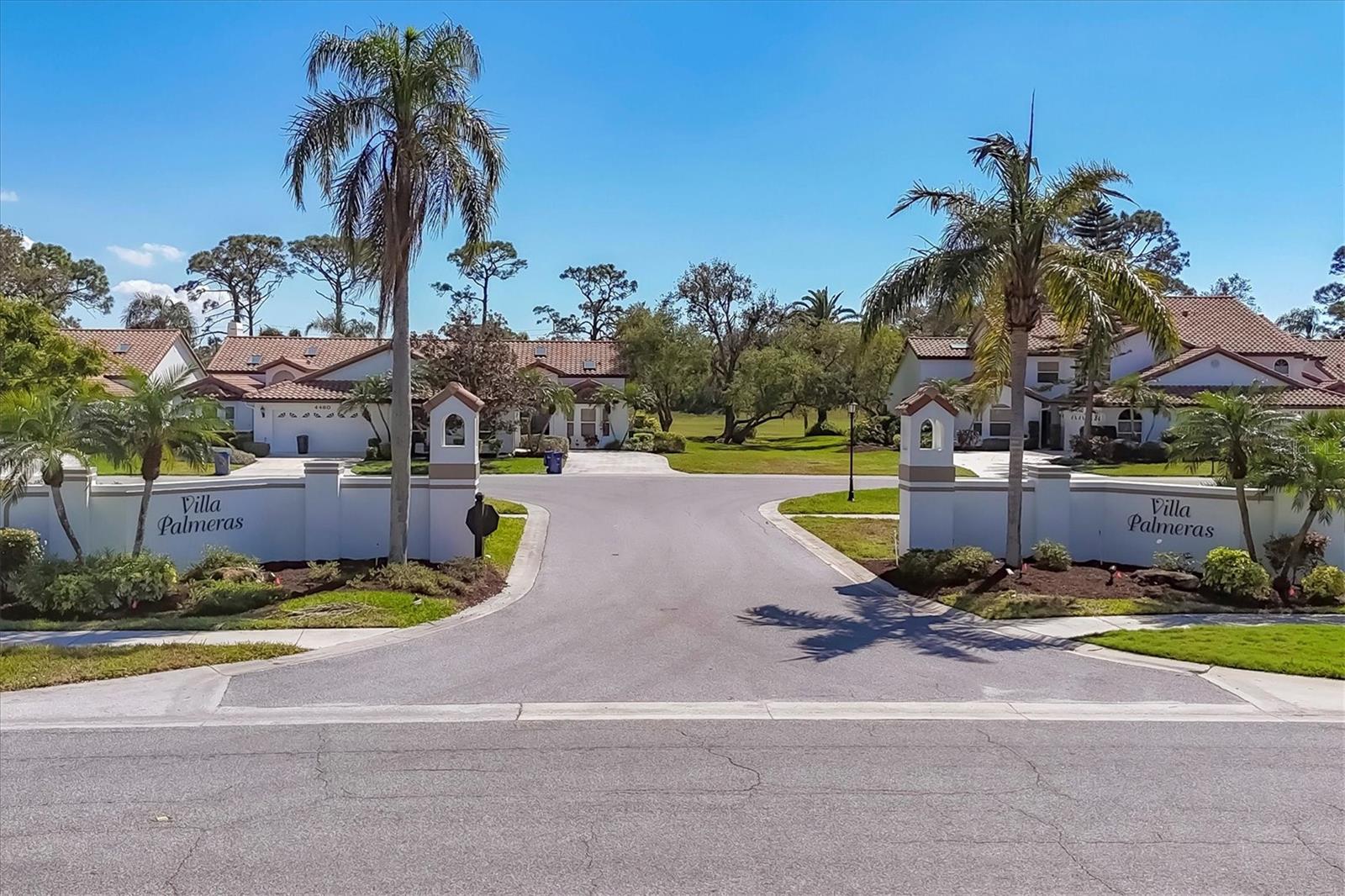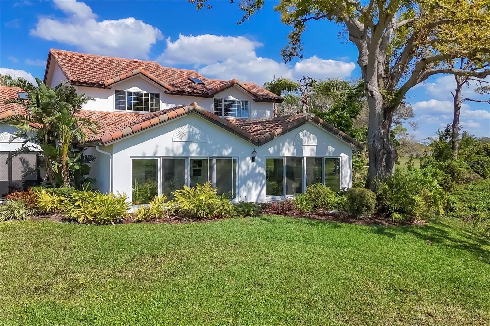 This elegant end-unit villa in the coveted Villa Palmeras section of Prestancia offers breathtaking golf course views and a maintenance-free lifestyle. Overlooking the 14th green and 15th fairway of the renowned TPC Stadium Course, this beautifully appointed residence spans 3,114 square feet of refined living space. A welcoming foyer leads into the expansive living room, where a soaring two-story ceiling, a large skylight, and plantation-shuttered windows create a bright and inviting atmosphere. The formal dining room, framed by three large windows, provides an elegant setting for entertaining. Designed for both style and functionality, the kitchen features upgraded wood cabinetry, stainless steel appliances, granite countertops, and a pantry cabinet, along with a casual dining area bathed in natural light. The primary suite serves as a serene retreat, complete with a vaulted ceiling, engineered hardwood flooring, walk-in closets, and French doors opening to the enclosed Florida room. The en-suite bath offers dual vanities, a walk-in shower, tile flooring, and a generous walk-in closet. Two well-appointed guest bedrooms provide spacious accommodation with plush natural carpet, engineered hardwood flooring and ample closet space, sharing a full bath with an expansive vanity, solid surface countertop, and a tub/shower combination. Upstairs, a versatile space can be used as a den or additional storage. A convenient powder room is located near the kitchen for easy access. Extending the home's living space, the air-conditioned Florida room offers panoramic golf course views and direct access to the spacious yard through a wall of sliders. Additional features include a two-car garage, a utility room, hurricane impact-rated windows and doors, plantation shutters, and tile and engineered hardwood throughout the main living areas. Villa Palmeras residents enjoy access to two community pools and a pool house with covered lounging and dining areas. Nestled within the prestigious, gated community of Prestancia, this villa offers optional TPC membership for golf and social activities. Ideally located minutes to The Legacy Trail, a short drive from Siesta Key Beach, downtown Sarasota, St. Armands Circle, and the picturesque barrier islands, this exceptional home blends luxury, convenience, and resort-style living.