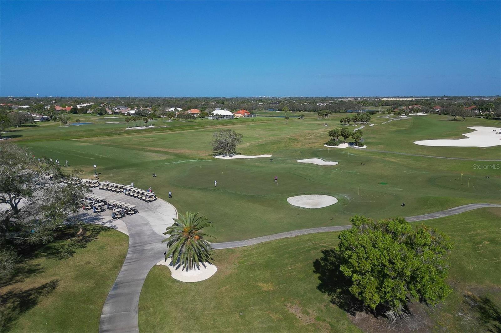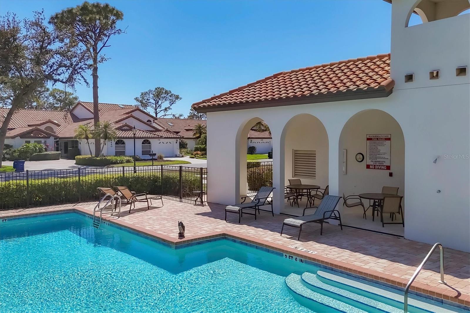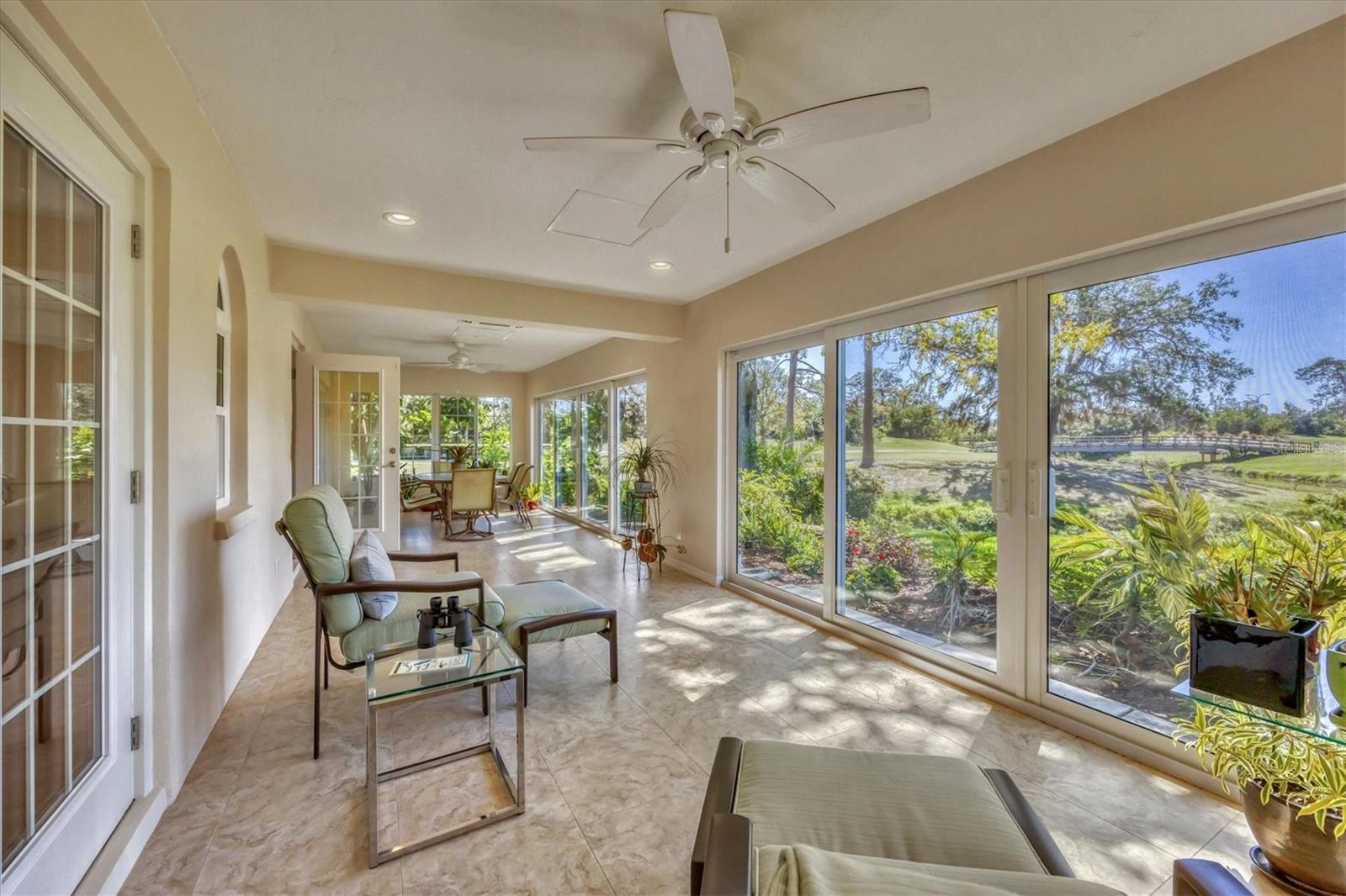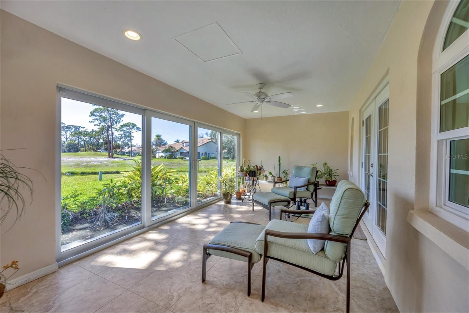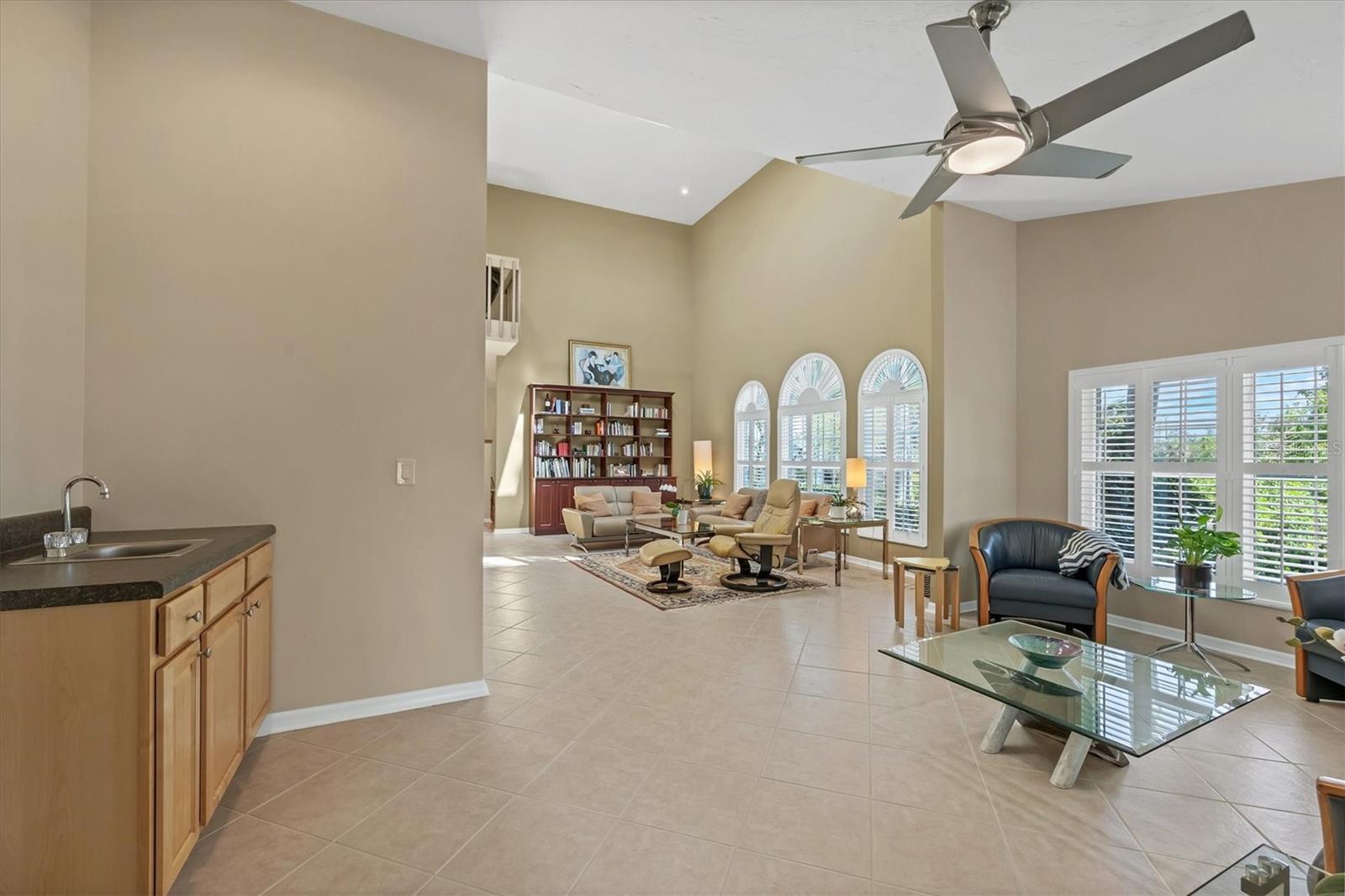 This elegant end-unit villa in the coveted Villa Palmeras section of Prestancia offers breathtaking golf course views and a maintenance-free lifestyle. Overlooking the 14th green and 15th fairway of the renowned TPC Stadium Course, this beautifully appointed residence spans 3,114 square feet of refined living space. A welcoming foyer leads into the expansive living room, where a soaring two-story ceiling, a large skylight, and plantation-shuttered windows create a bright and inviting atmosphere. The formal dining room, framed by three large windows, provides an elegant setting for entertaining. Designed for both style and functionality, the kitchen features upgraded wood cabinetry, stainless steel appliances, granite countertops, and a pantry cabinet, along with a casual dining area bathed in natural light. The primary suite serves as a serene retreat, complete with a vaulted ceiling, engineered hardwood flooring, walk-in closets, and French doors opening to the enclosed Florida room. The en-suite bath offers dual vanities, a walk-in shower, tile flooring, and a generous walk-in closet. Two well-appointed guest bedrooms provide spacious accommodation with plush natural carpet, engineered hardwood flooring and ample closet space, sharing a full bath with an expansive vanity, solid surface countertop, and a tub/shower combination. Upstairs, a versatile space can be used as a den or additional storage. A convenient powder room is located near the kitchen for easy access. Extending the home's living space, the air-conditioned Florida room offers panoramic golf course views and direct access to the spacious yard through a wall of sliders. Additional features include a two-car garage, a utility room, hurricane impact-rated windows and doors, plantation shutters, and tile and engineered hardwood throughout the main living areas. Villa Palmeras residents enjoy access to two community pools and a pool house with covered lounging and dining areas. Nestled within the prestigious, gated community of Prestancia, this villa offers optional TPC membership for golf and social activities. Ideally located minutes to The Legacy Trail, a short drive from Siesta Key Beach, downtown Sarasota, St. Armands Circle, and the picturesque barrier islands, this exceptional home blends luxury, convenience, and resort-style living.