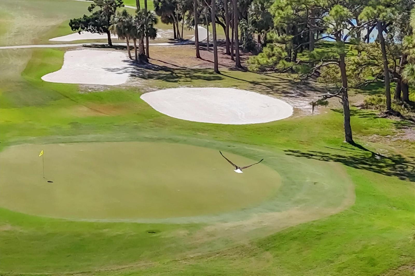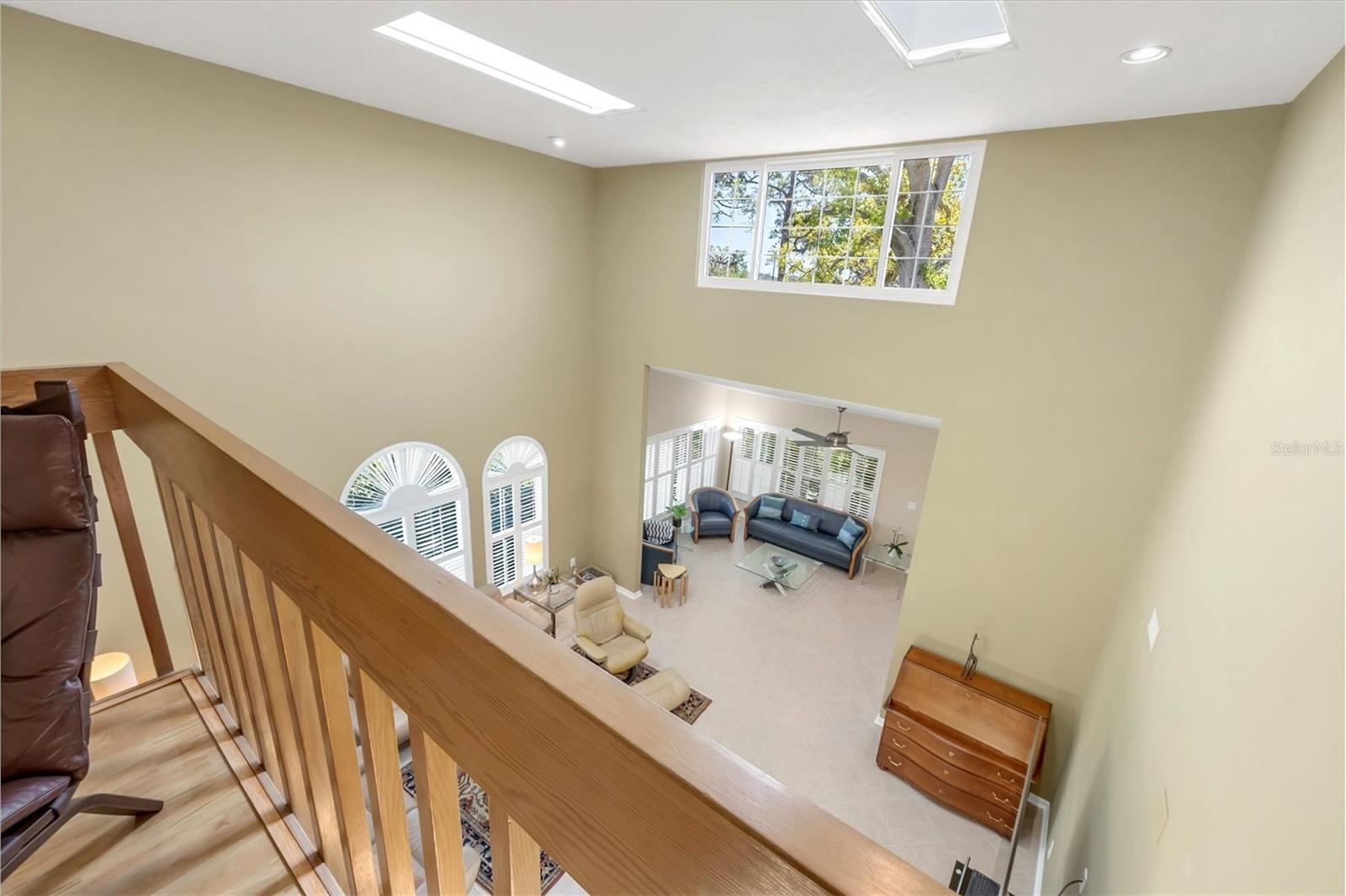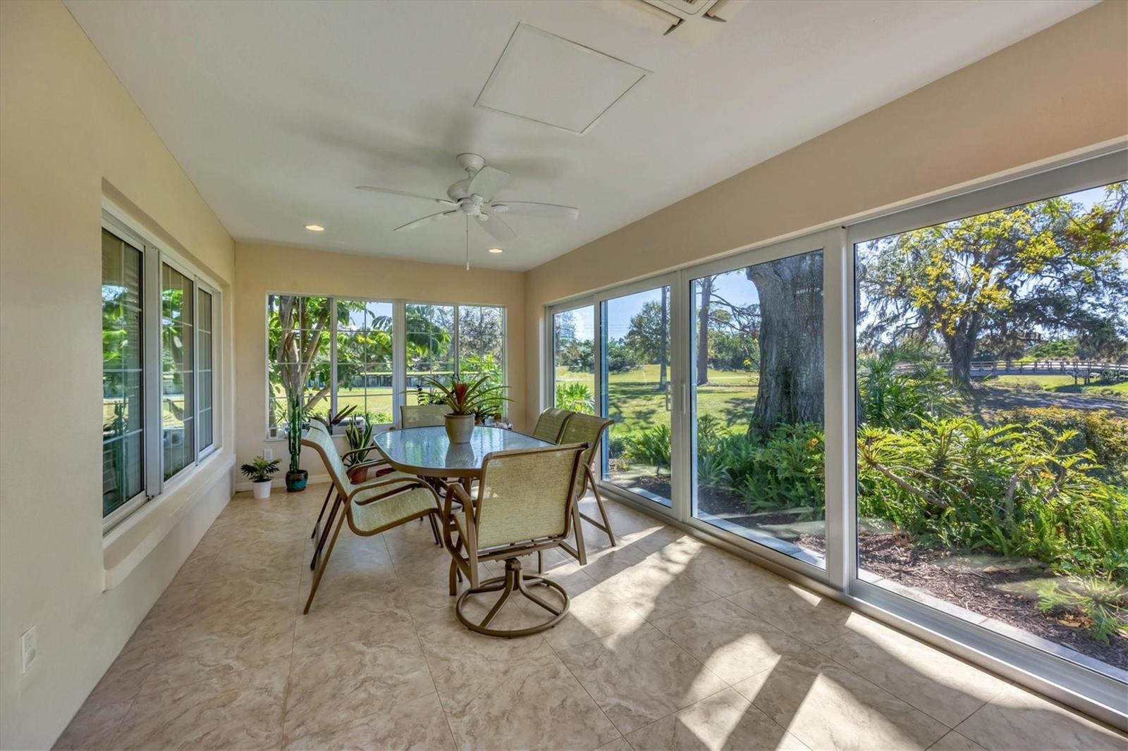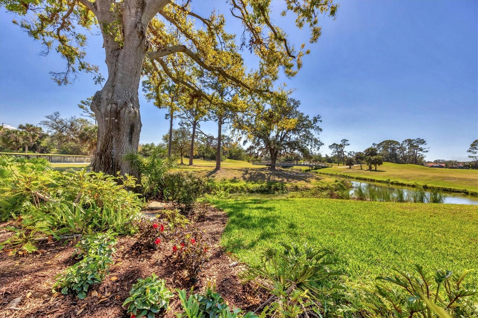 This elegant end-unit villa in the coveted Villa Palmeras section of Prestancia offers breathtaking golf course views and a maintenance-free lifestyle. Overlooking the 14th green and 15th fairway of the renowned TPC Stadium Course, this beautifully appointed residence spans 3,114 square feet of refined living space. A welcoming foyer leads into the expansive living room, where a soaring two-story ceiling, a large skylight, and plantation-shuttered windows create a bright and inviting atmosphere. The formal dining room, framed by three large windows, provides an elegant setting for entertaining. Designed for both style and functionality, the kitchen features upgraded wood cabinetry, stainless steel appliances, granite countertops, and a pantry cabinet, along with a casual dining area bathed in natural light. The primary suite serves as a serene retreat, complete with a vaulted ceiling, engineered hardwood flooring, walk-in closets, and French doors opening to the enclosed Florida room. The en-suite bath offers dual vanities, a walk-in shower, tile flooring, and a generous walk-in closet. Two well-appointed guest bedrooms provide spacious accommodation with plush natural carpet, engineered hardwood flooring and ample closet space, sharing a full bath with an expansive vanity, solid surface countertop, and a tub/shower combination. Upstairs, a versatile space can be used as a den or additional storage. A convenient powder room is located near the kitchen for easy access. Extending the home's living space, the air-conditioned Florida room offers panoramic golf course views and direct access to the spacious yard through a wall of sliders. Additional features include a two-car garage, a utility room, hurricane impact-rated windows and doors, plantation shutters, and tile and engineered hardwood throughout the main living areas. Villa Palmeras residents enjoy access to two community pools and a pool house with covered lounging and dining areas. Nestled within the prestigious, gated community of Prestancia, this villa offers optional TPC membership for golf and social activities. Ideally located minutes to The Legacy Trail, a short drive from Siesta Key Beach, downtown Sarasota, St. Armands Circle, and the picturesque barrier islands, this exceptional home blends luxury, convenience, and resort-style living.