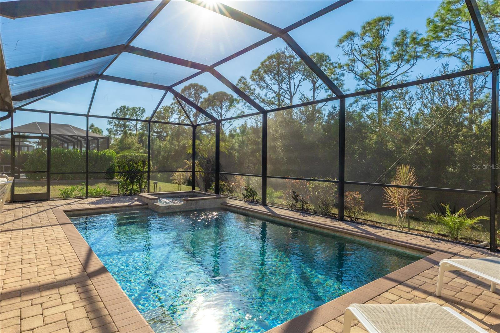 Experience the intelligent design of this highly desirable floorplan in the beautiful guard-gated community of Gran Paradiso. This exceptionally smart and functional 3-bedroom, 3-bathroom home places each bedroom in its own private corner of the house, creating three distinct suites--perfect for multi-generational living, guests, or a dedicated home office. Every bedroom enjoys direct access to its own full bathroom and features its own dedicated mini-split air conditioner in addition to the central system, providing personalized temperature control for ultimate comfort, all while maintaining an open, flowing great-room layout ideal for entertaining.Step inside to soaring ceilings, soft light-gray walls, and porcelain tile flooring throughout the entire home. The gourmet kitchen features crisp white shaker cabinetry, granite countertops, stainless steel appliances, a large center island with seating, and a stunning marble-look subway tile backsplash. Expansive sliding glass doors lead to the oversized screened lanai with a private saltwater pool featuring color-changing LED lighting, a brand-new variable-speed pump, and an inviting spillover spa--all framed by peaceful preserve views with no rear neighbors. Premium upgrades elevate daily living:, a whole-house water filtration system, instant hot water throughout the home, built-in accordion hurricane shutters, and a garage already wired for electric vehicle charging. The luxurious owner's retreat includes dual walk-in closets and a spa-inspired en-suite bath with separate vanities, granite counters, a deep soaking tub, and a frameless glass shower. Gran Paradiso's resort-style amenities--massive lagoon pool, clubhouse, fitness center, tennis, pickleball, and playground--are just steps away, with historic Venice Island, gulf beaches, and the vibrant new Wellen Park district only minutes from your door. Entertainment, dining, shopping, airports, beaches, culture, and social activities at your fingertips...this is thoughtful Florida living at its absolute best!