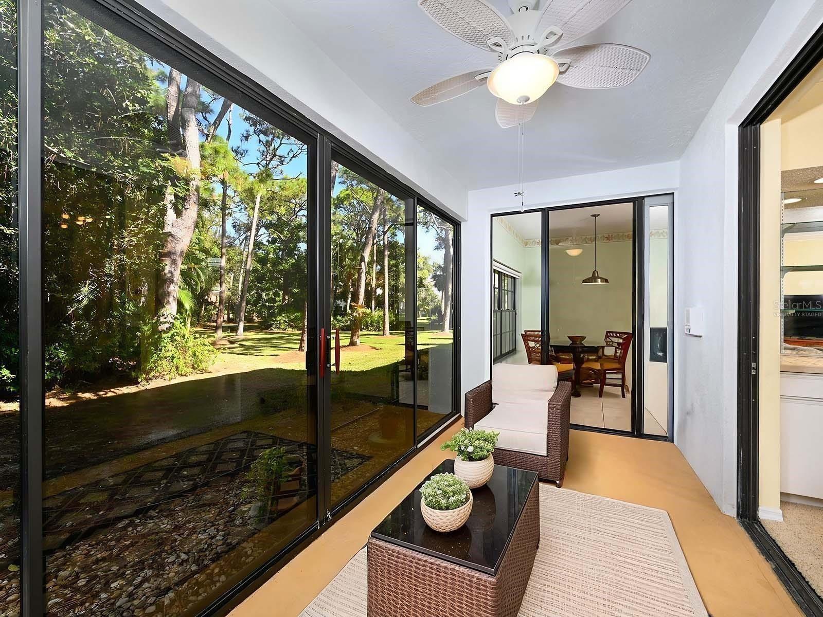 One or more photo(s) has been virtually staged. Experience the ultimate Florida lifestyle with this maintenance-free villa, nestled in a vibrant community designed for those who appreciate comfort and privacy. Welcome to this first-floor end unit, which offers a flexible layout that can easily accommodate dual primary suites, when needed. Boasting a total of three bedrooms and two bathrooms, enhanced with delightful features like a cozy fireplace, an elegant, mirrored bar, sophisticated crown moldings, stylish built-ins, pocket doors, gorgeous granite countertops, and quality cabinetry, along with track and recessed lighting. Wooded privacy can be seen through the sliding glass doors from the gracious formal living room. Formal dining is located between here and the kitchen, including a morning room. This inviting space showcases stunning maple cabinetry, sleek stainless-steel appliances, a lovely, tiled backsplash, a granite breakfast bar, and a convenient pantry, all highlighted by custom offset tile. It also leads through sliding glass doors to the private covered and screened lanai. Double doors at the front of the home provide a quiet area for a home office. This space has a built-in closet and features a pocket door to the secondary en suite, making it suitable as a bedroom or bonus area. A modern bathroom has an impressive walk-in shower with a glass door, contrasting granite countertops, and white raised-panel cabinetry, drop lighting, and tile floors. The Owner's Suite, the largest of all bedrooms, features a window seat overlooking private wooded views, two built-in closets, and a large walk-in closet in the personal bath. It includes a single vanity with a makeup table and dual sinks, a garden soaking tub, and a separate accessible shower. The interior is thoughtfully finished with a convenient laundry room and a door leading to the attached two-car garage. Located in Fairway Woods, a charming private community near Siesta Key Beach, which is known as one of the best beaches in the world. Surrounded by magnificent, mature trees, this area is a true gem that offers fantastic opportunities for boating, biking, and hiking. Golf enthusiasts will appreciate the nearby top-rated TPC golf course. Additionally, residents have convenient access to grocery stores, healthcare facilities, and the vibrant cultural scene in Downtown Sarasota. The association fee covers roof and exterior maintenance, enhancing homeowners' convenience. The community fosters a warm spirit and features amenities such as a heated pool, along with a variety of enrichment classes and social events. You can meander through the beautifully landscaped grounds and enjoy the peaceful conservation areas--making it a wonderful place to call home!