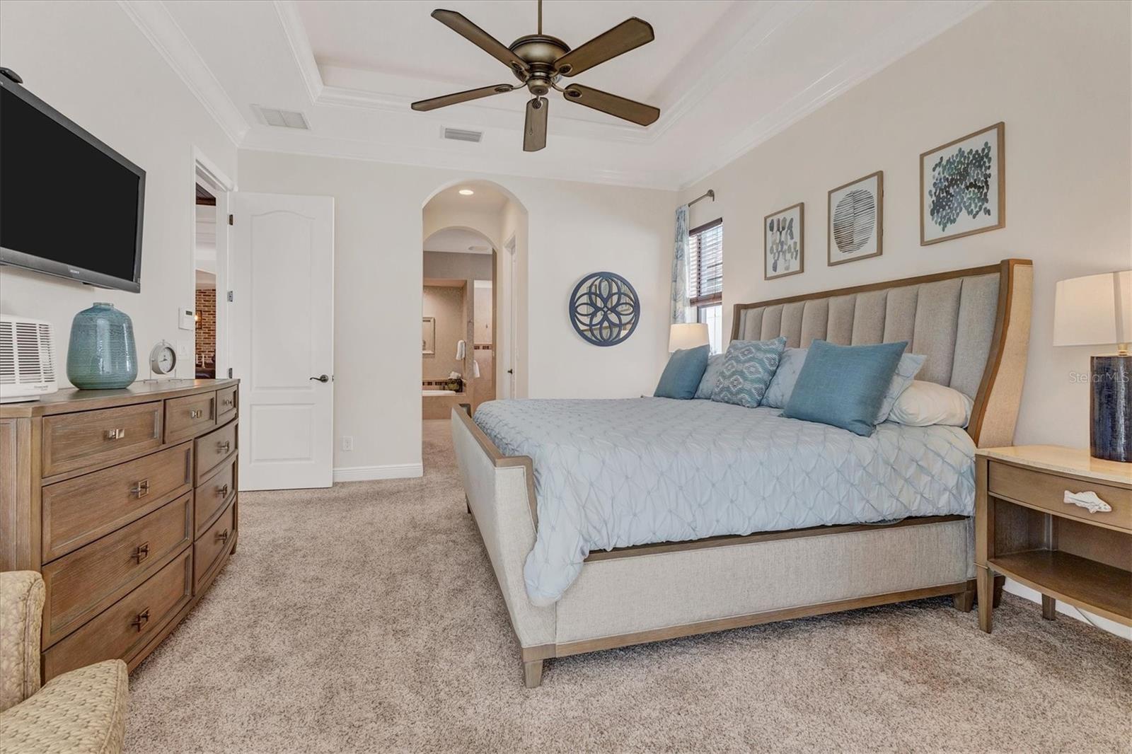 Welcome to this stunning former Lee Wetherington model home, with breathtaking views of a serene lake and lush golf course in Country Club East. This meticulously designed three-bedroom, two-bath home, complete with a den, offers the ideal balance of luxury, privacy and comfort. Decorative features like crown moldings, tasteful arches, neutral paint and subtle wallpaper finishes add elegance throughout. The large great room is an entertainer's dream, with a wood-inlaid tray ceiling, built-in shelving and a decorative brick wall finish that adds warmth and character. The great room opens directly to the expansive paver and brick lanai, which includes a saltwater pool and spa, ideal for relaxing or hosting guests while enjoying the stunning views. Directly off the great room is your kitchen with wood cabinetry, granite countertops, farm-style oversized sink, stainless steel appliances and eat-in dinette area with aquarium windows. The expansive primary suite, at the rear of the home, features a separate sitting area that overlooks the sparkling saltwater pool and spa. The suite also boasts three spacious walk-in closets and a luxurious en-suite bath with dual vanities, a soaking tub and a large walk-in shower. Two additional guest bedrooms at front of the home share a bath, ensuring privacy for all. The den, which features French doors, built-in shelving, and engineered hardwood floors, is ideal for a home office or library. The home also features a three-car garage with plentiful storage space, as well as energy-efficient upgrades, including Icynene attic insulation, Energy Star certification and Greenbuild Certification, all designed to lower utility costs while contributing to a more sustainable lifestyle. Additional highlights include hurricane-impact sliders and front door, hurricane shutters for other windows and a water softener system for enhanced water quality. Recent upgrades include new pool pump, air-conditioning open free flow system, hurricane impact front door, new electric hot water heater, and updated smoke and carbon monoxide detectors. Country Club East residents enjoy exclusive access to The Retreat, a neighborhood amenity center boasting a resort-style pool, fitness center and billiards room. Additionally, The Residents Club offers another pool, spa, and a volleyball court for residents to indulge in leisure and recreation. For those seeking even more recreational options, just a few streets away lies the Lakewood Ranch Golf & Country Club, featuring 54 holes of golf, 20 Har-Tru tennis courts, multiple pools, and The Lodge bar and restaurant. Residents have the option to avail themselves of these facilities through various membership packages. This home is districted for top A-rated schools and only walking distance to Willis Elementary School and the beautiful Country Club Park, offering both exceptional education and abundant recreation. Discover this gem in Lakewood Ranch, America's top best-selling, planned multigenerational community.