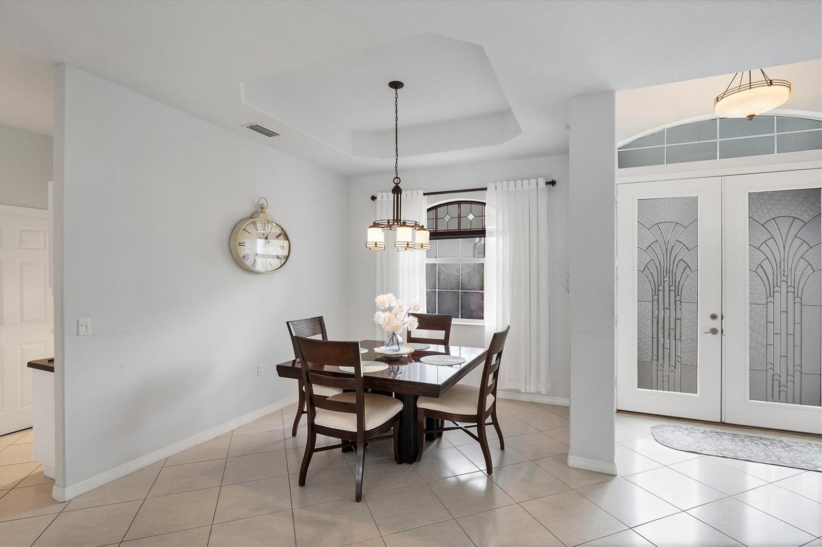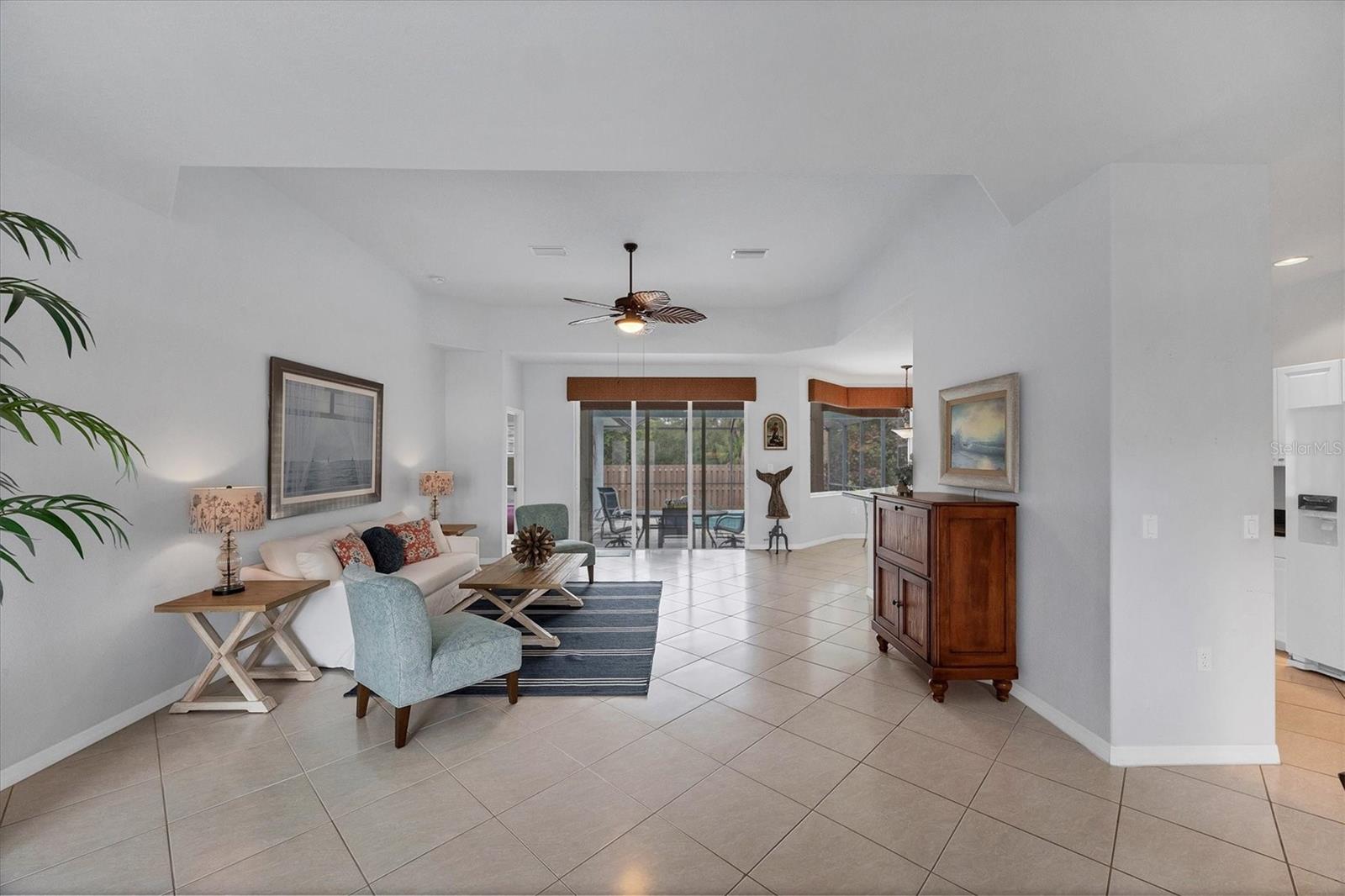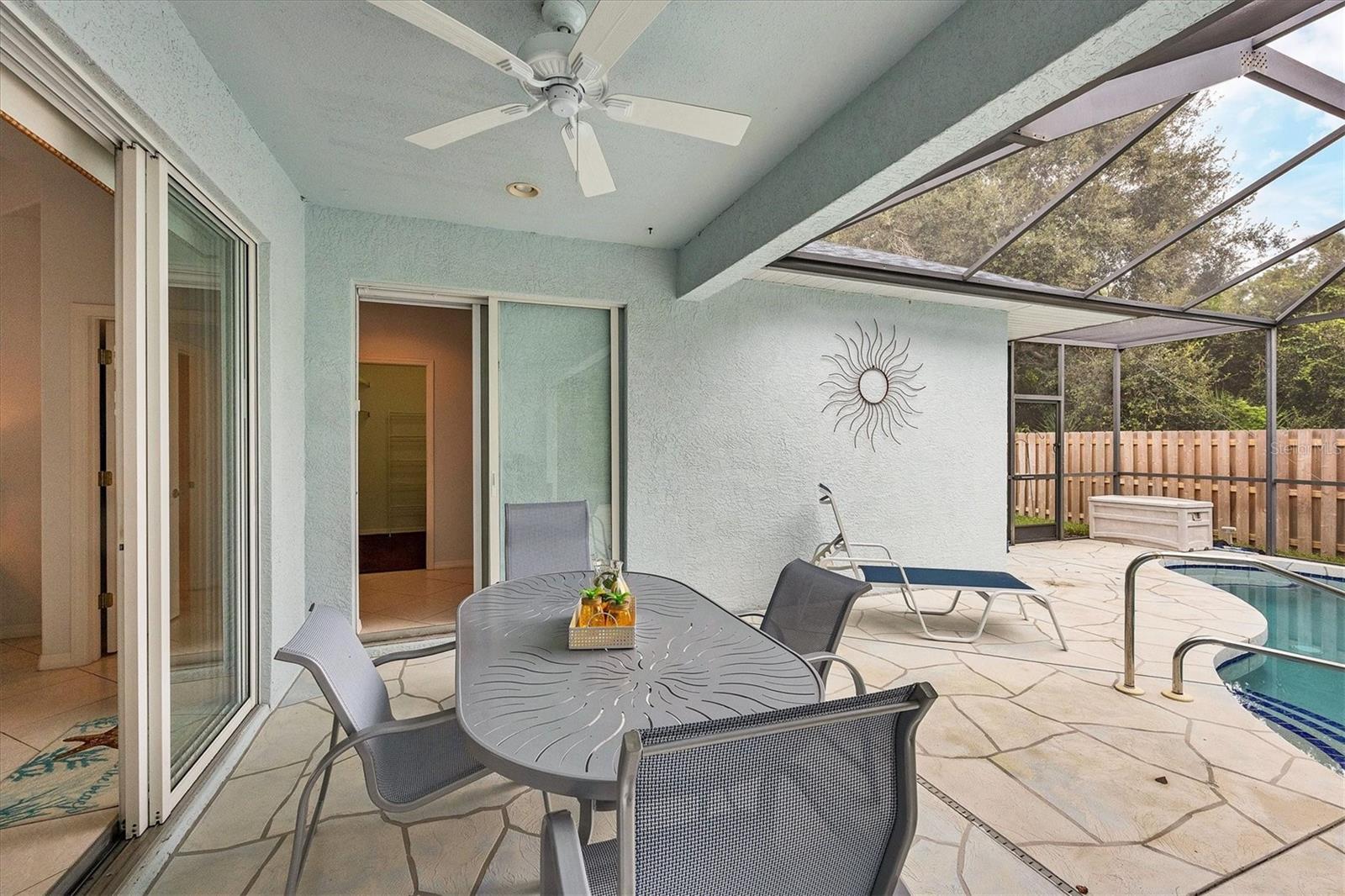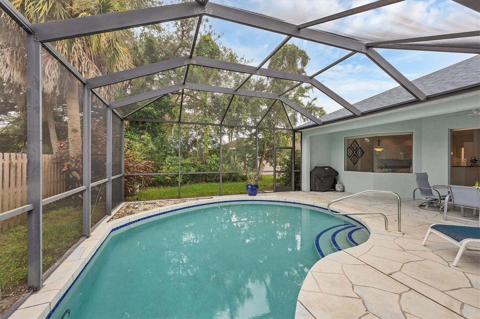 One or more photo(s) has been virtually staged. Relax, entertain, and enjoy it all! This 3-bedroom, 2-bath pool home is beautifully designed and ready to fit your lifestyle offering the perfect balance of indoor and outdoor living. From the charming front porch and double-door entry, step inside to a spacious open-concept layout with volume ceilings, abundant natural light, and a thoughtful split-bedroom design. The living room flows seamlessly to the lanai through oversized sliders, while the formal dining room boasts a tray ceiling that adds elegance to every gathering. The kitchen is a true centerpiece, featuring a breakfast bar, a built-in desk, a large pantry, and a breakfast nook framed by an aquarium window overlooking the sparkling pool. Ceramic tile flooring extends through the main living areas for easy maintenance and timeless appeal. The primary suite offers a generous 19x14 bedroom with tray ceiling, walk-in closet, and a spacious bath with dual sinks, a walk-in shower, and private slider access to the pool. Guests will enjoy their own wing with two additional bedrooms and a full bath, ensuring comfort and privacy. Beyond the living spaces you'll appreciate the large laundry room with storage and folding counter, plus an oversized 2+ car garage with a dedicated 13x10 workshop/storage area, pull-down attic stairs, and drop-down shelving. Step outside to your private backyard oasis, complete with a screened lanai and a sparkling pool. It's the perfect area for lounging or entertaining. The fenced yard provides peace of mind and added privacy. Recent updates add confidence with a brand-new roof (June 2025), new pool pump, 2024 hot water heater, and 2024 pool cage screens. Low HOA fee of just $889 per year (covering irrigation) and no CDD fee make this home affordable and stress-free. All of this in a prime Venice location, just minutes from Downtown Venice, Gulf beaches, golf courses, shopping, dining, and entertainment. Plus, it's not located in a flood zone. This home checks every box: style, space, updates, and location. Don't miss the opportunity to make it yours!