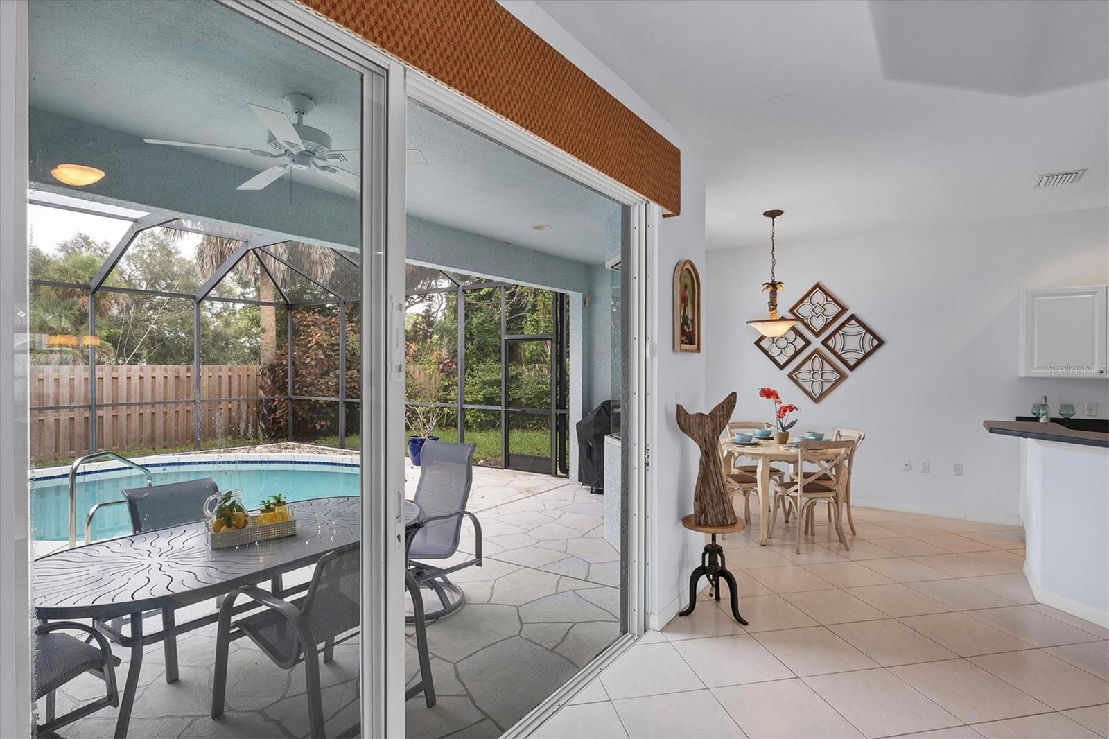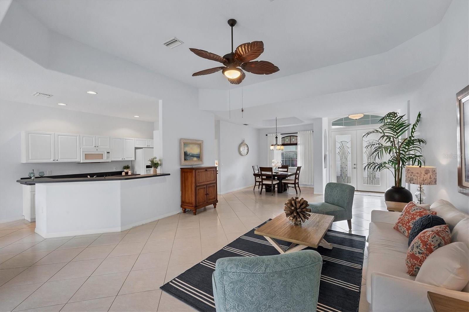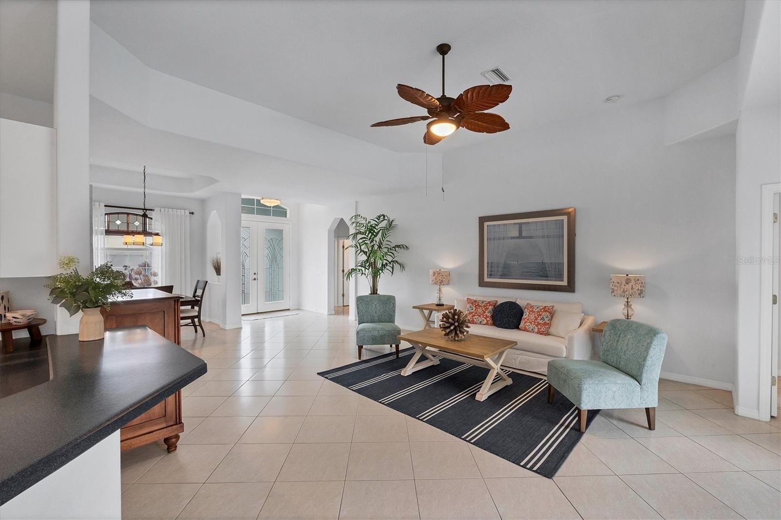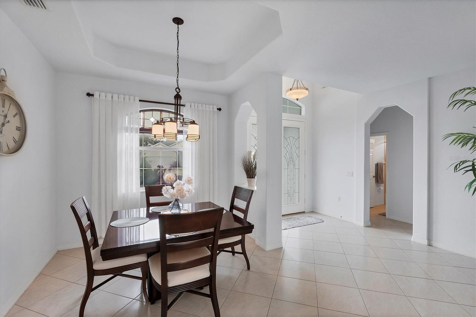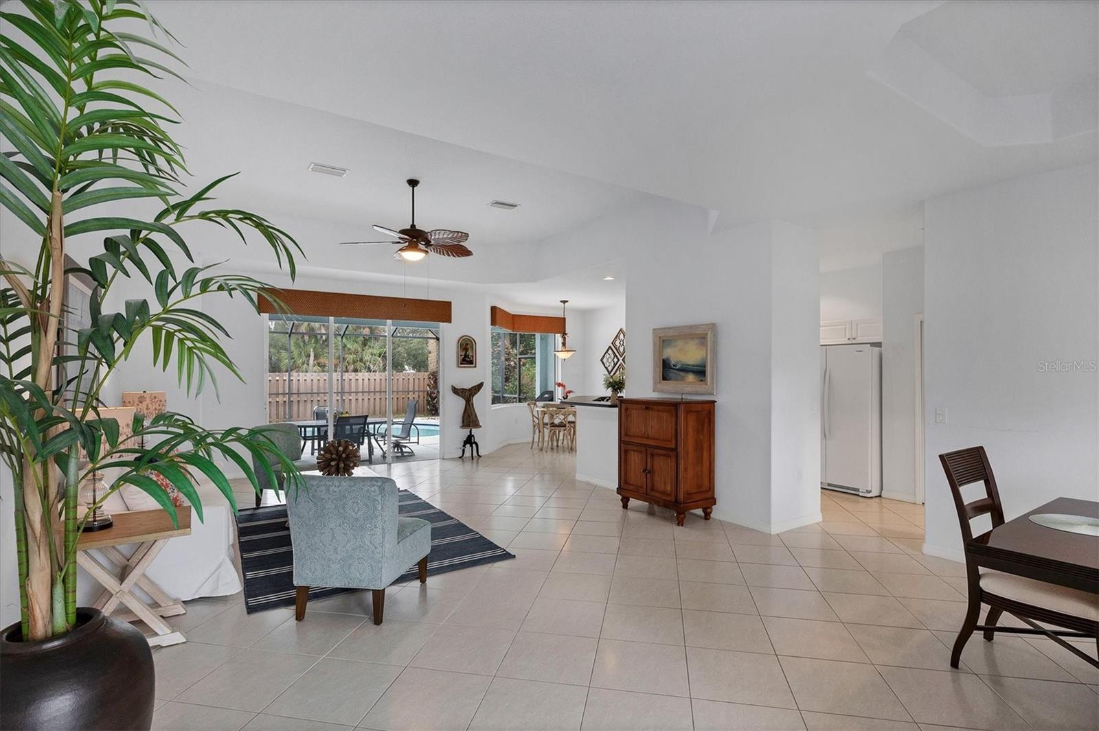 One or more photo(s) has been virtually staged. Relax, entertain, and enjoy it all! This 3-bedroom, 2-bath pool home is beautifully designed and ready to fit your lifestyle offering the perfect balance of indoor and outdoor living. From the charming front porch and double-door entry, step inside to a spacious open-concept layout with volume ceilings, abundant natural light, and a thoughtful split-bedroom design. The living room flows seamlessly to the lanai through oversized sliders, while the formal dining room boasts a tray ceiling that adds elegance to every gathering. The kitchen is a true centerpiece, featuring a breakfast bar, a built-in desk, a large pantry, and a breakfast nook framed by an aquarium window overlooking the sparkling pool. Ceramic tile flooring extends through the main living areas for easy maintenance and timeless appeal. The primary suite offers a generous 19x14 bedroom with tray ceiling, walk-in closet, and a spacious bath with dual sinks, a walk-in shower, and private slider access to the pool. Guests will enjoy their own wing with two additional bedrooms and a full bath, ensuring comfort and privacy. Beyond the living spaces you'll appreciate the large laundry room with storage and folding counter, plus an oversized 2+ car garage with a dedicated 13x10 workshop/storage area, pull-down attic stairs, and drop-down shelving. Step outside to your private backyard oasis, complete with a screened lanai and a sparkling pool. It's the perfect area for lounging or entertaining. The fenced yard provides peace of mind and added privacy. Recent updates add confidence with a brand-new roof (June 2025), new pool pump, 2024 hot water heater, and 2024 pool cage screens. Low HOA fee of just $889 per year (covering irrigation) and no CDD fee make this home affordable and stress-free. All of this in a prime Venice location, just minutes from Downtown Venice, Gulf beaches, golf courses, shopping, dining, and entertainment. Plus, it's not located in a flood zone. This home checks every box: style, space, updates, and location. Don't miss the opportunity to make it yours!