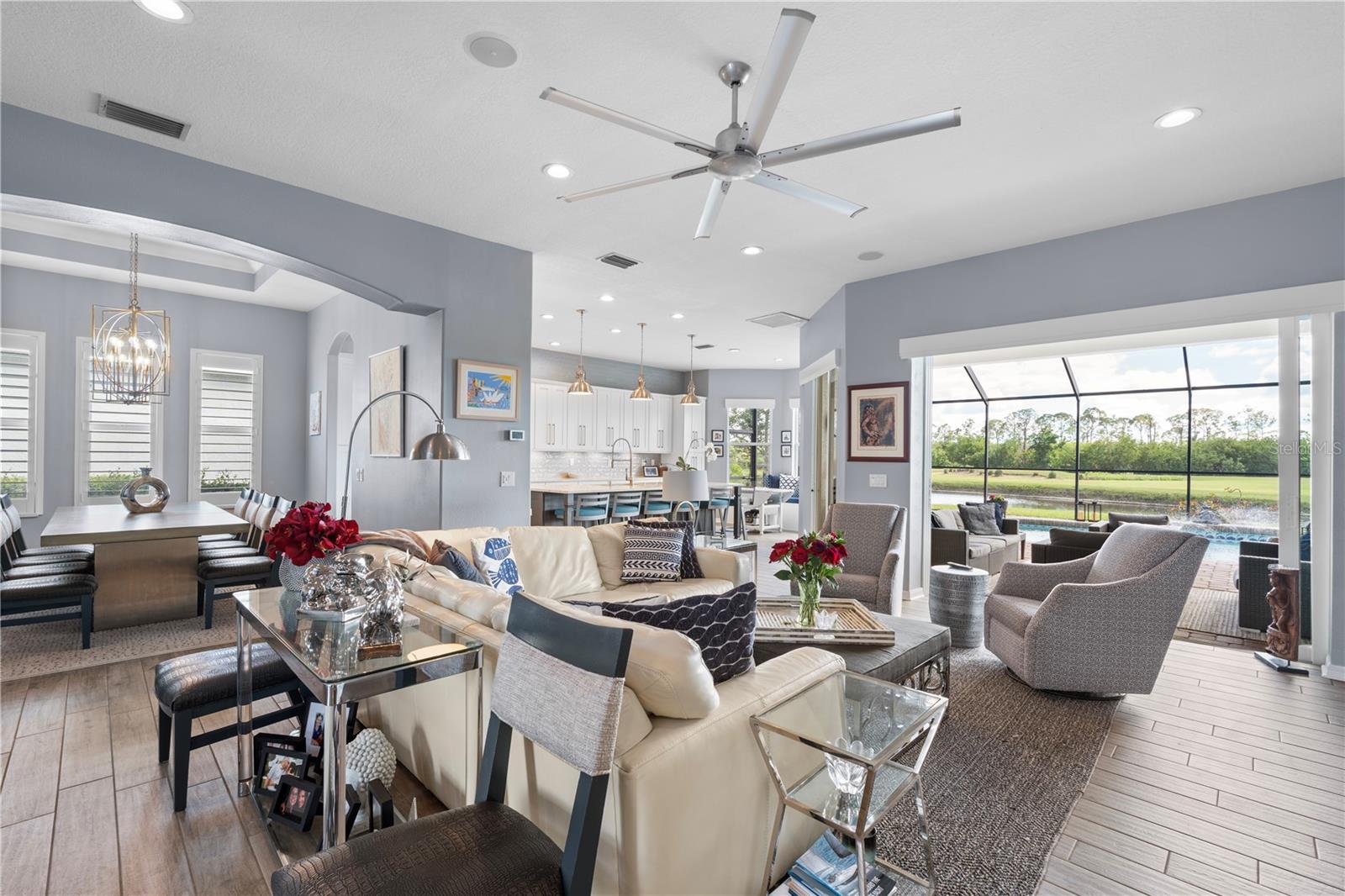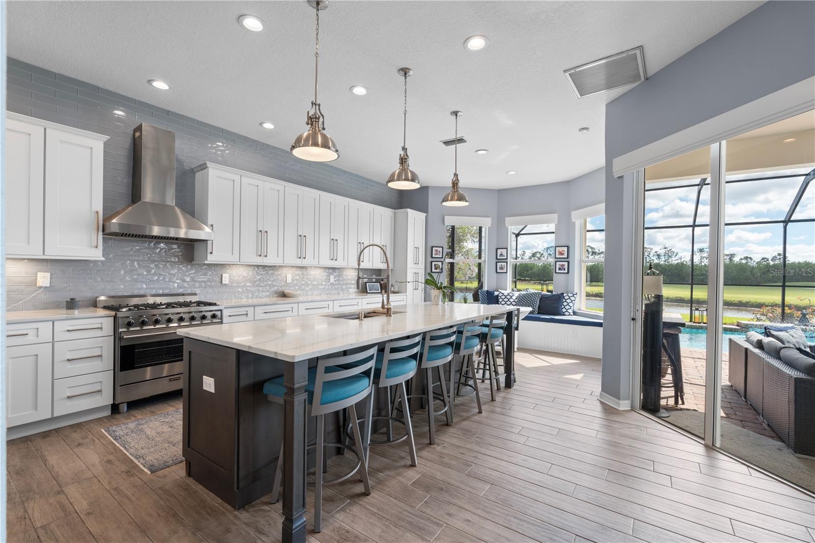 Come and enjoy luxury living at 5241 Grand Palmetto Way! This well-appointed POOL HOME is located on a premium lot in Heron Creek's Quail Run. Positioned perfectly on the 8th hole of the Creek 9, the backyard offers 80 FEET OF SERENE WATERFRONTAGE and an unobstructed 180 panorama of the nearly 2-acre POND and peaceful NATURAL MARSH PRESERVE. This spacious home features 4 bedrooms (including a lower-level master suite), an office, and 3 bathrooms, providing over 3,100 sq.ft. of living space--ideal for those needing the extra room! The expansive 1,200+ sq.ft. caged pool area, along with TWO SEPERATE GARAGES adjacent to the private front entrance courtyard and terrace, offers ample space for outdoor enjoyment. Recent upgrades include a NEWER STONE COATED METAL ROOF with a barrel tile appearance (installed in February 2024) and a FULLY REMODELED KITCHEN with SOLID WOOD CABINETRY, 42" uppers, frosted glass SUBWAY TILE backsplash, and QUARTZ countertops. The kitchen also boasts NEWER APPLIANCES including a stainless-steel hood vent, a 6-top commercial-grade gas range, and an oversized side-by-side refrigerator/freezer. A window seat with storage and beadboard accents beneath the back bay window provides a cozy spot for morning coffee and casual conversations. Additional enhancements include PLANTATION SHUTTERS, custom-built wall shelving, NEW PLANK TILE FLOORING throughout the ground floor, and freshly painted interiors. The hurricane-grade/impact slider to the pool area "pockets" out of sight. The smaller garage includes a PRX gym system, while the larger garage houses whole-home surge protection and overhead hanging storage. Both garages have been updated with hurricane-grade doors, and recent installations include a gas hot water heater along with three newer A/C systems. The rear patio has been remodeled with a BRICK PAVED overlay, and the SPARKELING POOL has been converted to a SALT-BASED SYSTEM. The newer POOL HEATER and a reinforced, repainted, and rescreened enclosure complete the outdoor upgrades. Heron Creek is a 676-acre, 27-hole country club community with over 430 acres dedicated to golf courses and permanent nature preserves. Designed by renowned golf course architect Arthur Hills, the community offers residents a natural habitat for a variety of birds and wildlife. The 21,000 sq.ft. main clubhouse features the formal Top of the Green Main Dining Room, the casual Heron's Roost Grille Room, the Golf Pro Shop, meeting rooms, and administrative offices. The clubhouse complex also includes a state-of-the-art fitness center with saunas and locker rooms, five lighted Har-Tru tennis courts, the Tennis Pro Shop, and a resort-style swimming pool with a sun deck and spa.