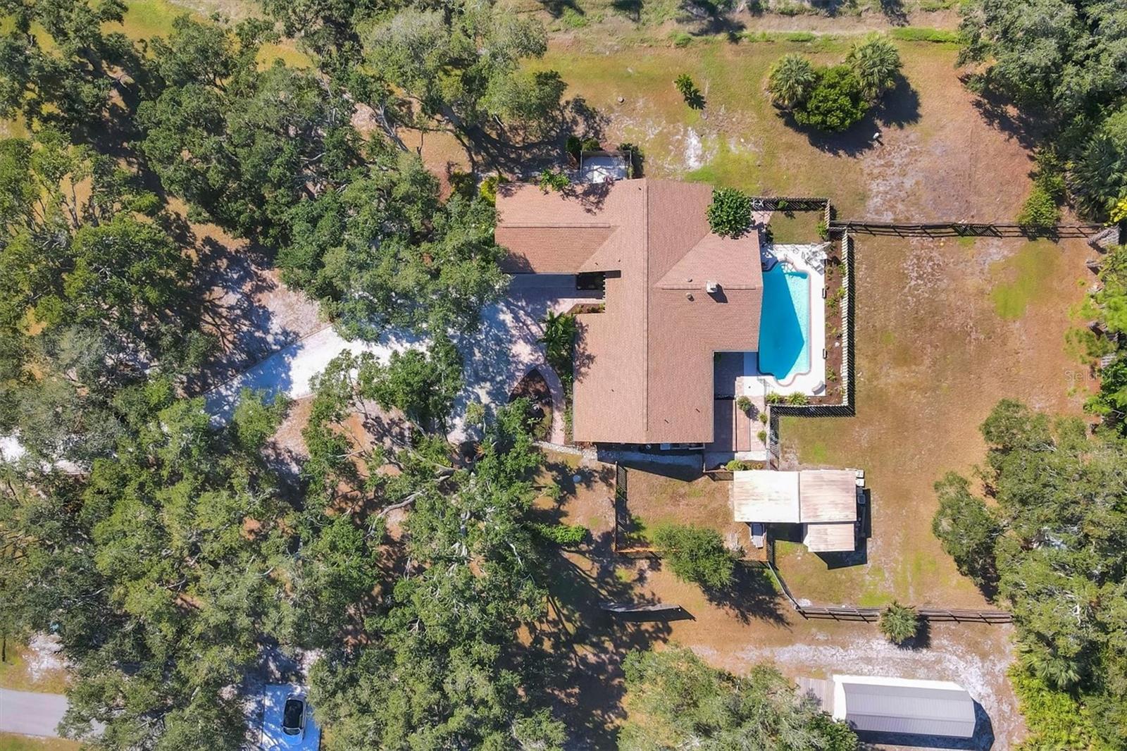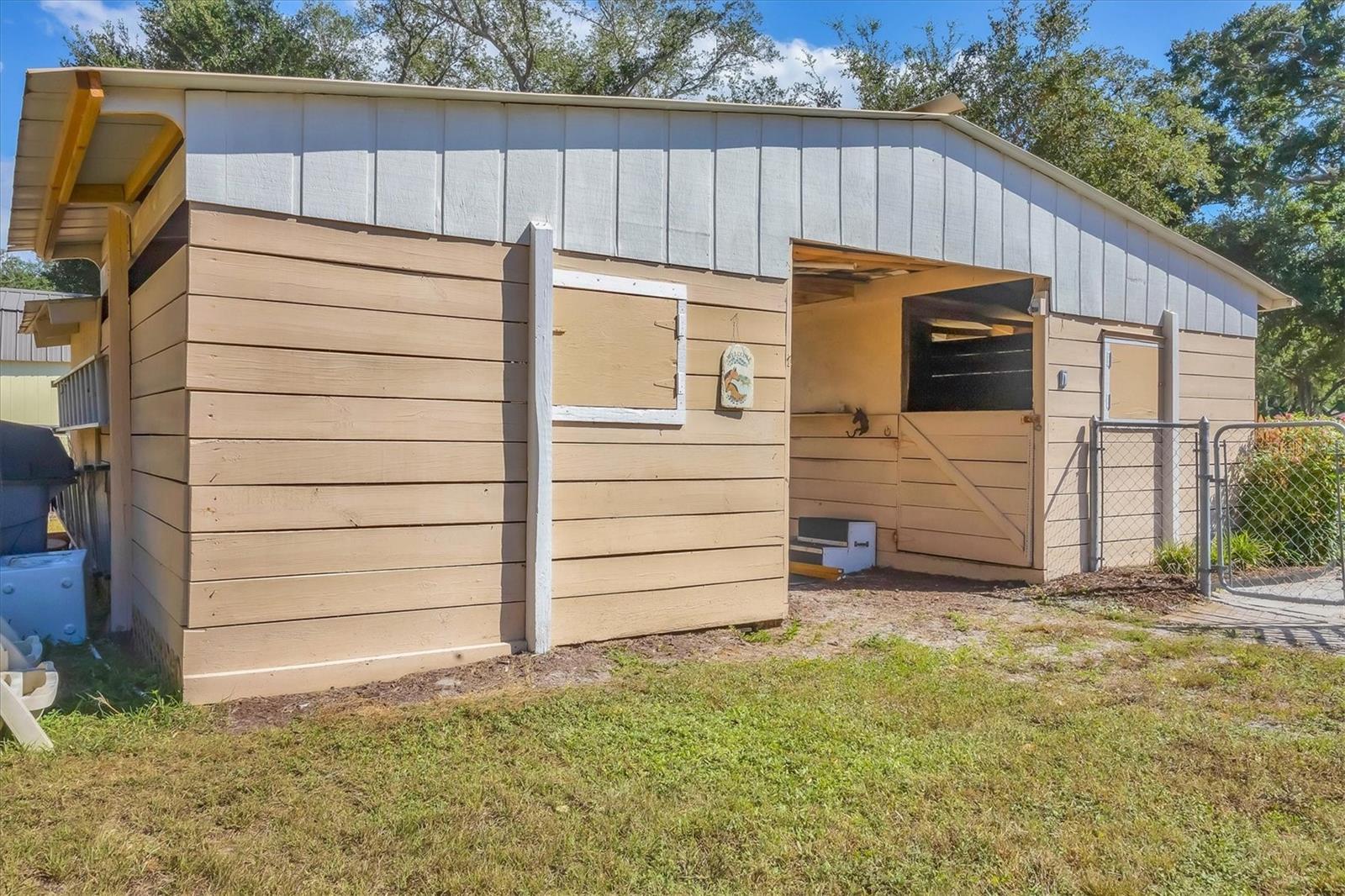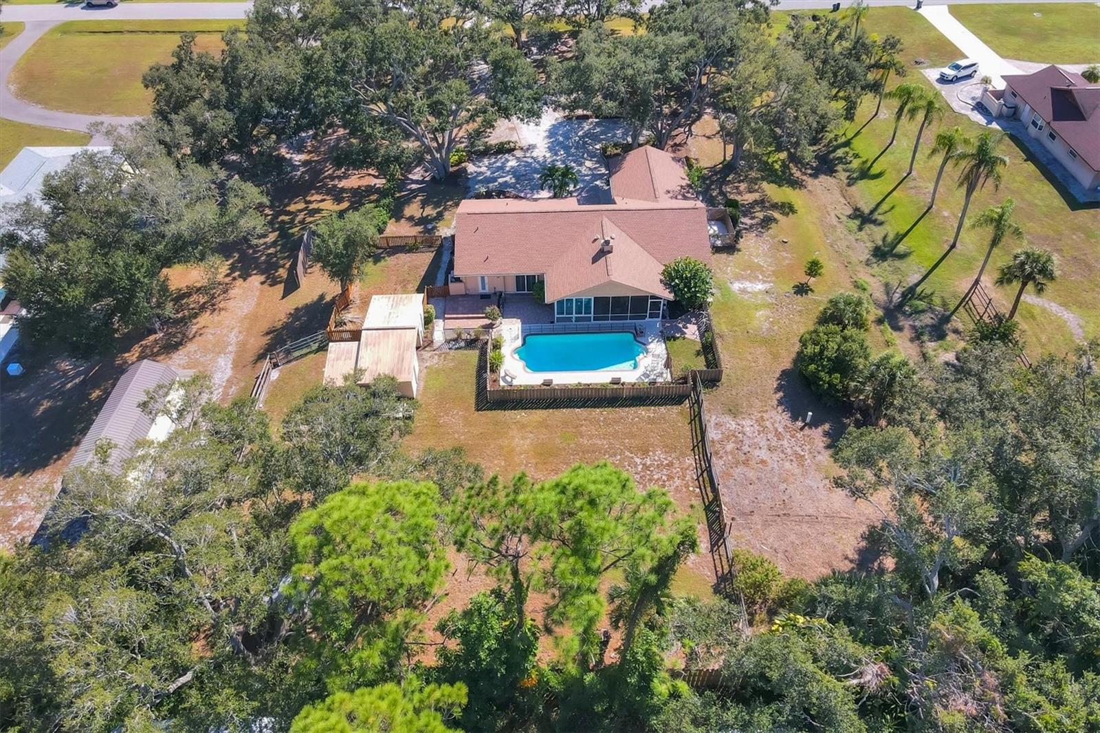 One or more photo(s) has been virtually staged. This stunning ranch-style home, set back on over 1.3 acres in the highly sought-after neighborhood of Venice Acres, is perfect for families and pet lovers alike. The property is fenced and ready for you to move in with all your toys and even your horses, and is excellent for nature lovers! The exterior of the home is beautifully landscaped with mature trees, bright flower beds, and a paver brick entry. The roof was replaced in 2023, and the A/C is newer; most windows have hurricane impact for added peace of mind. The kitchen features granite counters with a brand-new quartz counter on the island, a large walk-in pantry, a breakfast nook, and French doors leading to a cozy paver patio. Step inside to a sunken living room with stunning beamed cathedral ceilings and a wood-burning fireplace. French doors open to a glassed-in sunroom and a screened lanai overlooking the sparkling pool, and a fenced pasture leads to a 2-stall barn with a tack room. The home also features a separate dining room, three bedrooms, two bathrooms, a two-car garage, and a laundry room with ample storage space. Updates include new luxury vinyl plank flooring and Travertine, a marble entryway, light fixtures, a new vanity in the guest bath, and countertops in the master bath. The master suite boasts a walk-in closet and plenty of space for relaxation. Great location is close to Beaches, Restaurants, Shopping, Wellen Park, and Hospitals. Please schedule your appointment today to view this beautiful home surrounded by nature and make it your own!