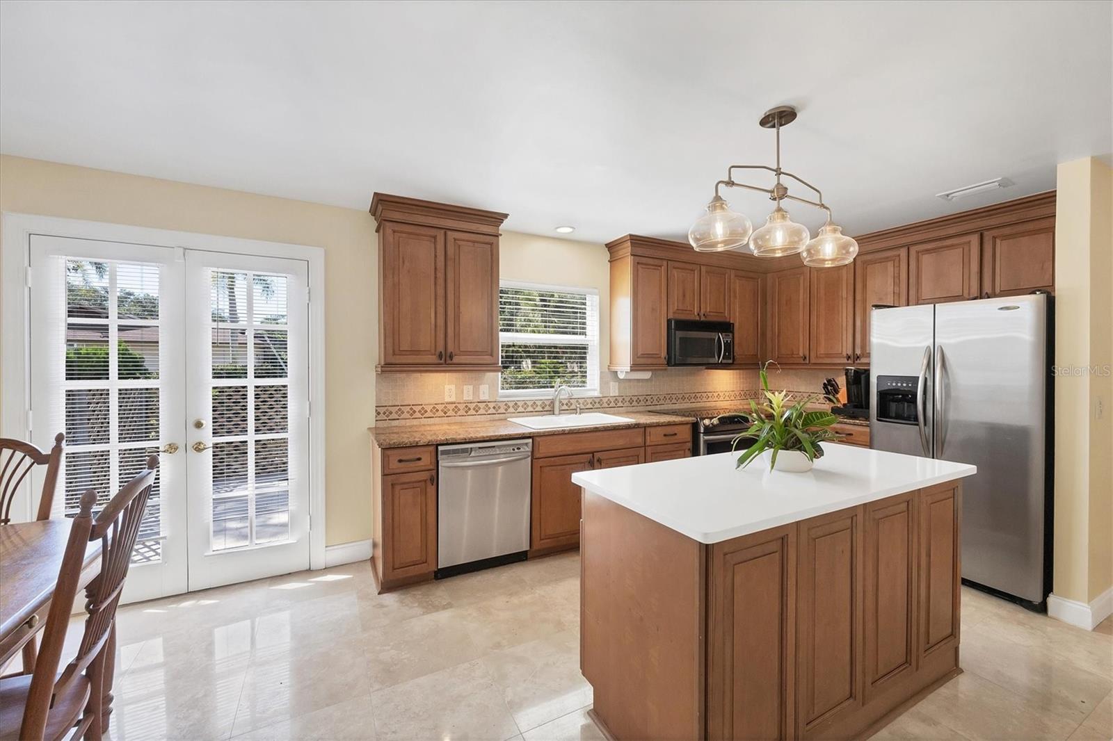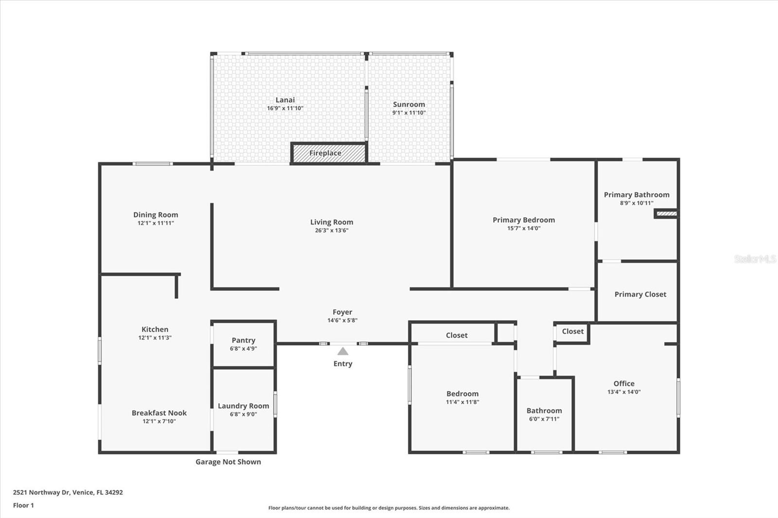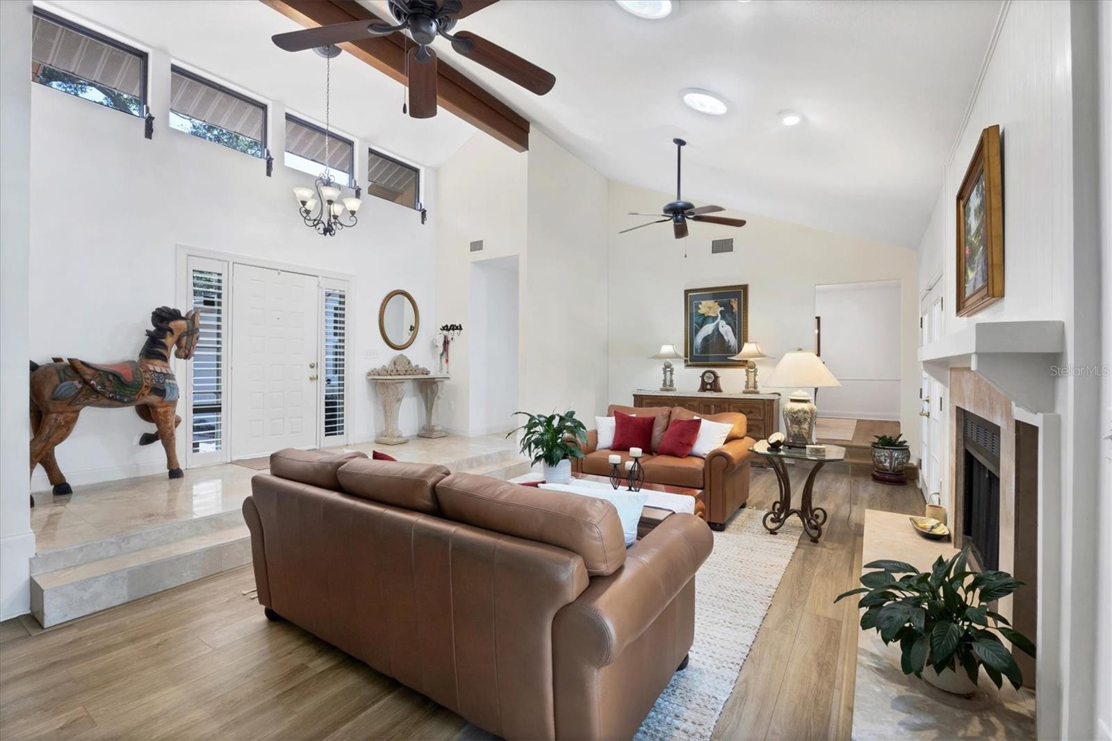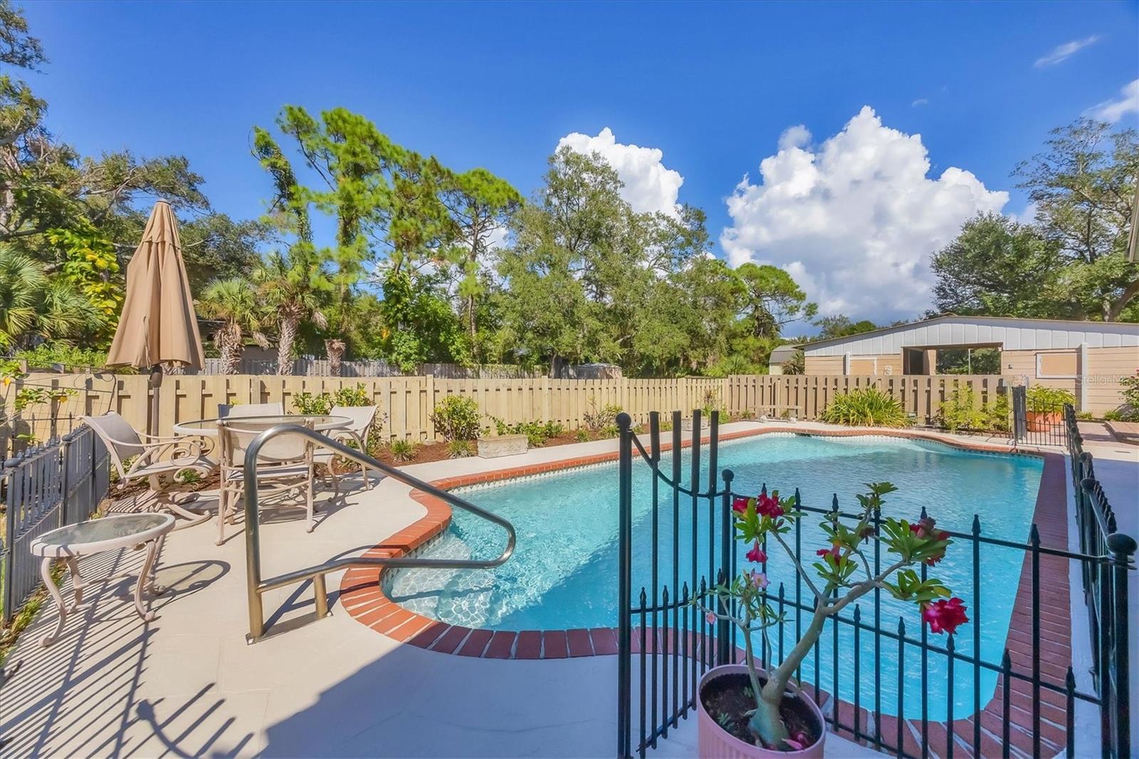 One or more photo(s) has been virtually staged. This stunning ranch-style home, set back on over 1.3 acres in the highly sought-after neighborhood of Venice Acres, is perfect for families and pet lovers alike. The property is fenced and ready for you to move in with all your toys and even your horses, and is excellent for nature lovers! The exterior of the home is beautifully landscaped with mature trees, bright flower beds, and a paver brick entry. The roof was replaced in 2023, and the A/C is newer; most windows have hurricane impact for added peace of mind. The kitchen features granite counters with a brand-new quartz counter on the island, a large walk-in pantry, a breakfast nook, and French doors leading to a cozy paver patio. Step inside to a sunken living room with stunning beamed cathedral ceilings and a wood-burning fireplace. French doors open to a glassed-in sunroom and a screened lanai overlooking the sparkling pool, and a fenced pasture leads to a 2-stall barn with a tack room. The home also features a separate dining room, three bedrooms, two bathrooms, a two-car garage, and a laundry room with ample storage space. Updates include new luxury vinyl plank flooring and Travertine, a marble entryway, light fixtures, a new vanity in the guest bath, and countertops in the master bath. The master suite boasts a walk-in closet and plenty of space for relaxation. Great location is close to Beaches, Restaurants, Shopping, Wellen Park, and Hospitals. Please schedule your appointment today to view this beautiful home surrounded by nature and make it your own!